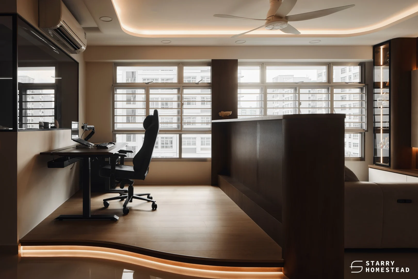 In Acacia Breeze @ Yishun, a sculptural wooden partition separates the home office from the sitting area, defining zones without compromising openness. Crafted in rich dark wood, the divider balances privacy and visual flow.