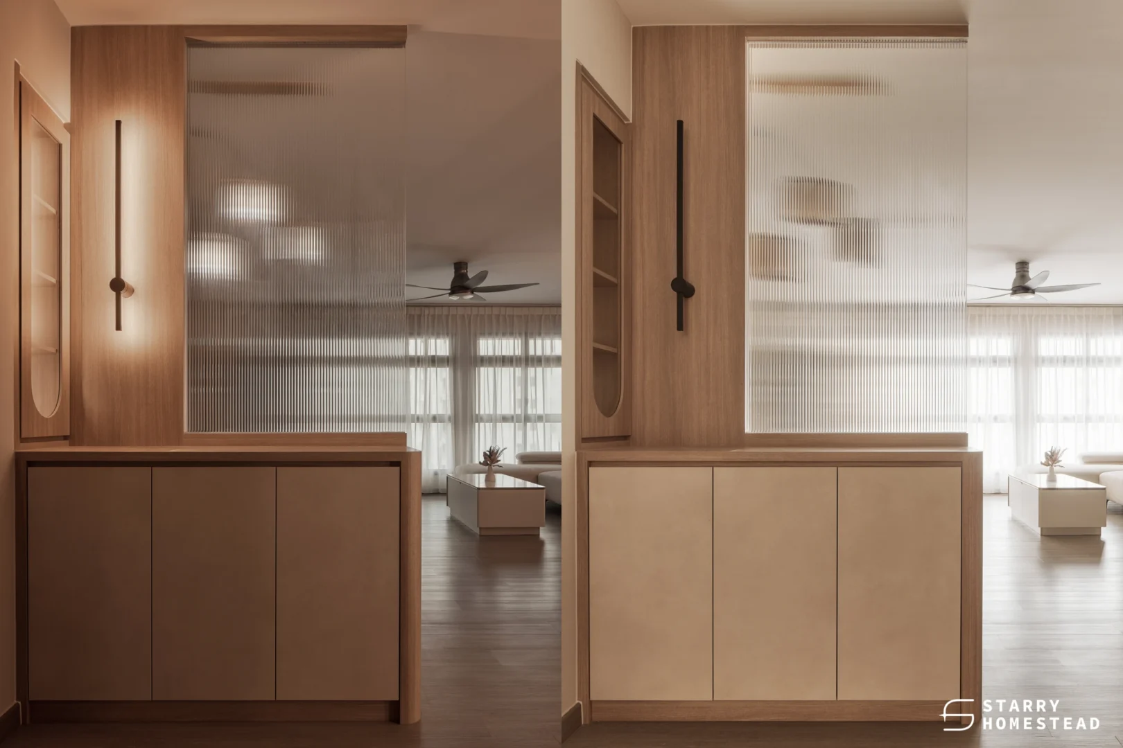 In Parc Clover @ Tengah, a Muji-inspired home, a foyer screen divides the entry from the main living area while maintaining openness. Alongside a bespoke display cabinet, the divider enhances functionality and flow, creating defined zones that blend seamlessly with the space’s aesthetic.