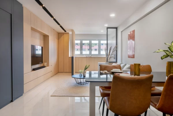 Sometimes style doesn’t necessary define by art, but it’s about the way to cater our needs. Here’s an example in this HDB 4 Bedroom locate in Bukit Batok. Simple white wood flooring and neutral palette wall has permeated the house with Scandinavian style. To reach owner’s request for dining area – allow to have quick casual meals and a space for friend’s gathering in same space, therefore customize bar counter was design beside dining table. To better serve its purpose, the counter also added in storage space for their snack and other food item.