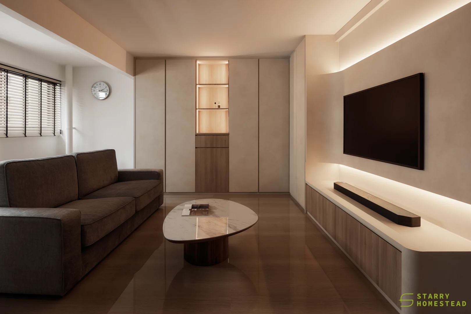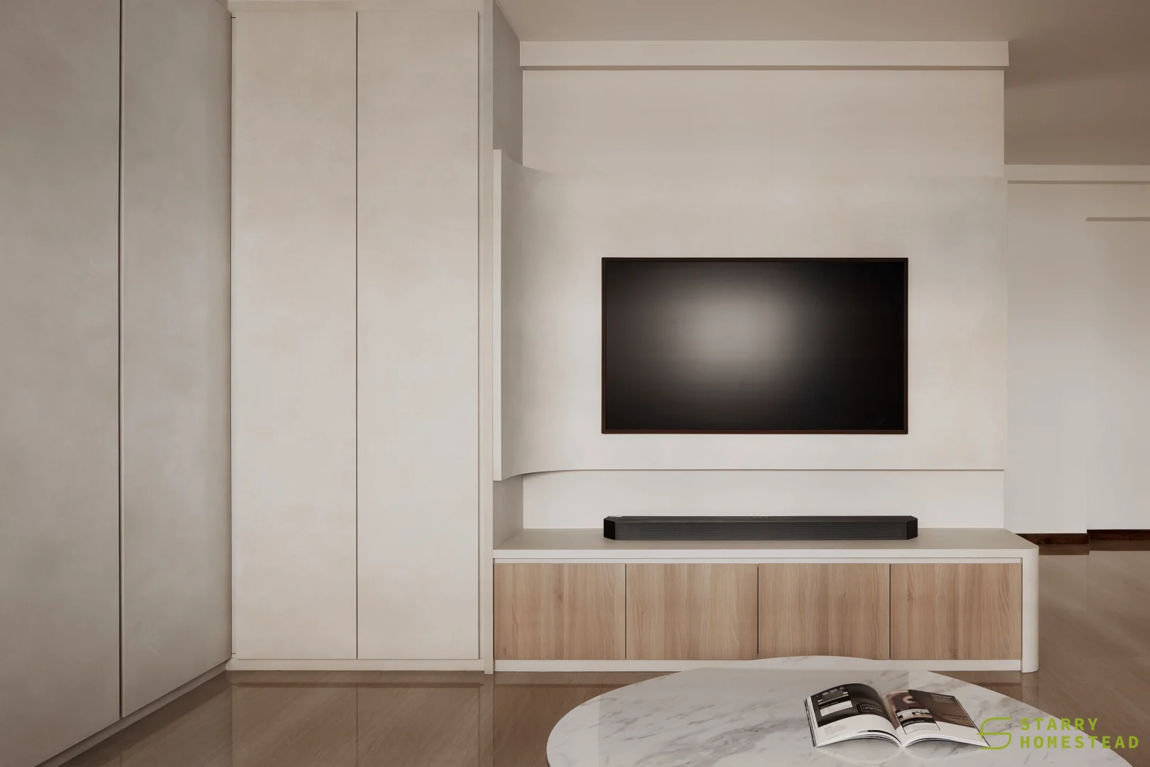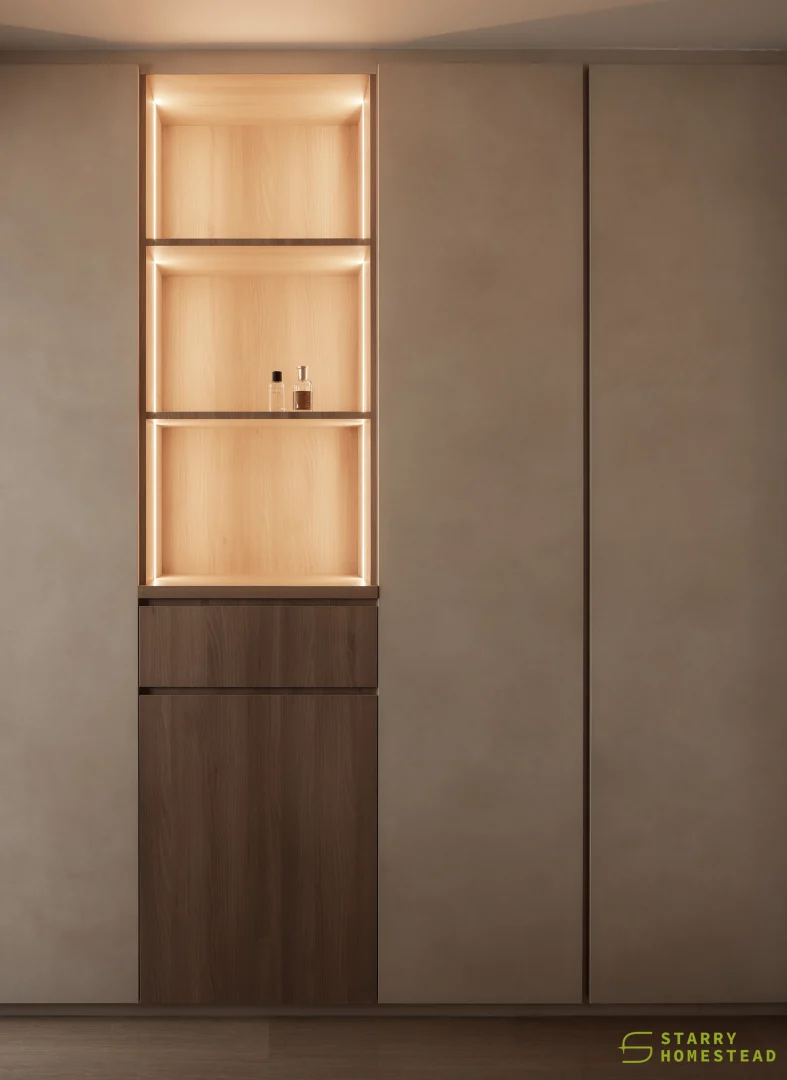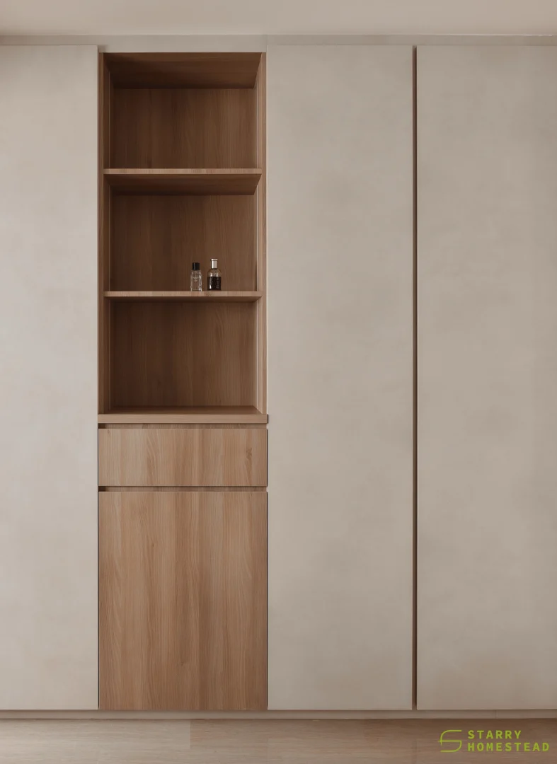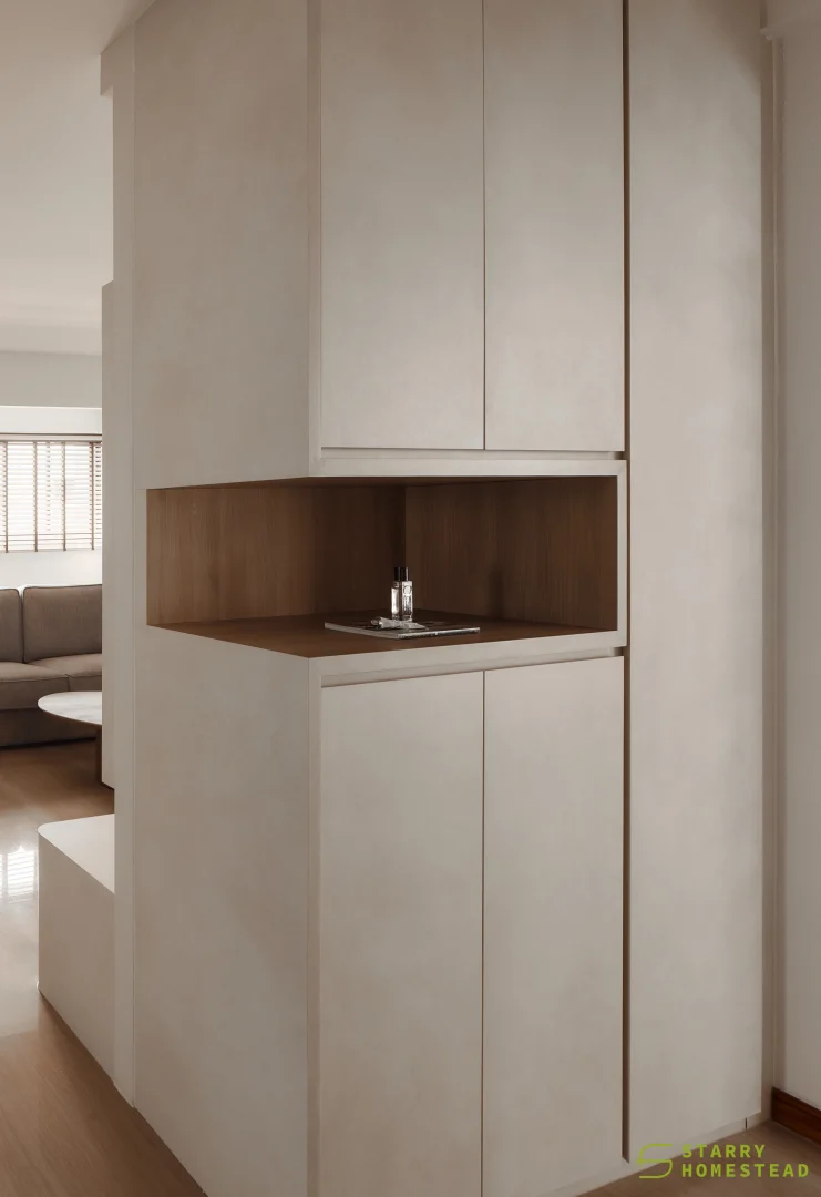 Simplicity, comfort, and practicality form the foundation of the design, allowing each element to serve a clear purpose within an uncluttered space. Soft neutral tonesโbeige, nude, grey, and warm whiteโcreate a gentle backdrop that feels calm and welcoming. Natural textures like wood and linen introduce quiet contrast, adding depth while keeping the palette soothing and cohesive. Every detail is considered, contributing to a sense of balance without overwhelming the interior. Thoughtfully placed lighting softens the atmosphere, shaping a relaxed and inviting setting for everyday living.