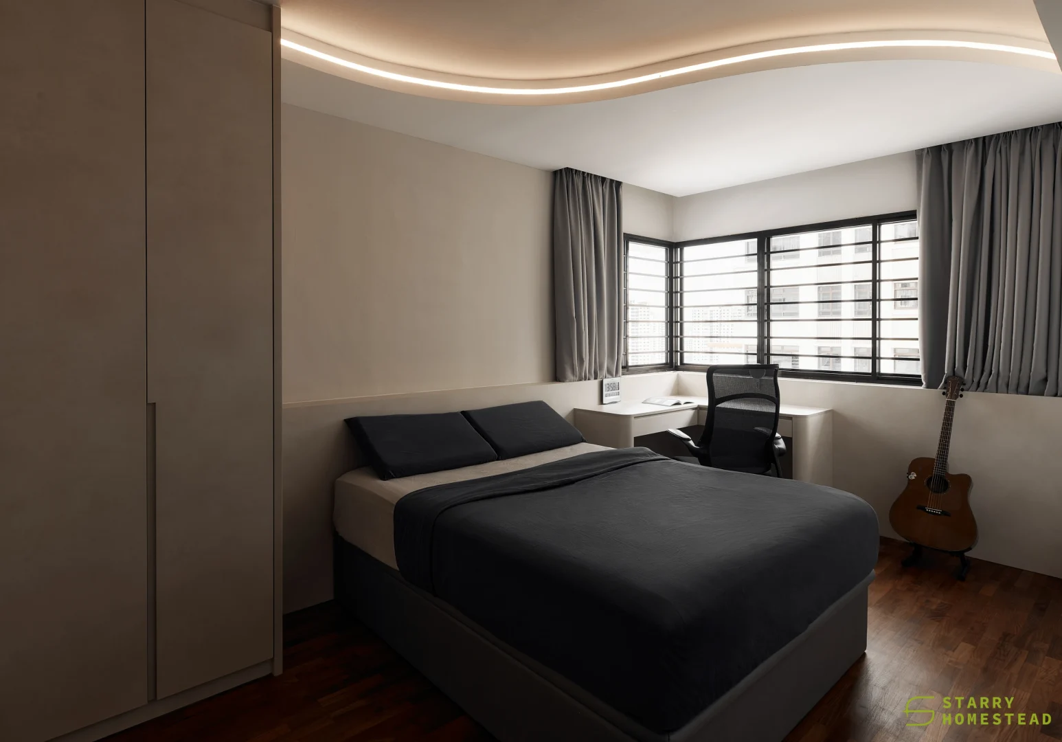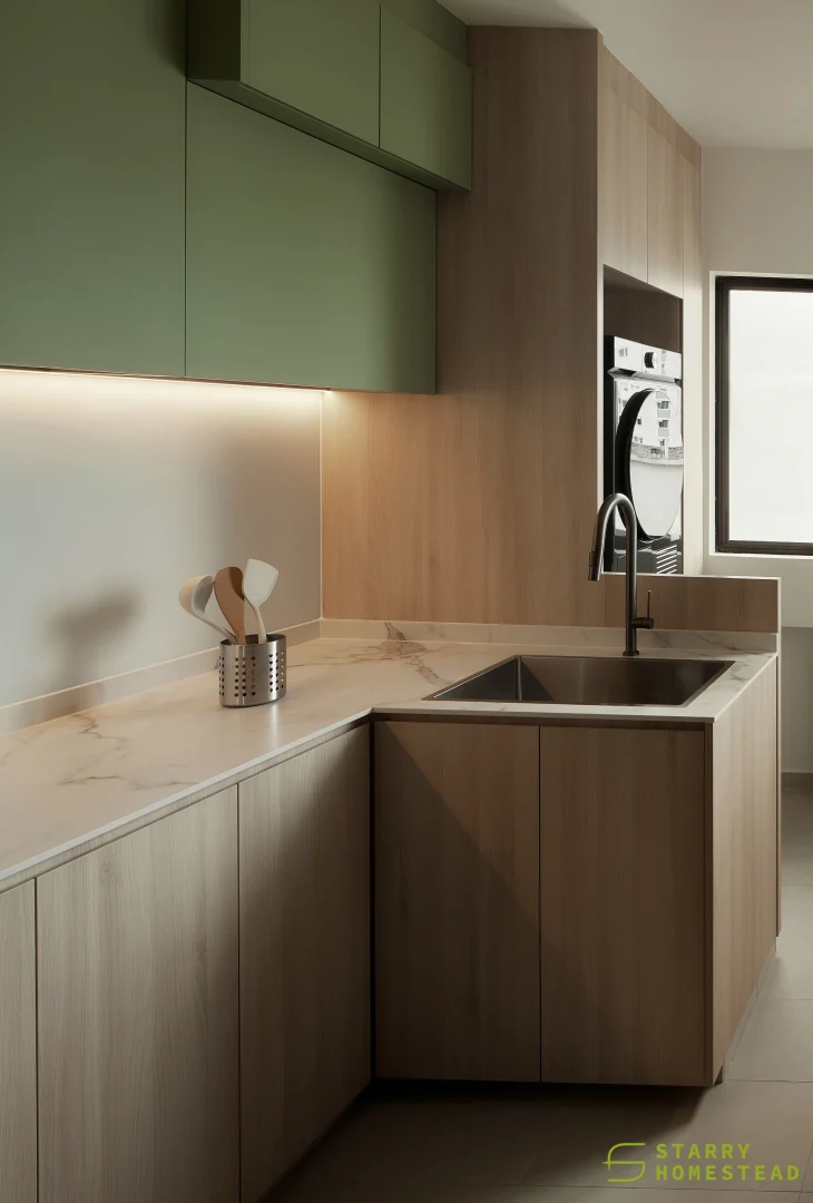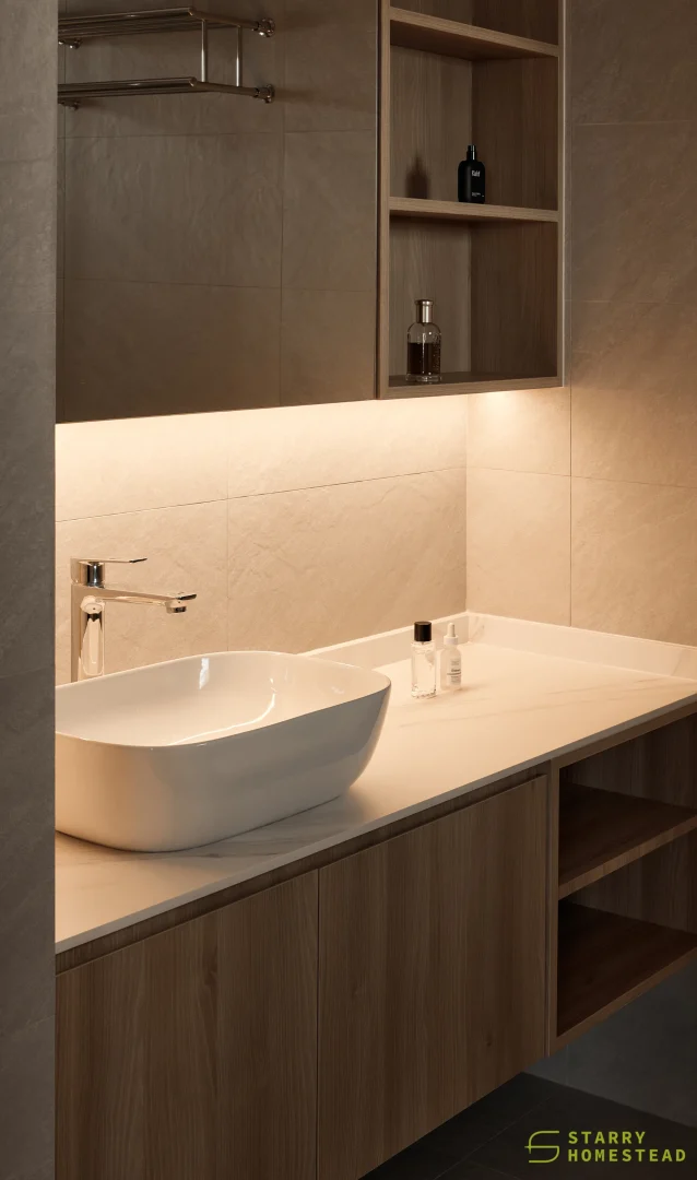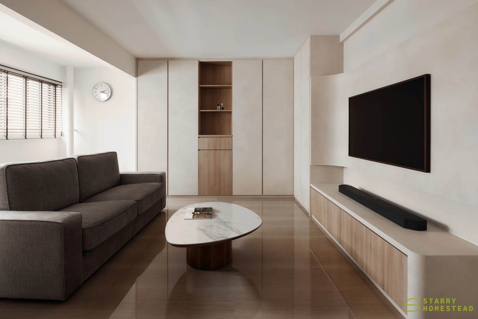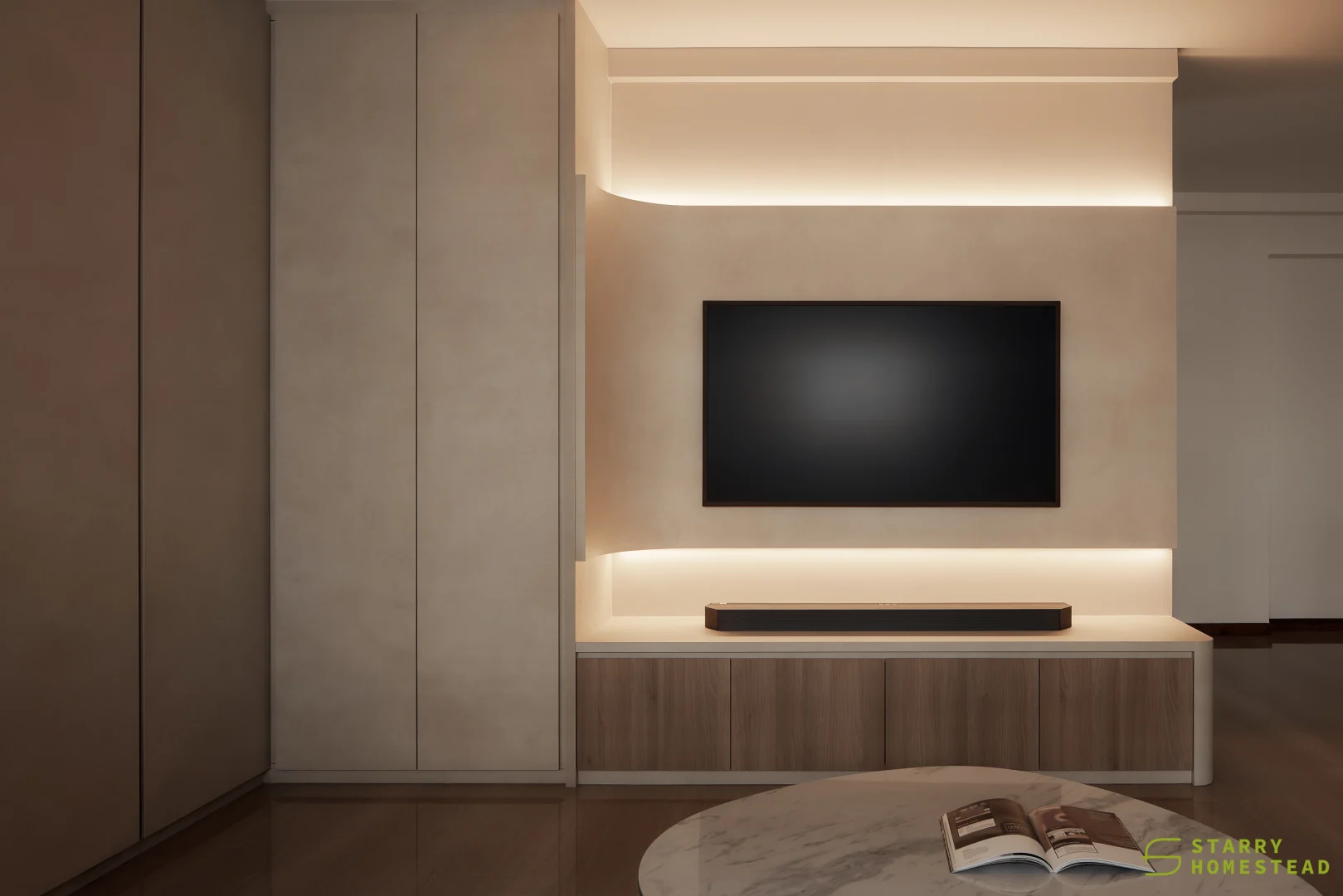 Simplicity, comfort, and practicality form the foundation of the design, allowing each element to serve a clear purpose within an uncluttered space. Soft neutral tonesโbeige, nude, grey, and warm whiteโcreate a gentle backdrop that feels calm and welcoming. Natural textures like wood and linen introduce quiet contrast, adding depth while keeping the palette soothing and cohesive. Every detail is considered, contributing to a sense of balance without overwhelming the interior. Thoughtfully placed lighting softens the atmosphere, shaping a relaxed and inviting setting for everyday living.