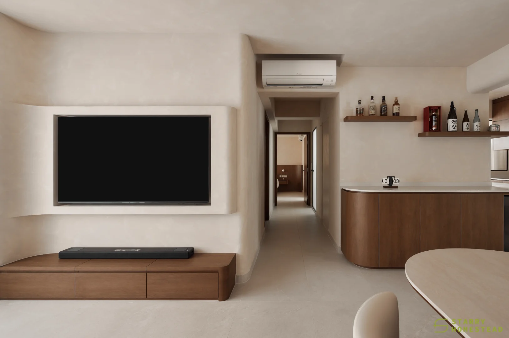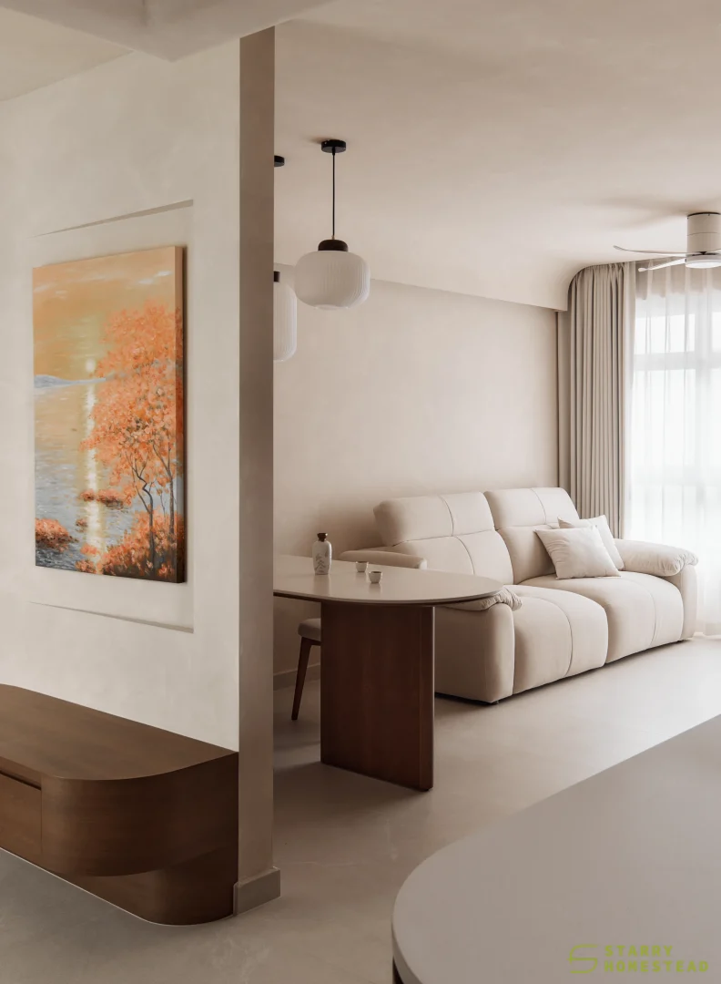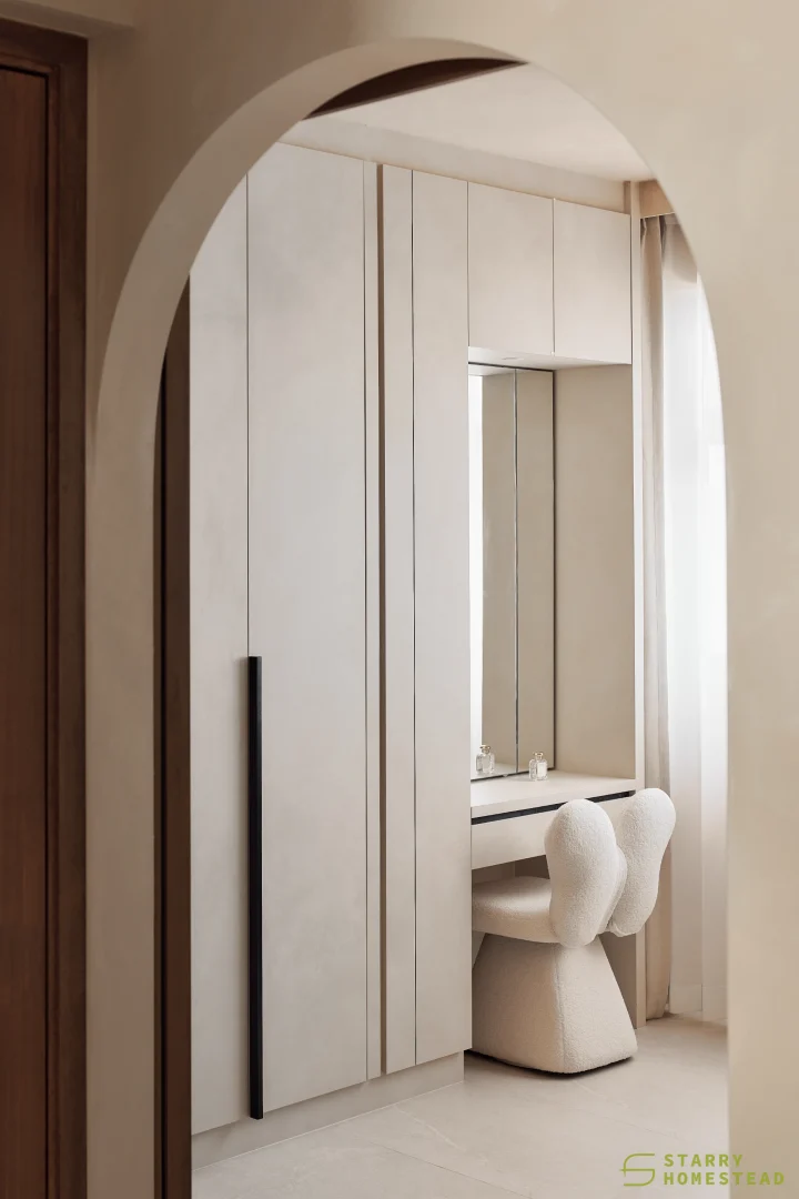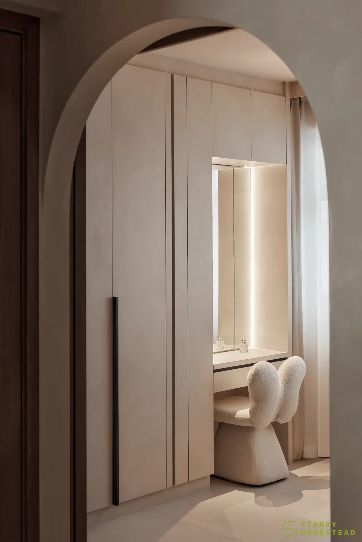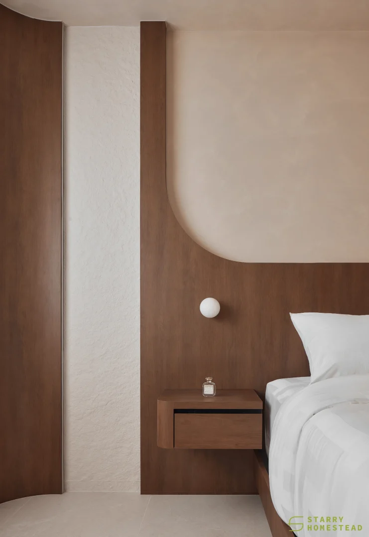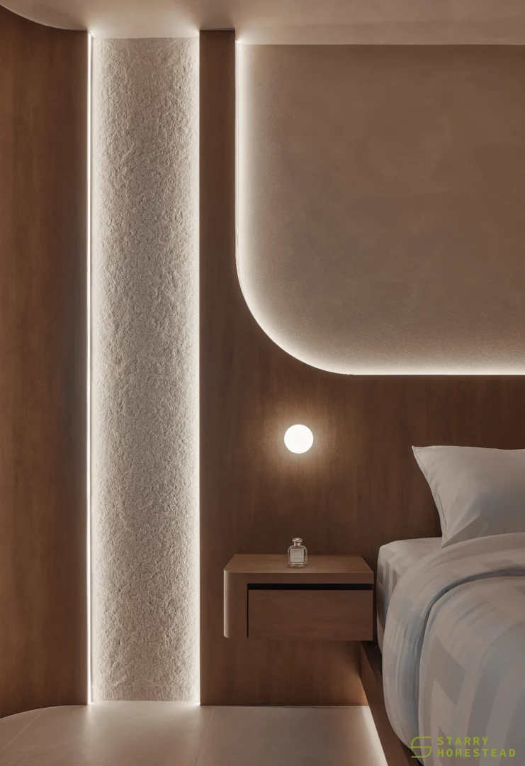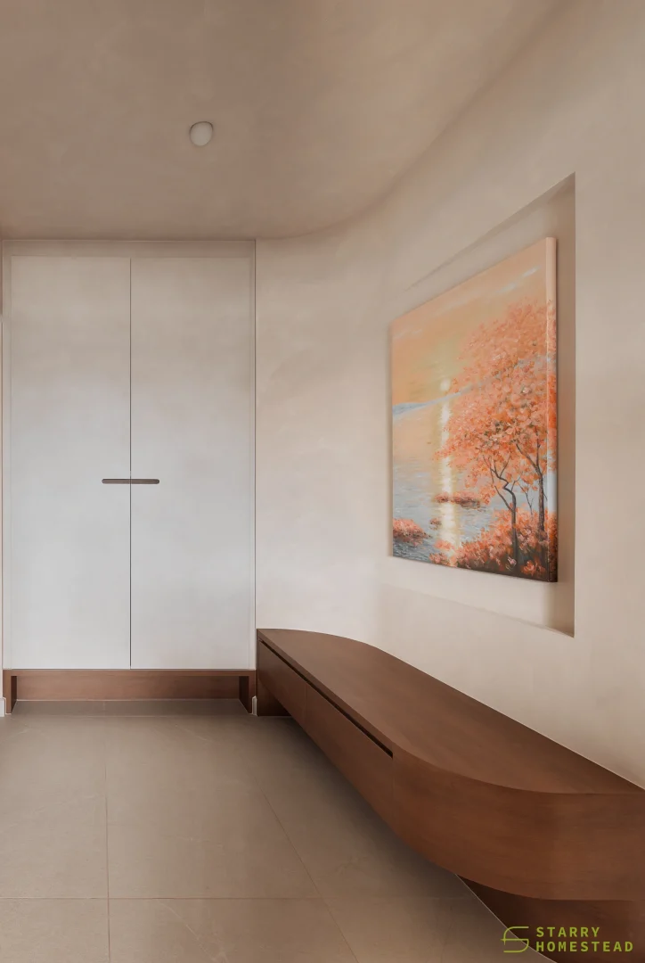 This space embraces the essence of Wabi-Sabi, celebrating the beauty of imperfection and natural simplicity. The limewash walls bring a subtle depth and texture, creating a gentle interplay of light and shadow that enhances the roomโs organic warmth. Soft curves flow throughout the design, from the architecture to the furniture, lending a sense of calm continuity and balance. The palette of light beige and dark brown adds a grounding contrast, evoking both comfort and understated sophistication. Together, these elements form a cosy, harmonious environment that feels timeless and effortlessly serene.