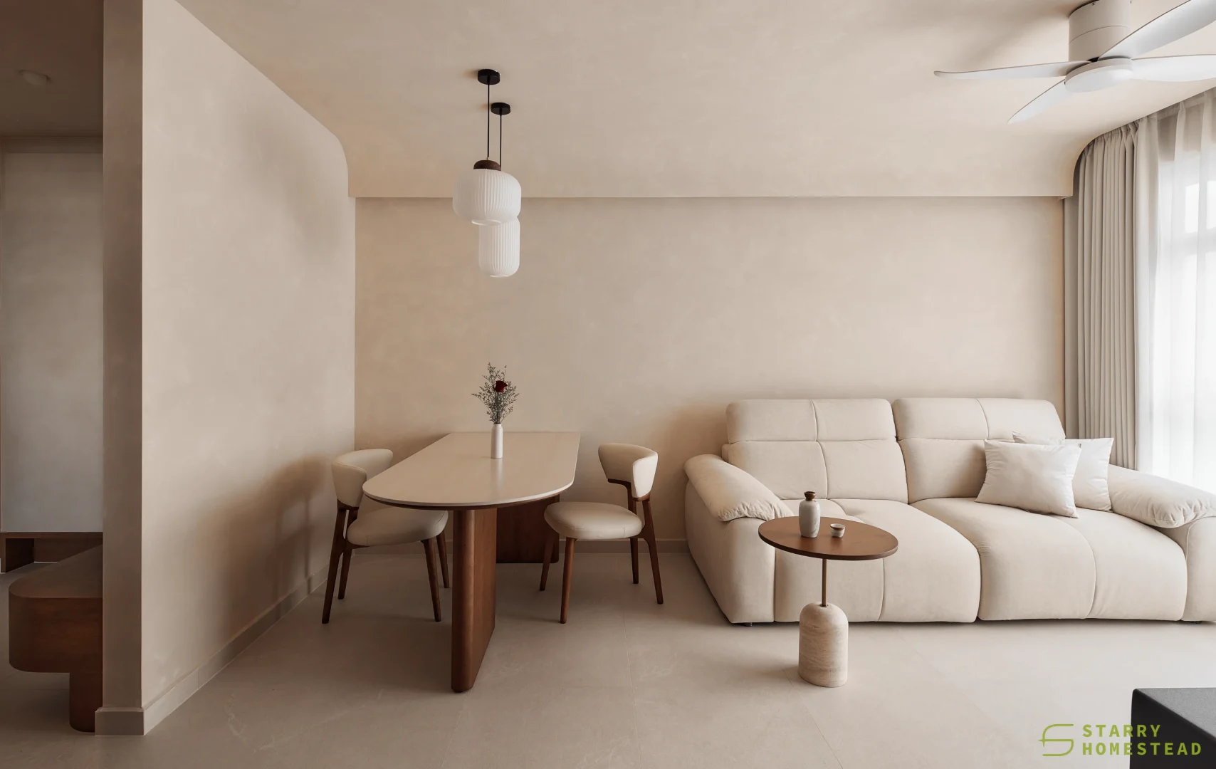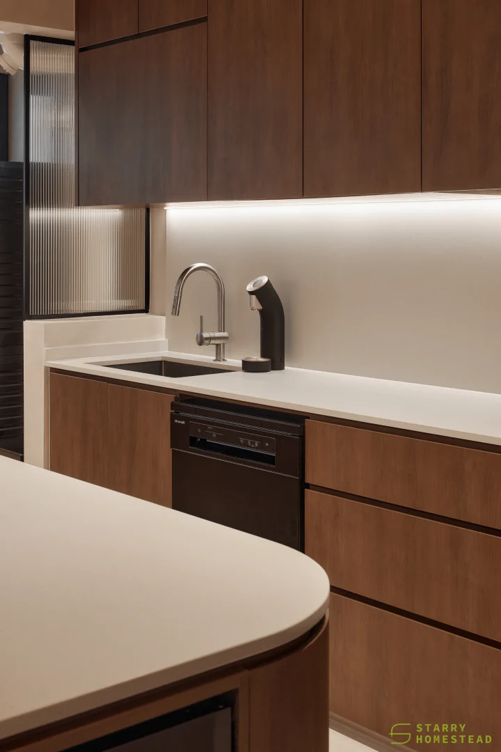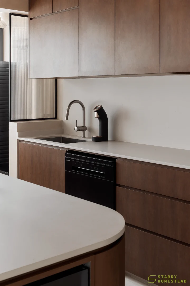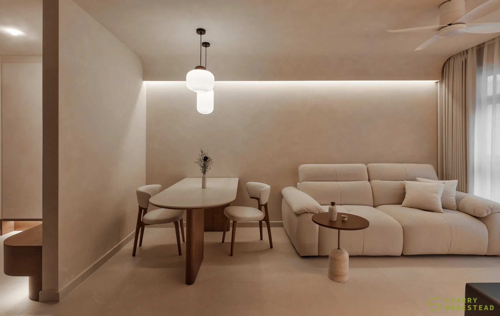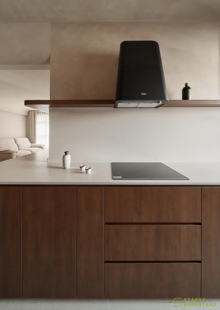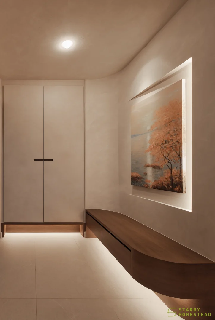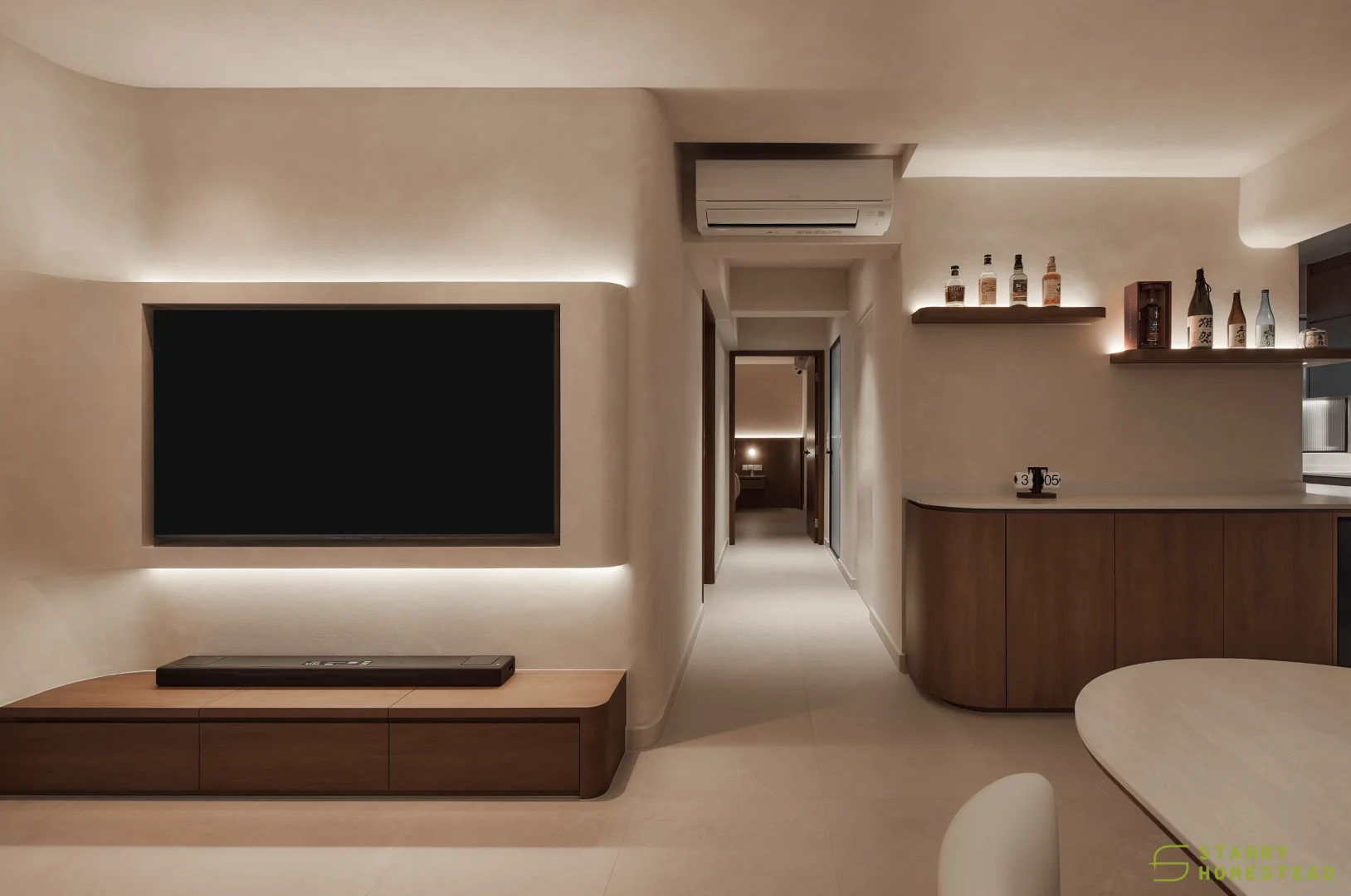 This space embraces the essence of Wabi-Sabi, celebrating the beauty of imperfection and natural simplicity. The limewash walls bring a subtle depth and texture, creating a gentle interplay of light and shadow that enhances the roomโs organic warmth. Soft curves flow throughout the design, from the architecture to the furniture, lending a sense of calm continuity and balance. The palette of light beige and dark brown adds a grounding contrast, evoking both comfort and understated sophistication. Together, these elements form a cosy, harmonious environment that feels timeless and effortlessly serene.