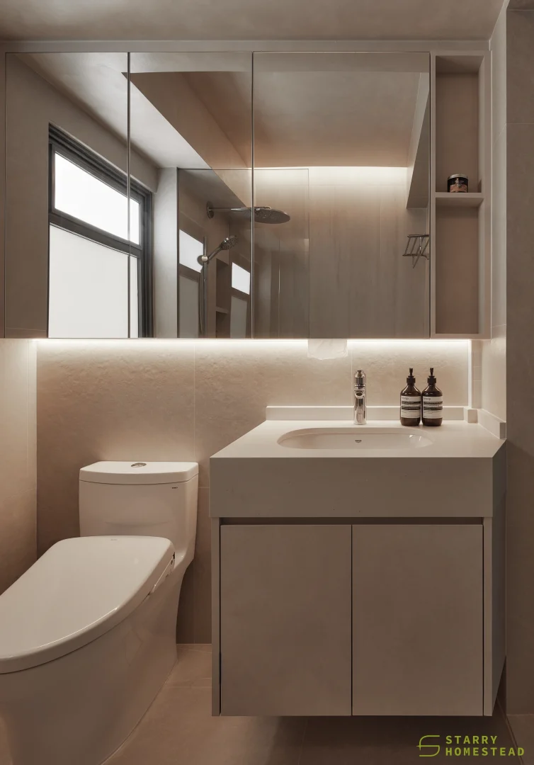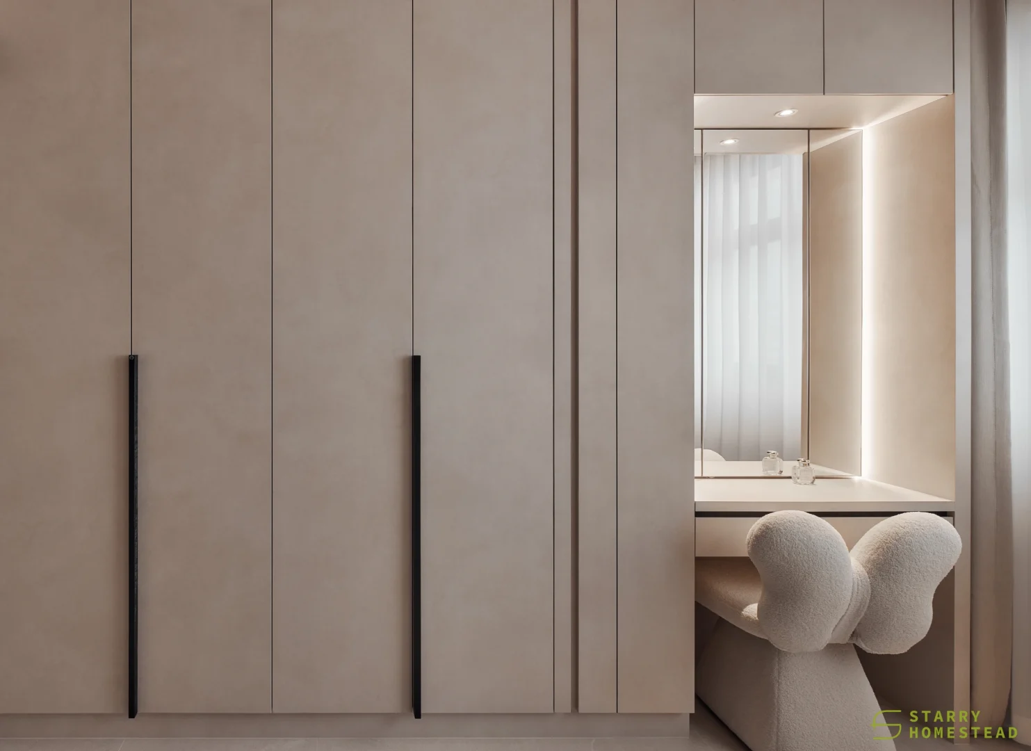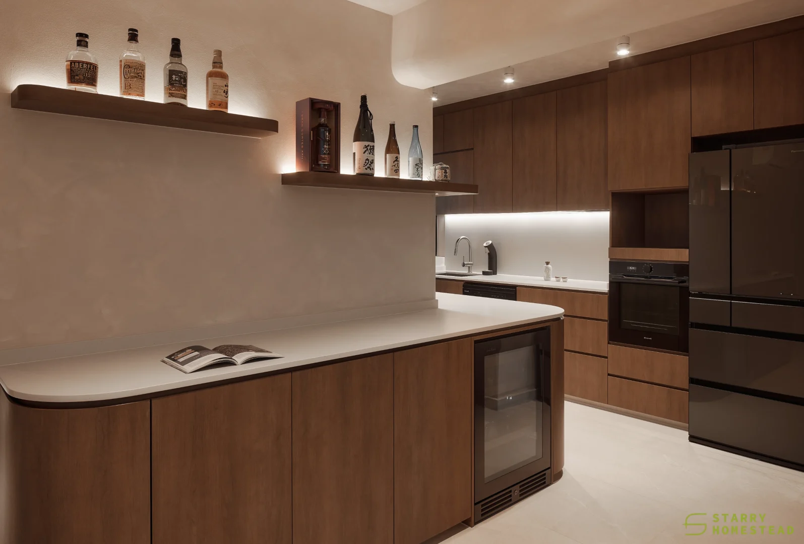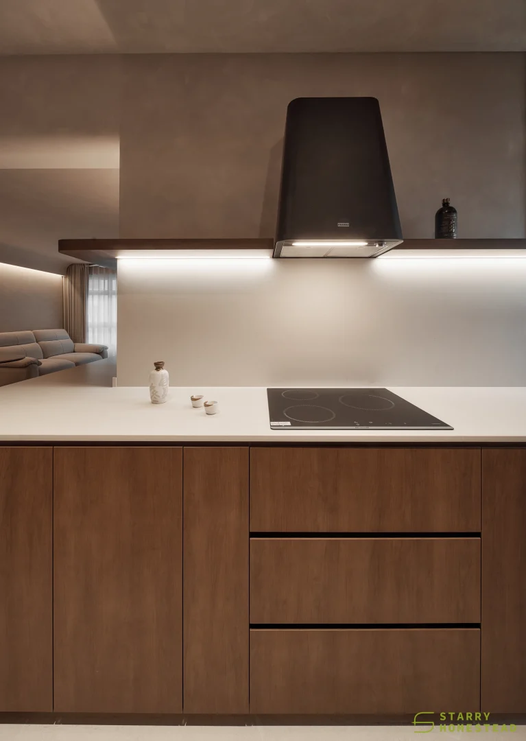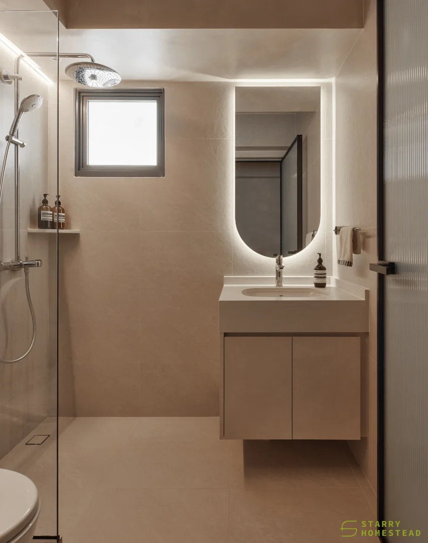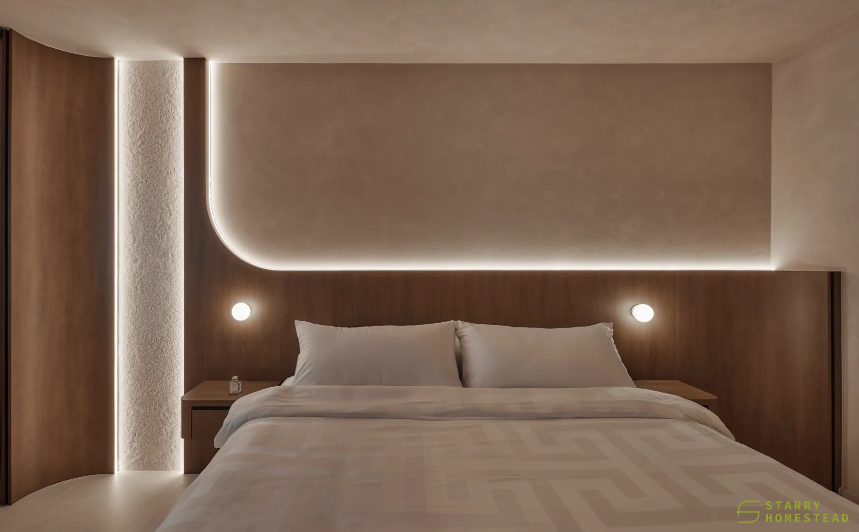 This space embraces the essence of Wabi-Sabi, celebrating the beauty of imperfection and natural simplicity. The limewash walls bring a subtle depth and texture, creating a gentle interplay of light and shadow that enhances the roomโs organic warmth. Soft curves flow throughout the design, from the architecture to the furniture, lending a sense of calm continuity and balance. The palette of light beige and dark brown adds a grounding contrast, evoking both comfort and understated sophistication. Together, these elements form a cosy, harmonious environment that feels timeless and effortlessly serene.