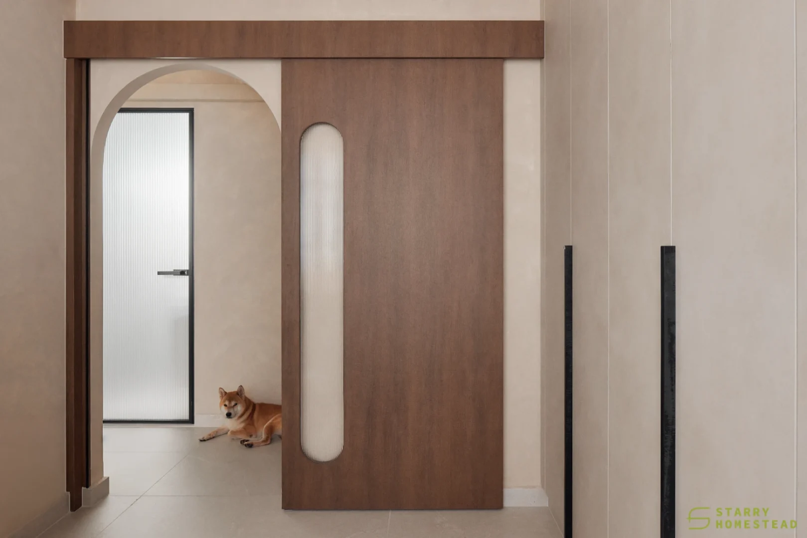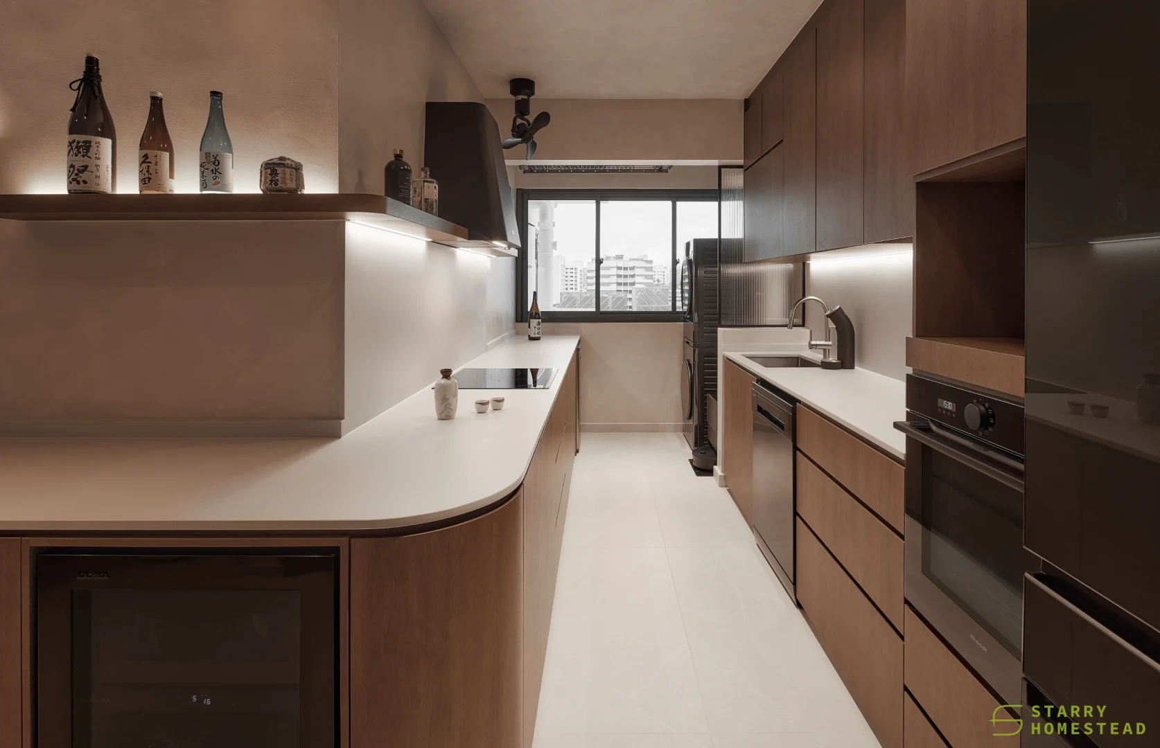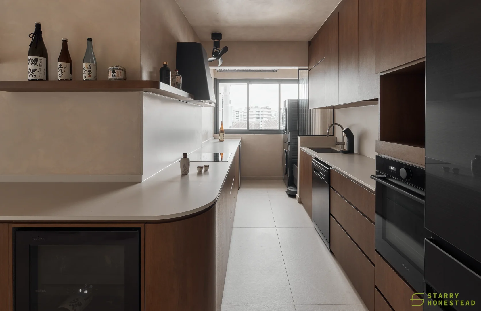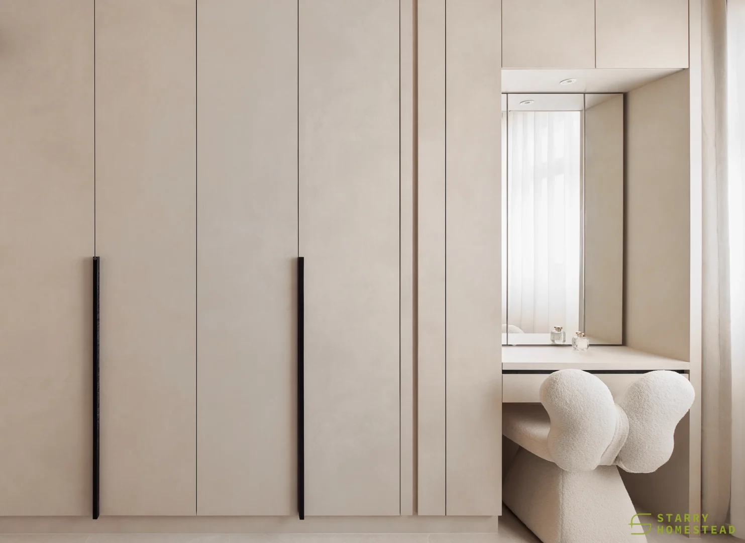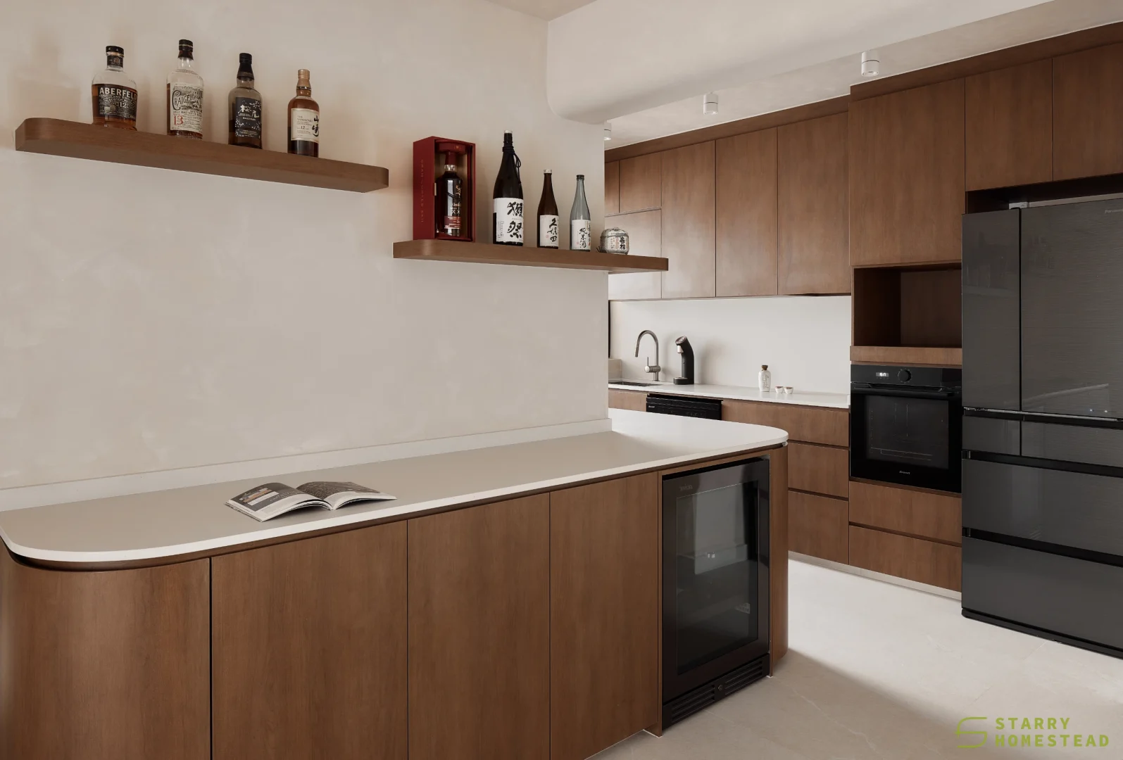 This space embraces the essence of Wabi-Sabi, celebrating the beauty of imperfection and natural simplicity. The limewash walls bring a subtle depth and texture, creating a gentle interplay of light and shadow that enhances the roomโs organic warmth. Soft curves flow throughout the design, from the architecture to the furniture, lending a sense of calm continuity and balance. The palette of light beige and dark brown adds a grounding contrast, evoking both comfort and understated sophistication. Together, these elements form a cosy, harmonious environment that feels timeless and effortlessly serene.