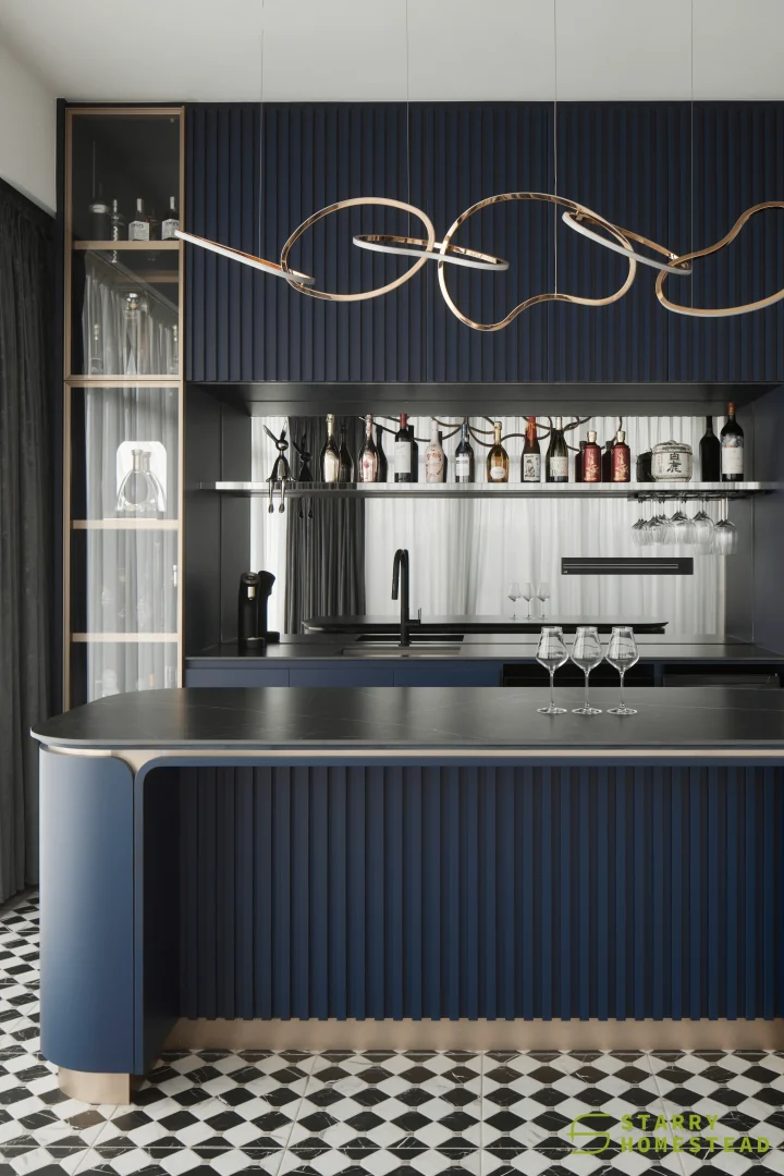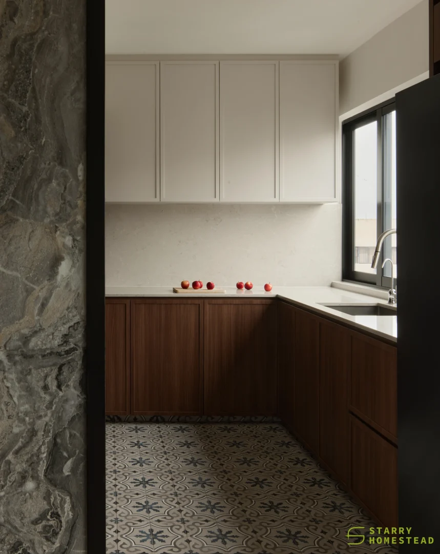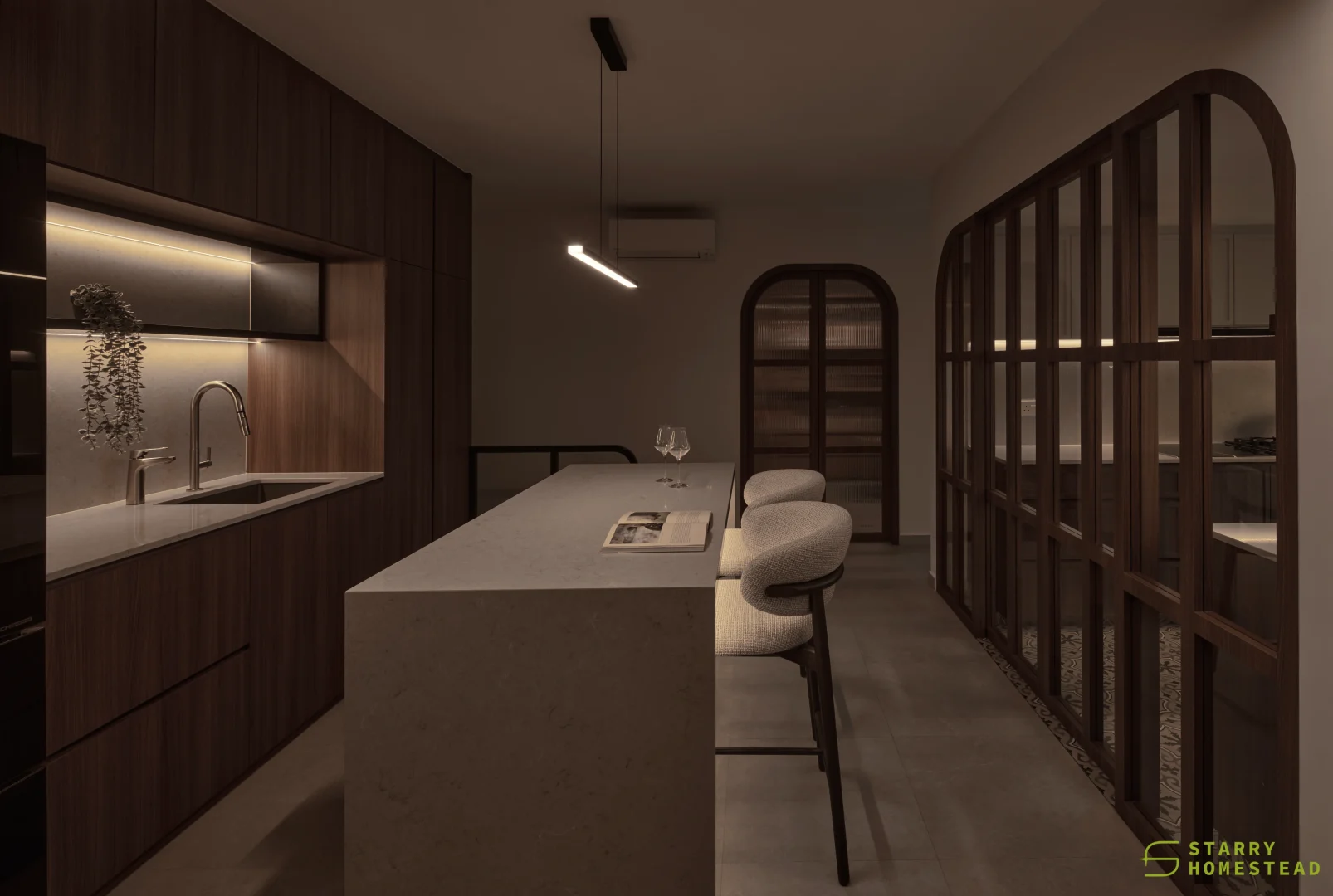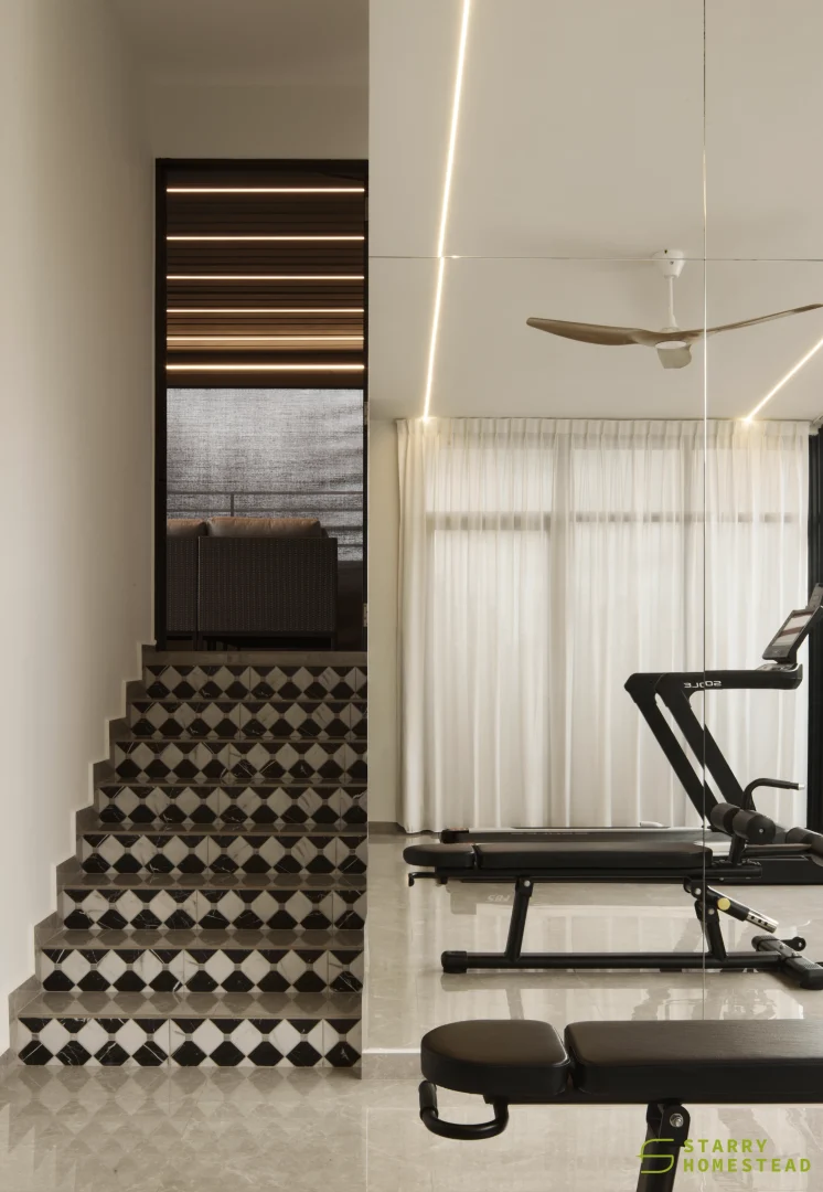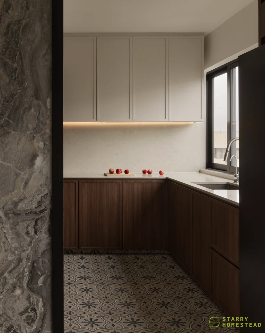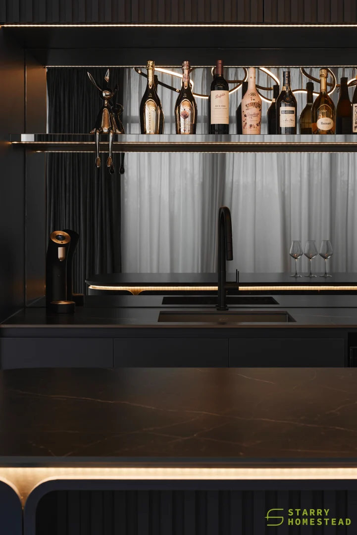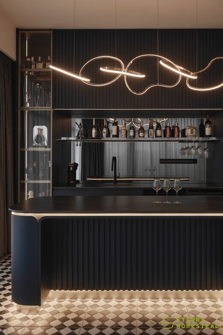 The kitchen shifts towards a Mid-Century expression, introducing stronger contrast and clearly defining the space. In contrast, the study, gym and entertainment rooms adopt a more luxurious and contemporary tone, distinguished by refined detailing and a modern, polished edge.