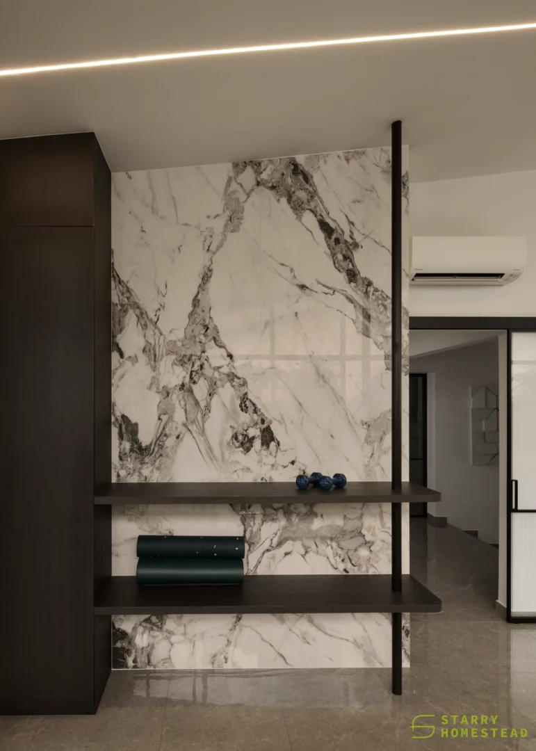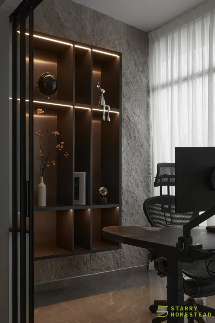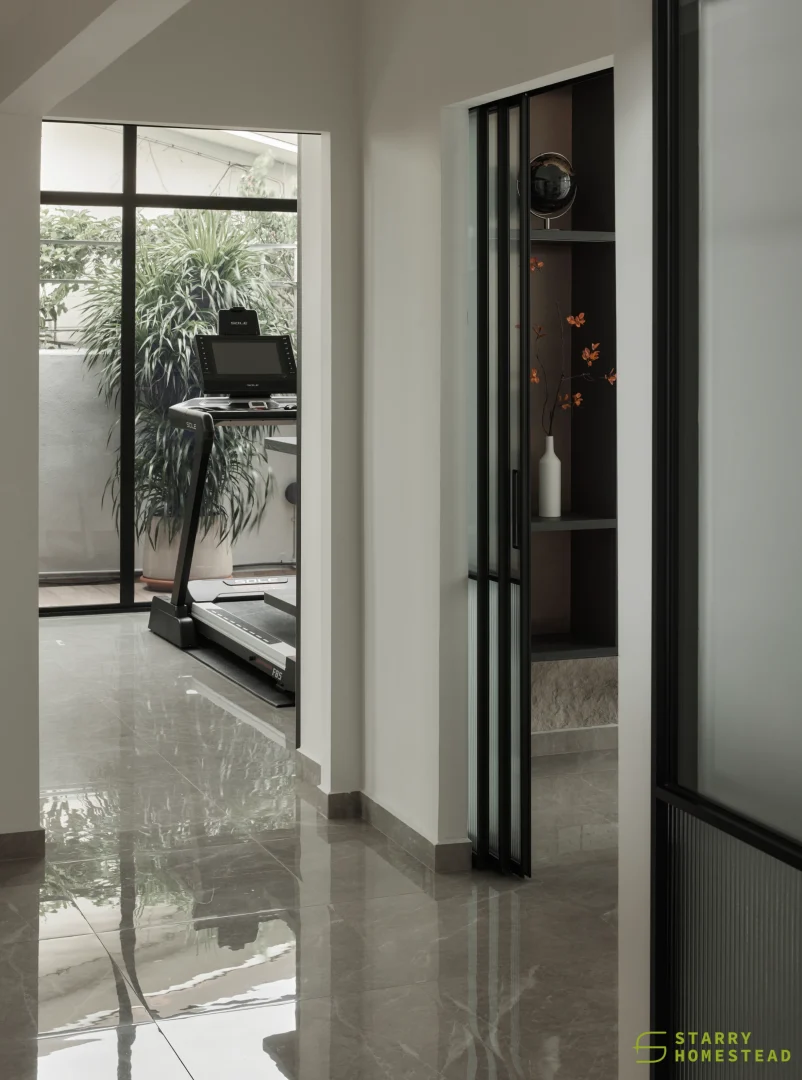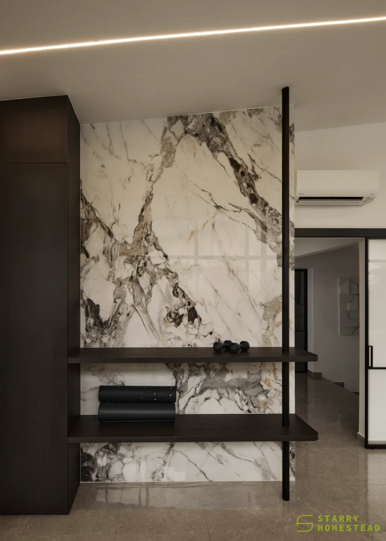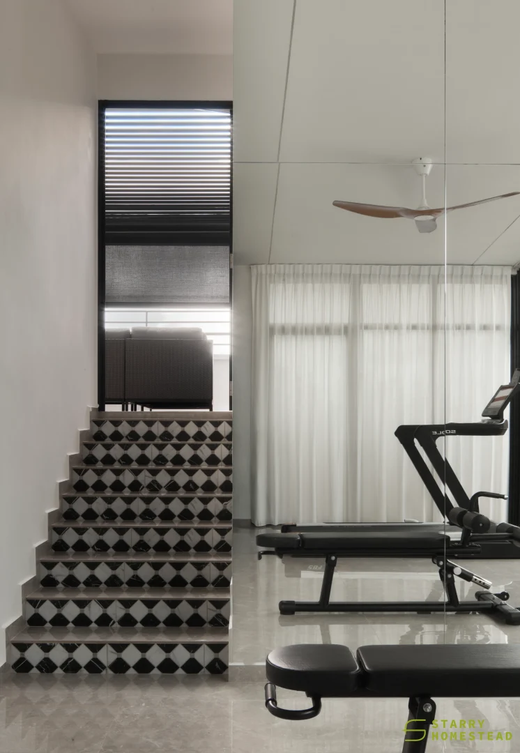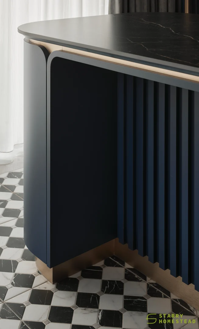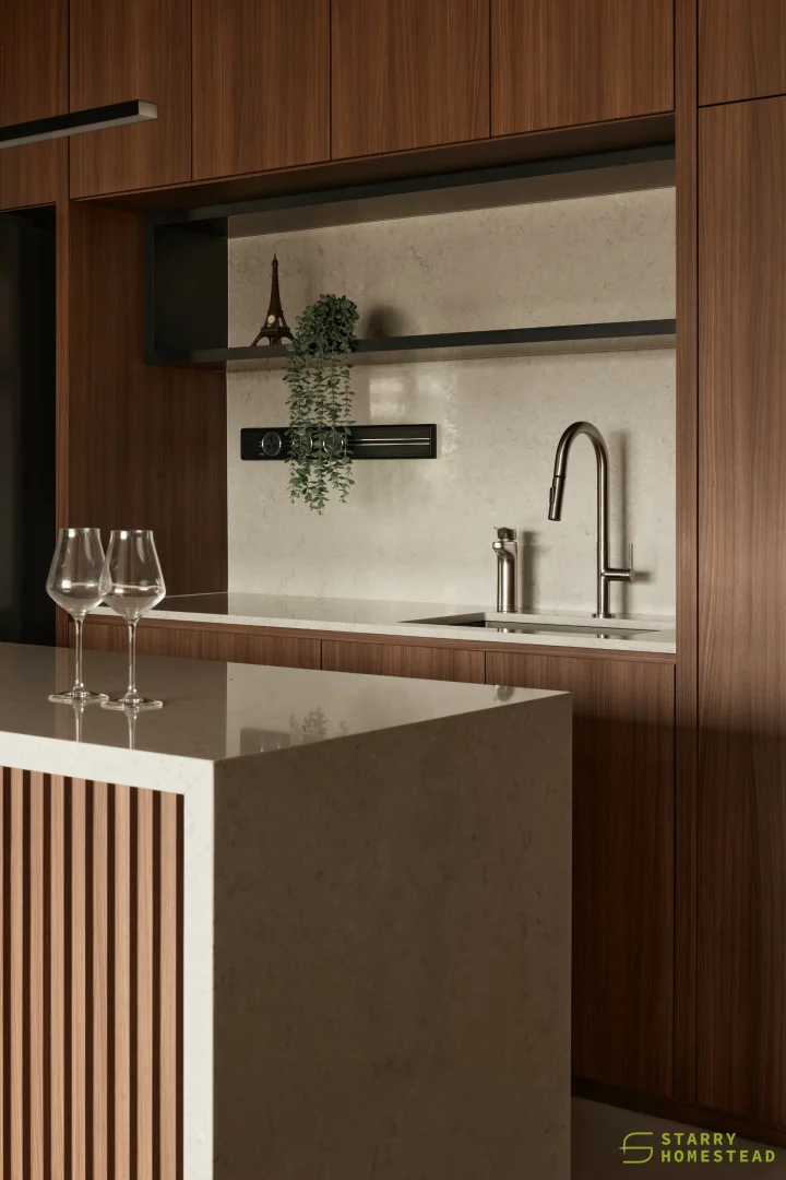 The kitchen shifts towards a Mid-Century expression, introducing stronger contrast and clearly defining the space. In contrast, the study, gym and entertainment rooms adopt a more luxurious and contemporary tone, distinguished by refined detailing and a modern, polished edge.