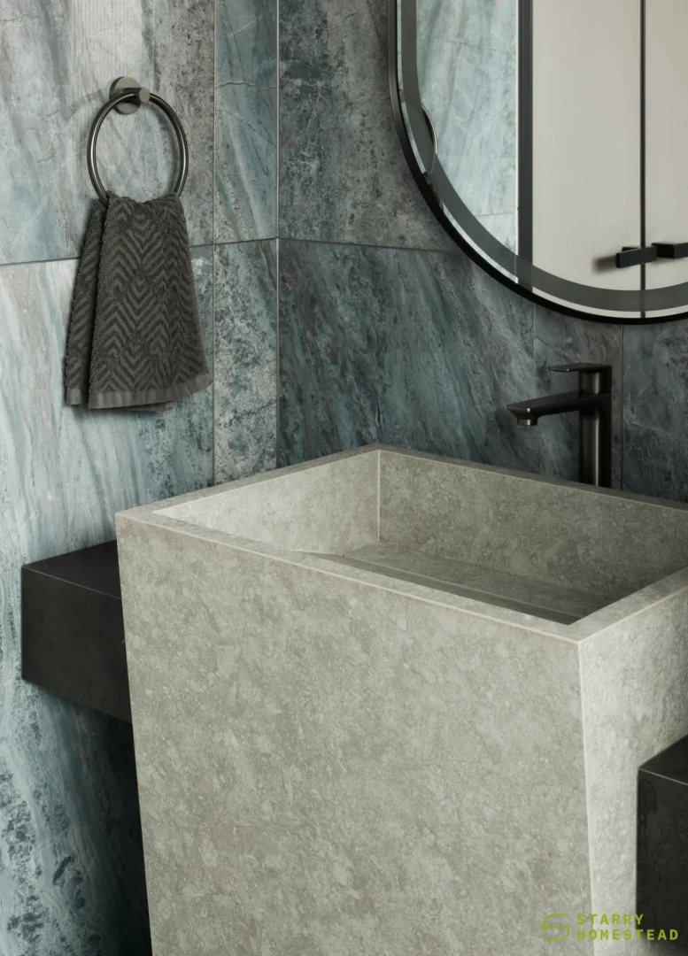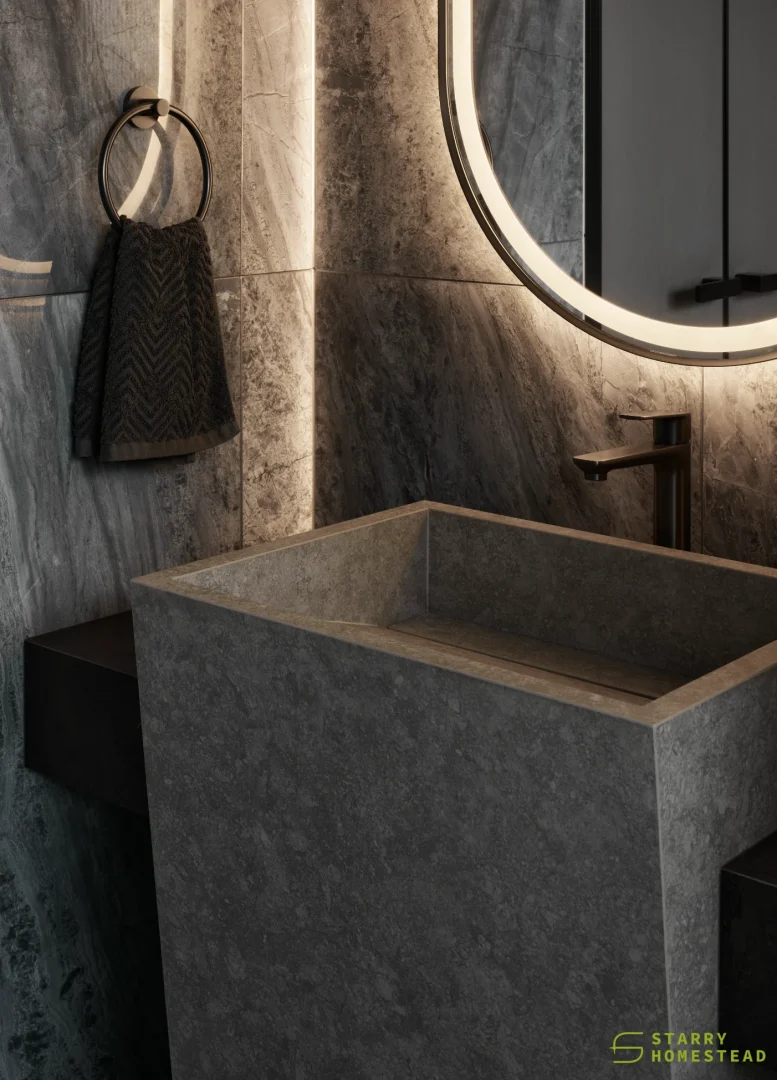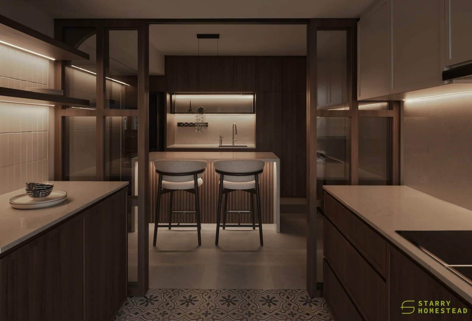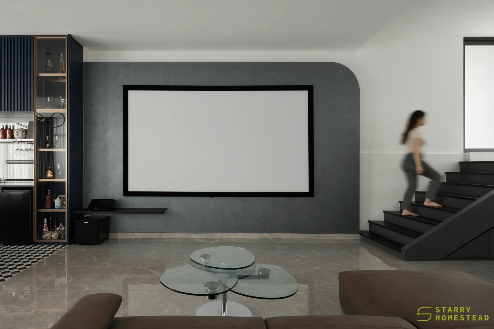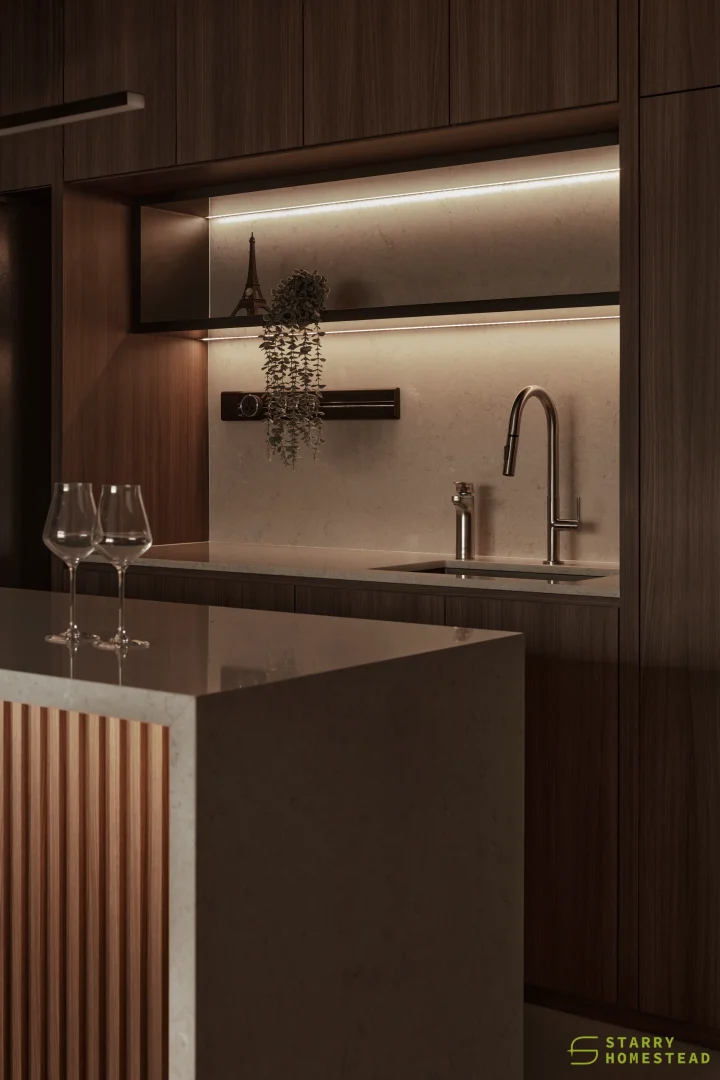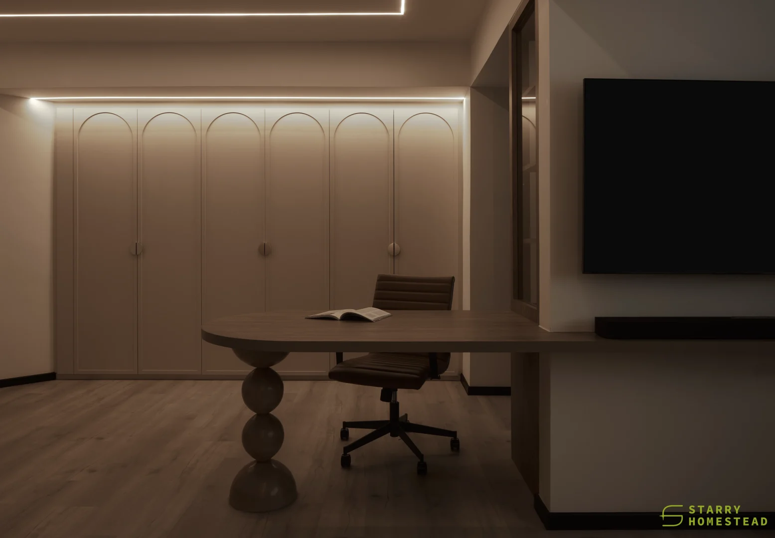 The kitchen shifts towards a Mid-Century expression, introducing stronger contrast and clearly defining the space. In contrast, the study, gym and entertainment rooms adopt a more luxurious and contemporary tone, distinguished by refined detailing and a modern, polished edge.
