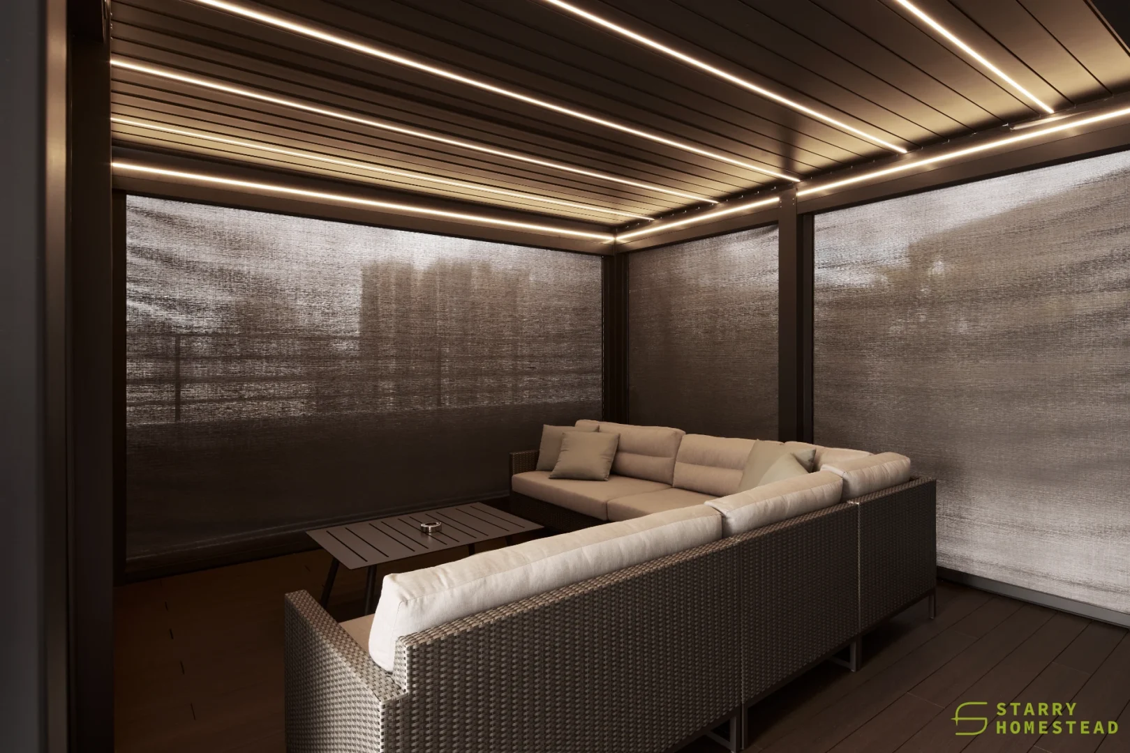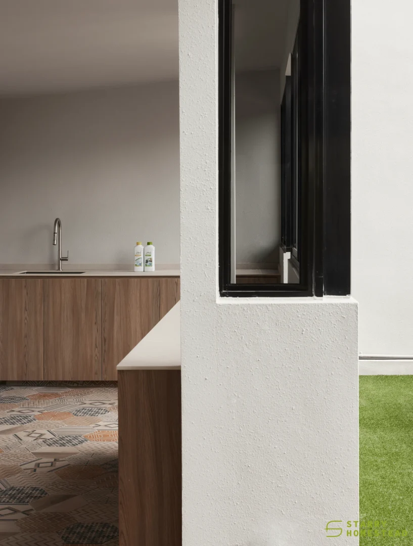 Beyond the interiors, the outdoor area is designed to support social gatherings, featuring an outdoor kitchen and relaxation space that seamlessly extend the living experience for barbecues and group entertaining.