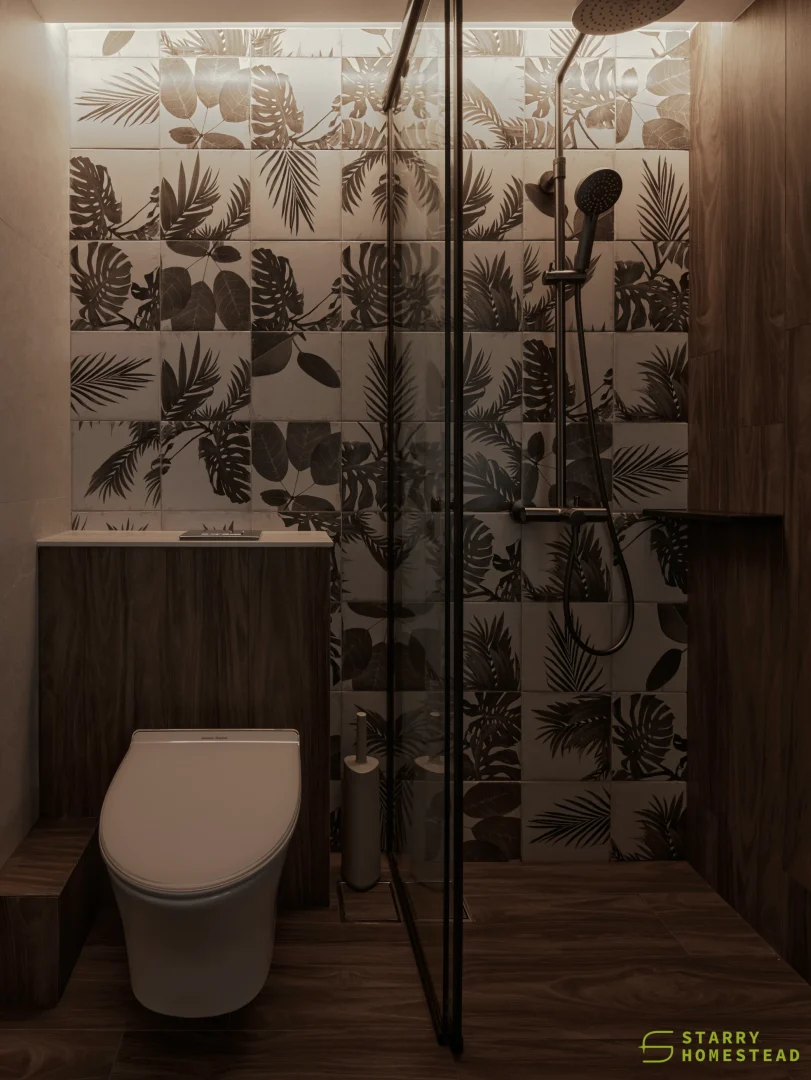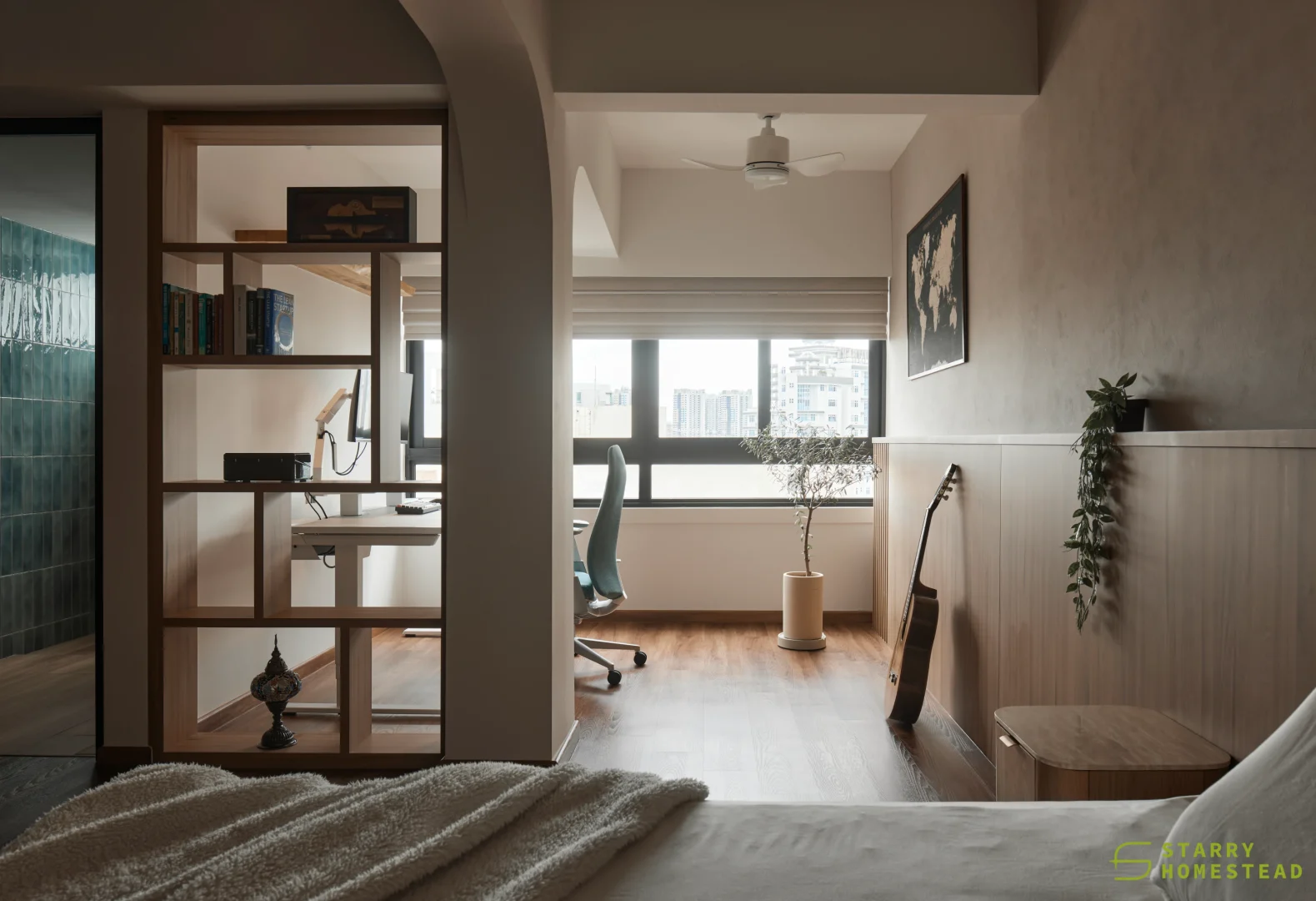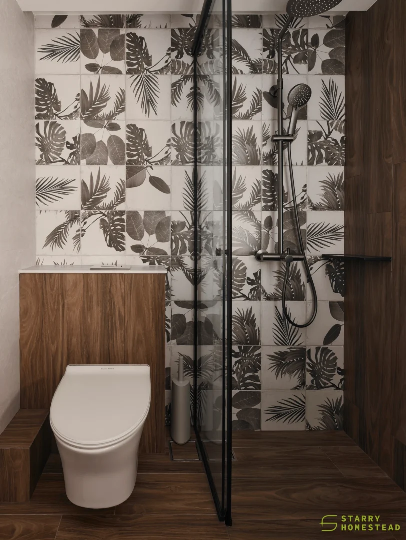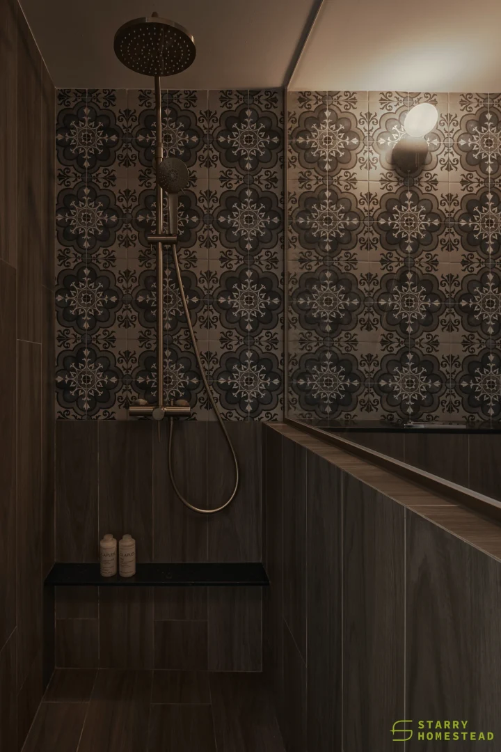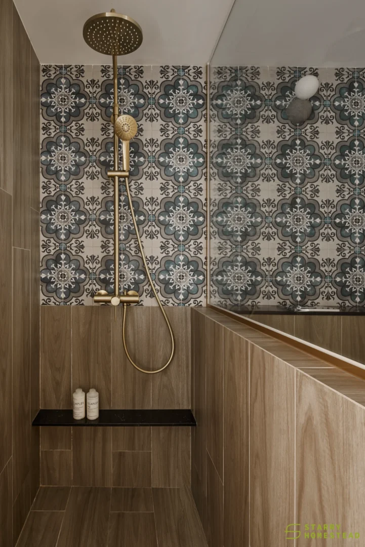 The foyer and living room embrace Japandi principles, highlighted by a tatami platform, a Japanese-style screen and a round false ceiling that softens the space with calm, understated elegance. Each bedroom is designed with a distinct theme, offering four different spatial experiences, yet united by a shared sense of naturality. Materials such as light and dark wood, ecoclay finishes, marble patterns, botanical tiles and limewash textures bring warmth, depth and a grounded quality to the interiors.