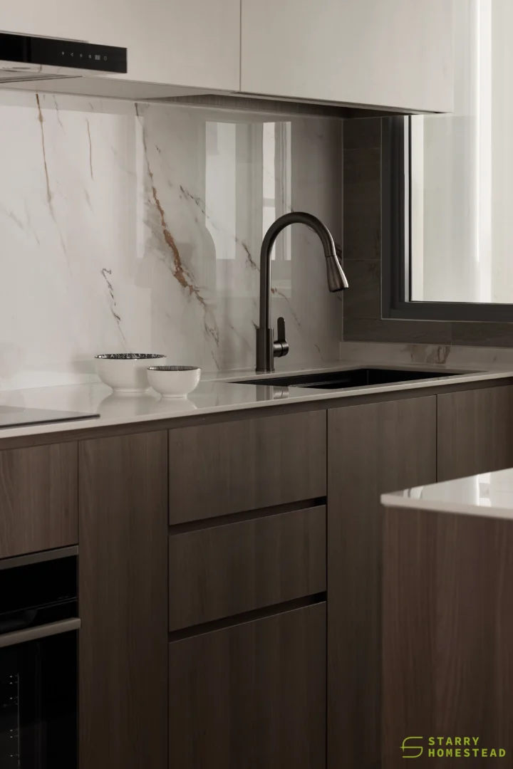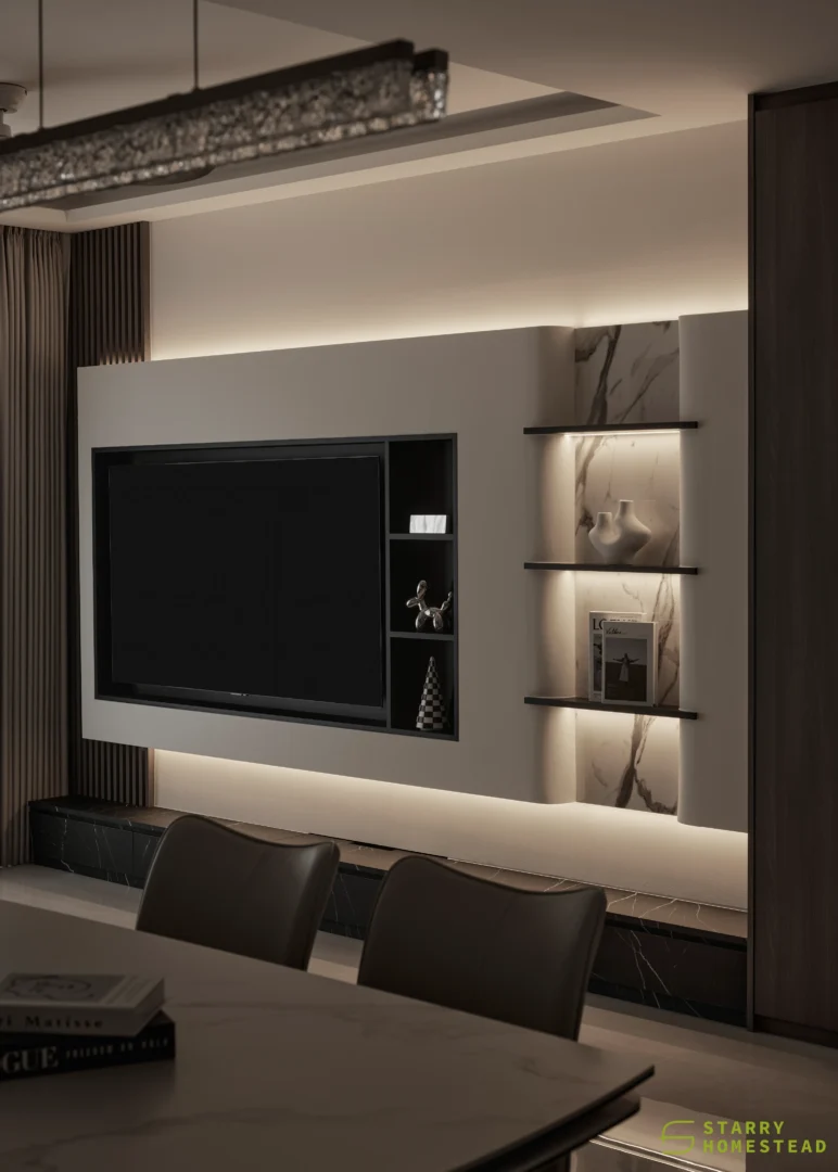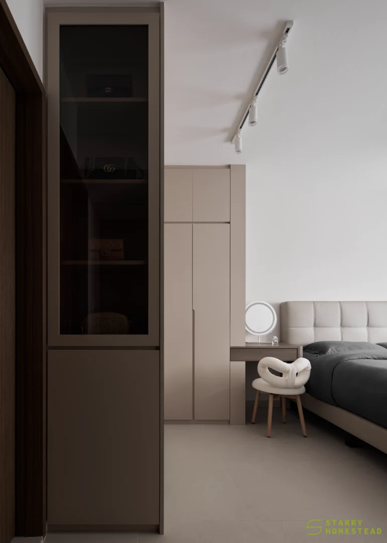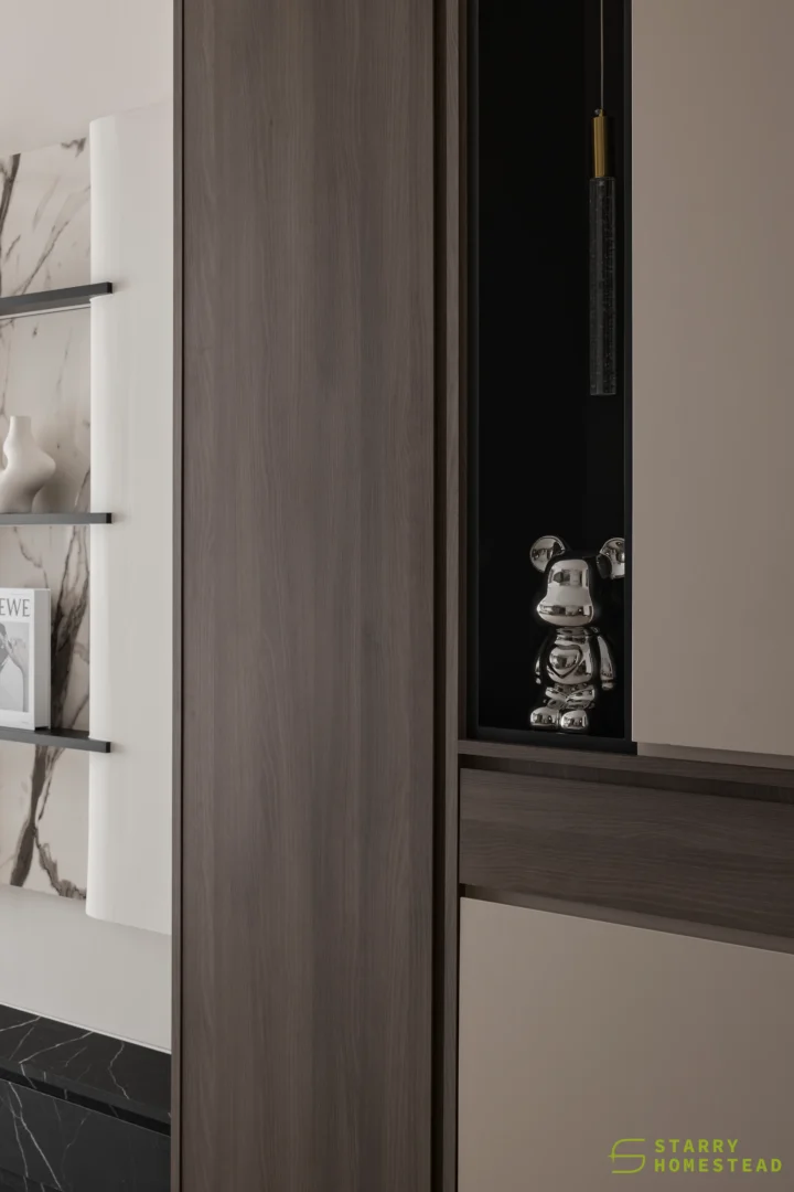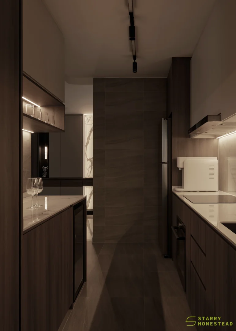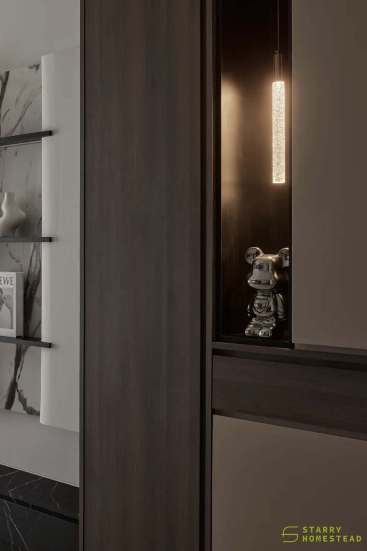 The design embodies a refined approach with a subtle expression of Light Luxury, inspired by a Modern Italian aesthetic. A low-saturation colour palette establishes a calm and elegant foundation, while dark wood laminate introduces depth and tactile warmth to the living spaces. Marble laminate accents add a layer of understated sophistication, creating visual interest without overwhelming the serene ambience. Generous negative space and integrated LED lighting further enhance the sense of openness and tranquillity, allowing key architectural and material details to take centre stage. Clean lines, bespoke cabinetry and thoughtful spatial planning contribute to a cohesive flow between zones, with careful attention to both functionality and quiet refinement. The result is an interior that feels contemporary yet timeless, relaxed yet polished — a harmonious balance of materiality, light and proportion that elevates everyday living.