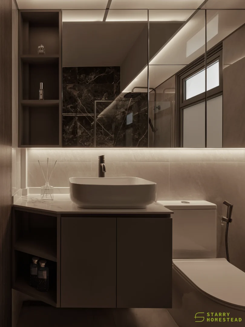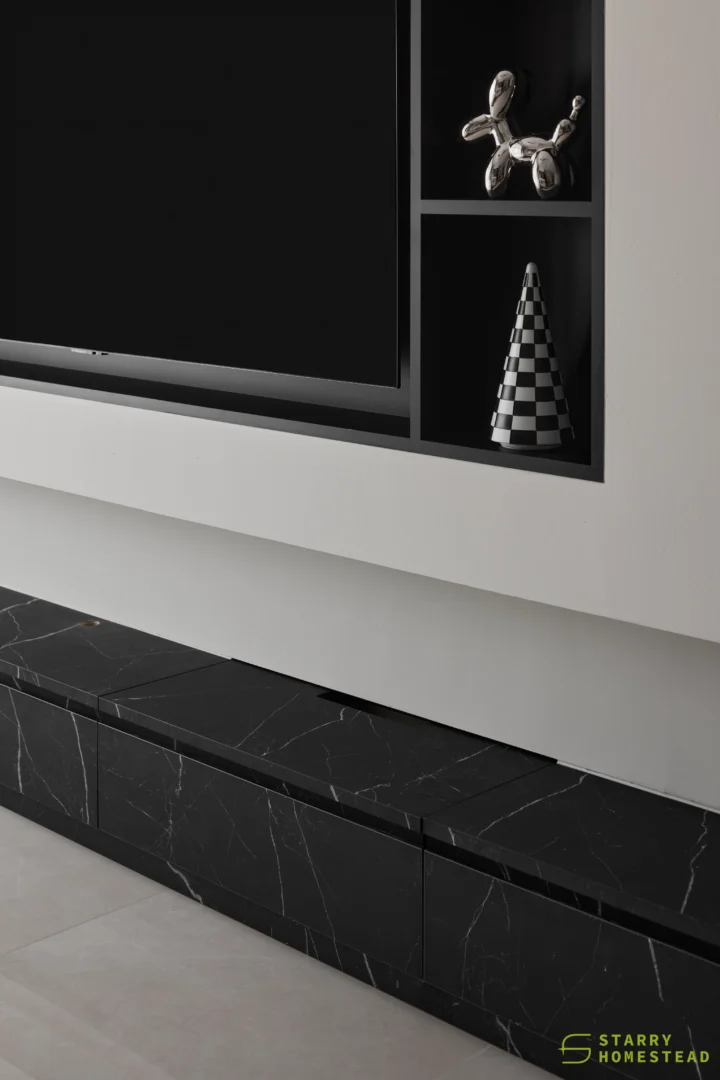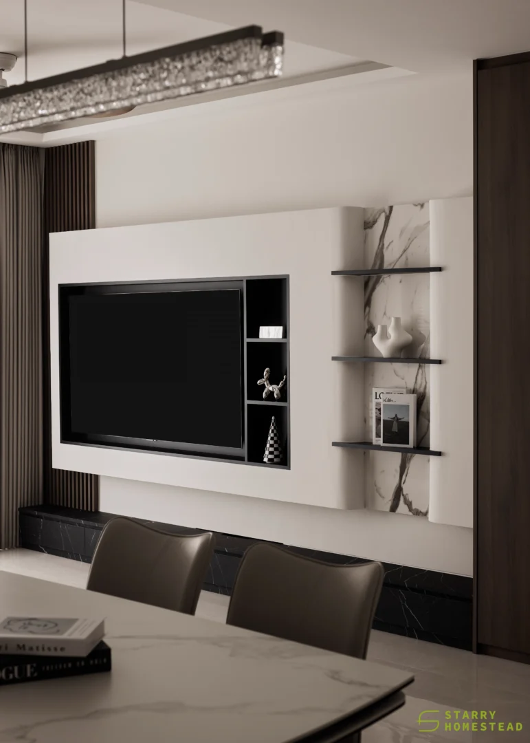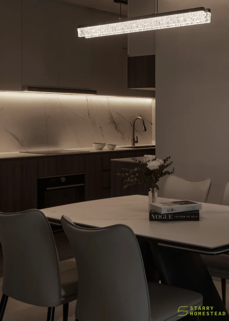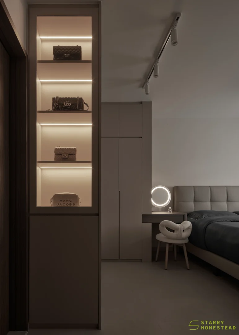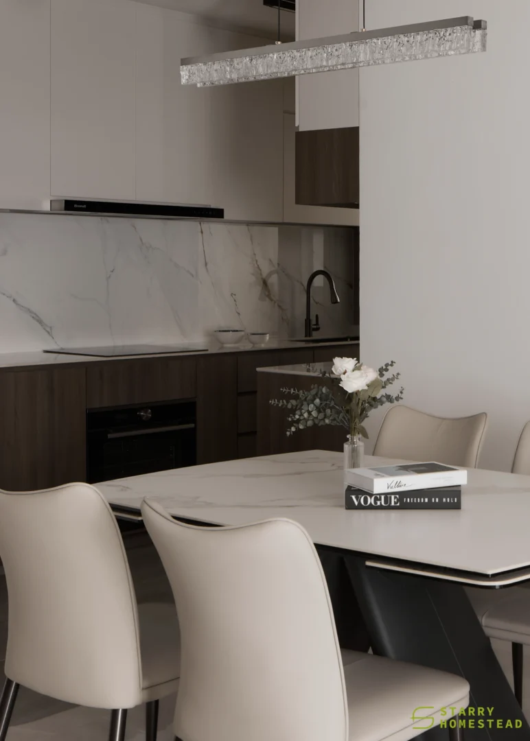 The design embodies a refined approach with a subtle expression of Light Luxury, inspired by a Modern Italian aesthetic. A low-saturation colour palette establishes a calm and elegant foundation, while dark wood laminate introduces depth and tactile warmth to the living spaces. Marble laminate accents add a layer of understated sophistication, creating visual interest without overwhelming the serene ambience. Generous negative space and integrated LED lighting further enhance the sense of openness and tranquillity, allowing key architectural and material details to take centre stage. Clean lines, bespoke cabinetry and thoughtful spatial planning contribute to a cohesive flow between zones, with careful attention to both functionality and quiet refinement. The result is an interior that feels contemporary yet timeless, relaxed yet polished — a harmonious balance of materiality, light and proportion that elevates everyday living.