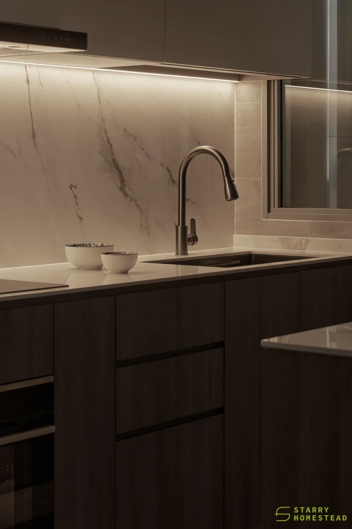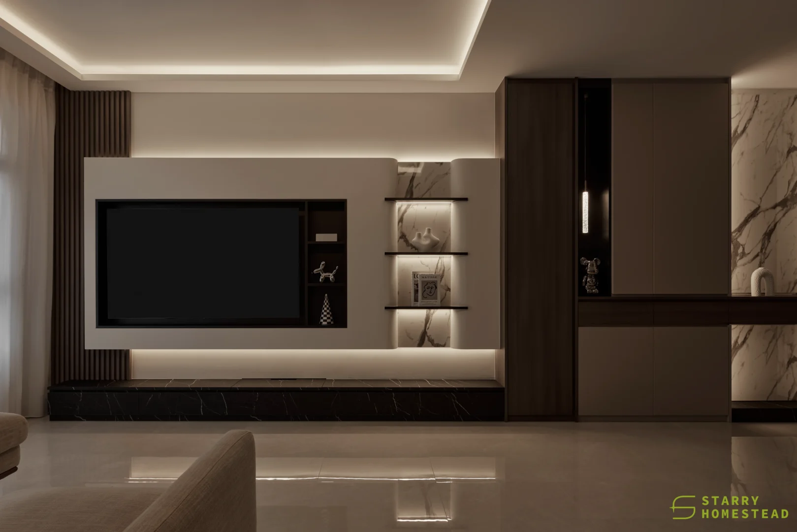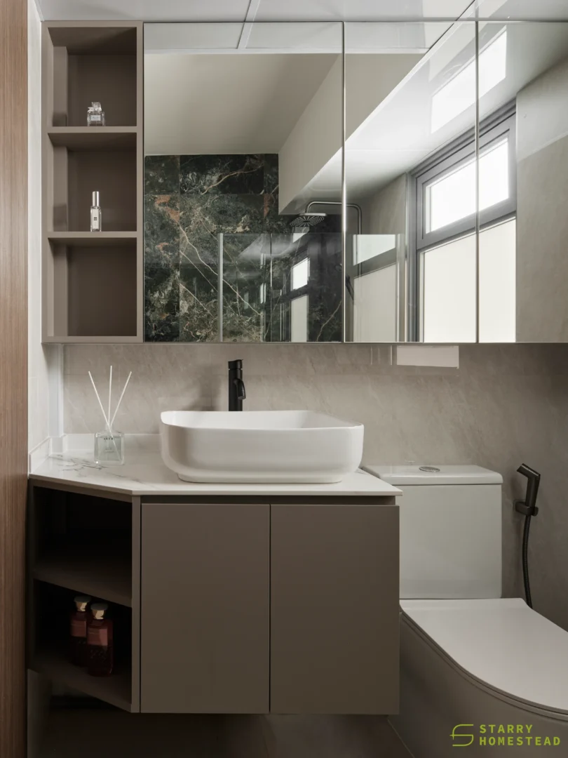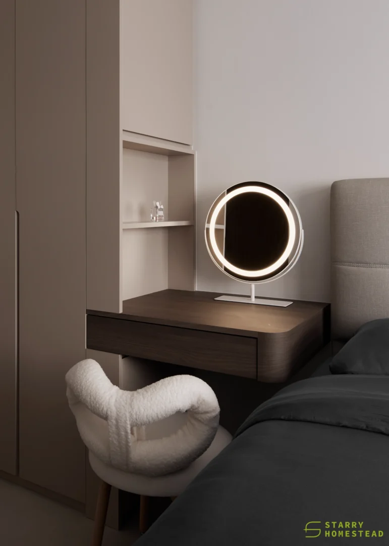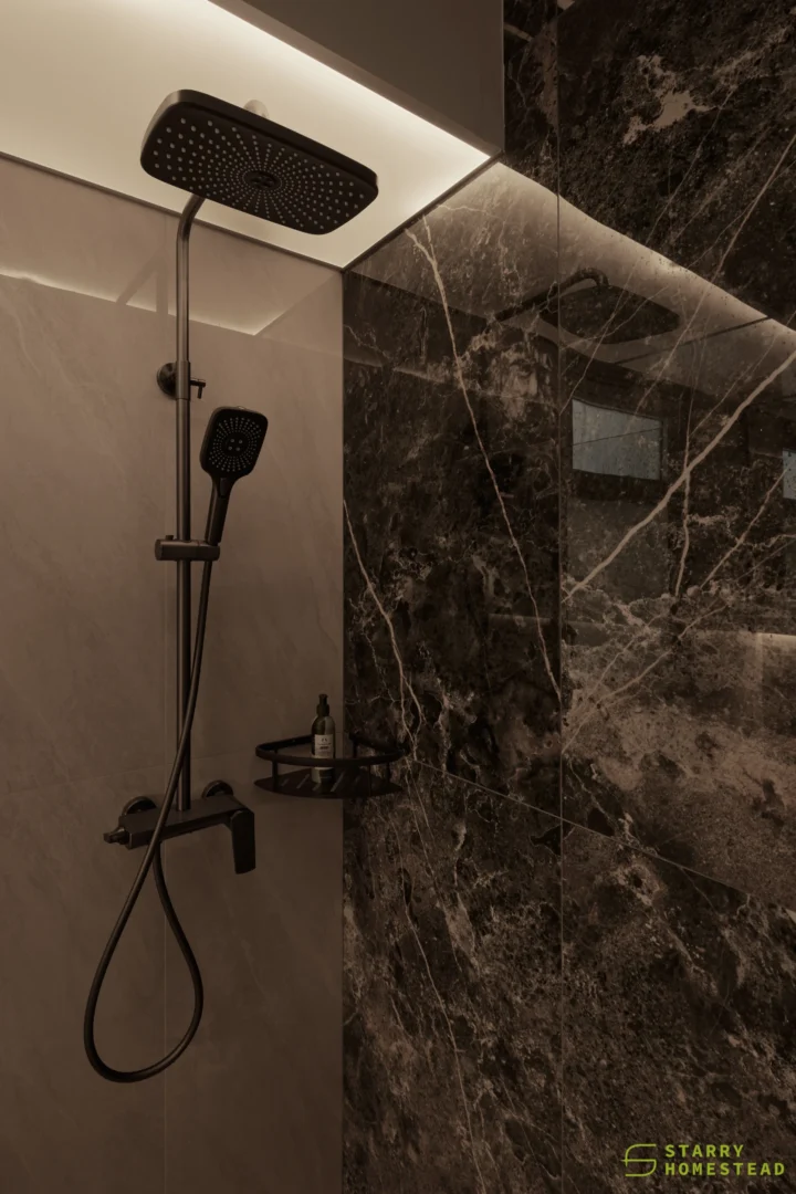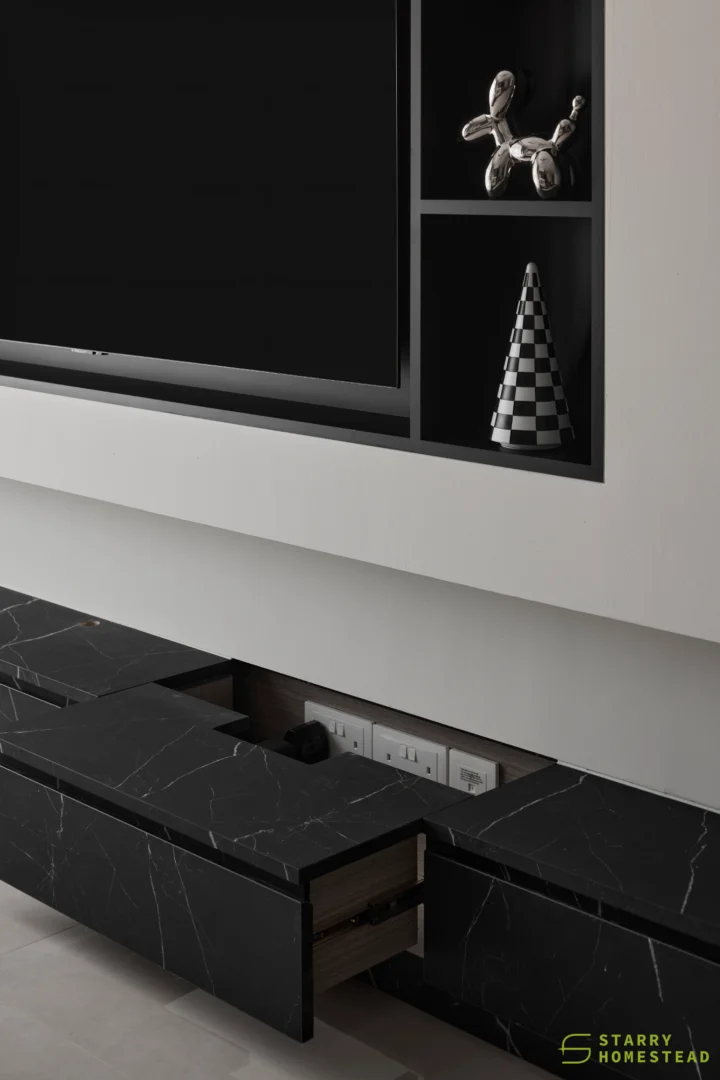 The design embodies a refined approach with a subtle expression of Light Luxury, inspired by a Modern Italian aesthetic. A low-saturation colour palette establishes a calm and elegant foundation, while dark wood laminate introduces depth and tactile warmth to the living spaces. Marble laminate accents add a layer of understated sophistication, creating visual interest without overwhelming the serene ambience. Generous negative space and integrated LED lighting further enhance the sense of openness and tranquillity, allowing key architectural and material details to take centre stage. Clean lines, bespoke cabinetry and thoughtful spatial planning contribute to a cohesive flow between zones, with careful attention to both functionality and quiet refinement. The result is an interior that feels contemporary yet timeless, relaxed yet polished — a harmonious balance of materiality, light and proportion that elevates everyday living.