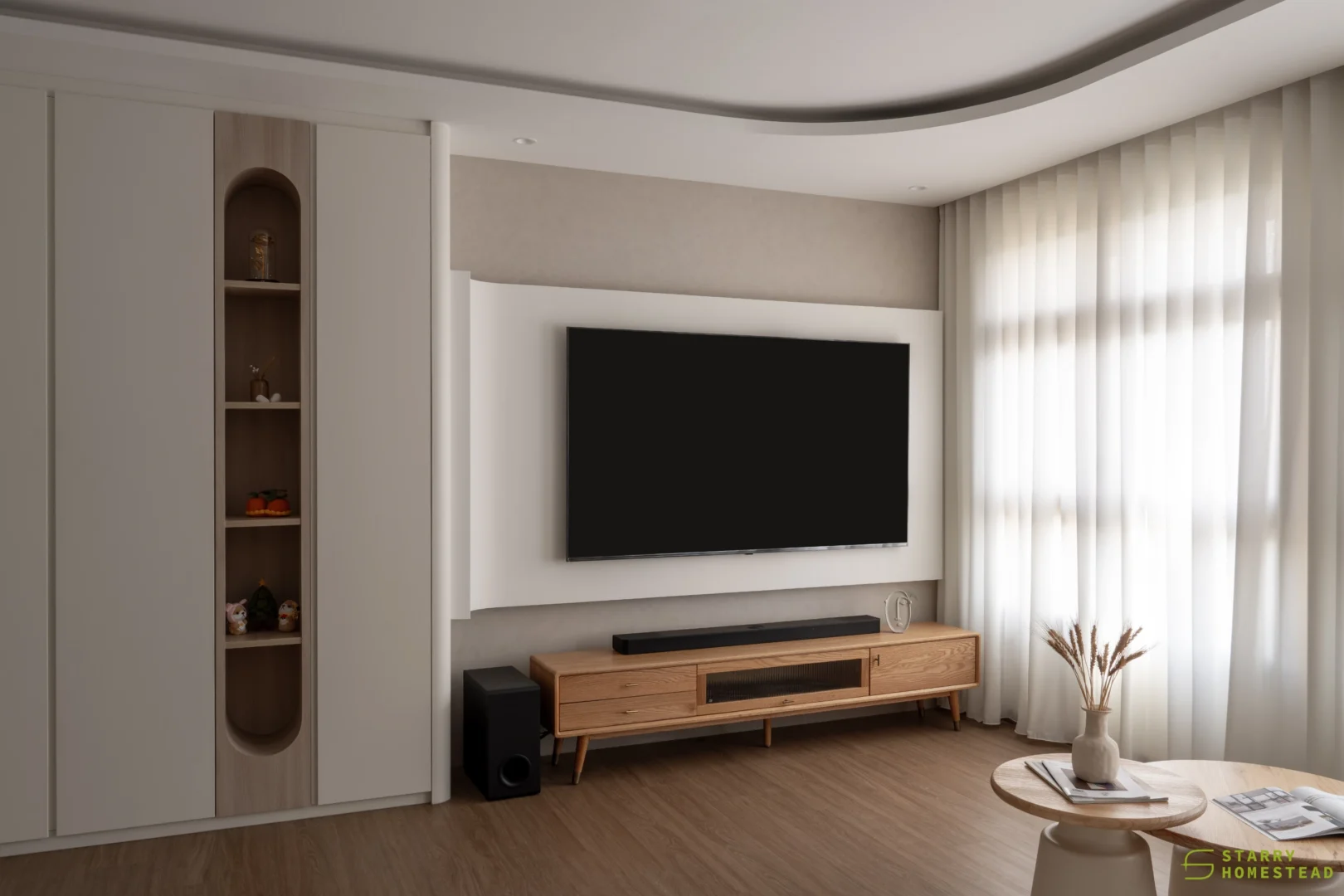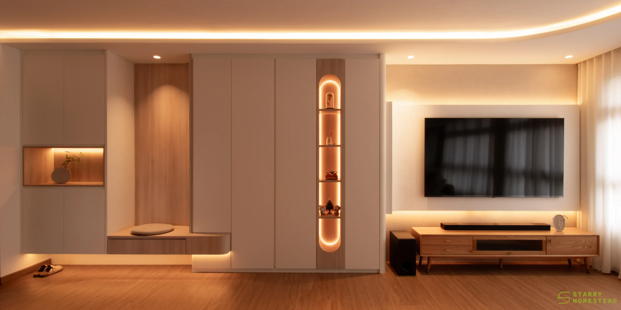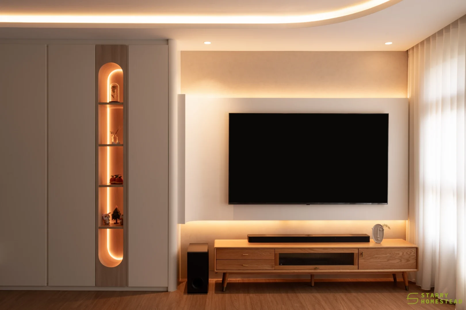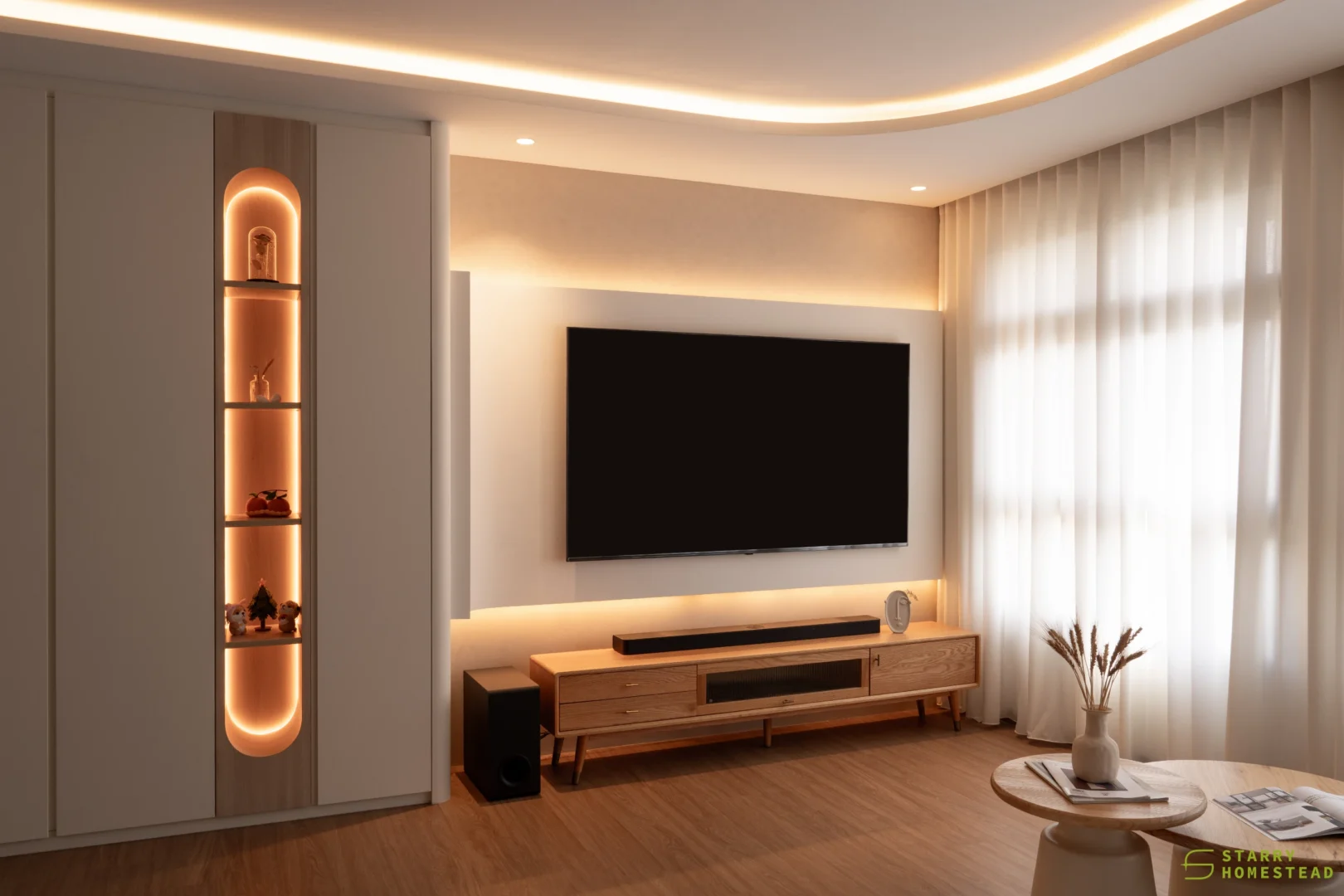 Modern Scandinavian design sets the tone for this thoughtfully curated home, where warmth, simplicity, and functionality combine to create a cosy sanctuary. The living room is anchored by a sculptural, full‑height multi‑functional TV wall with integrated shoe storage and concealed cabinetry, where gentle curves and subtle backlighting form a soft focal feature that balances practicality with visual elegance.