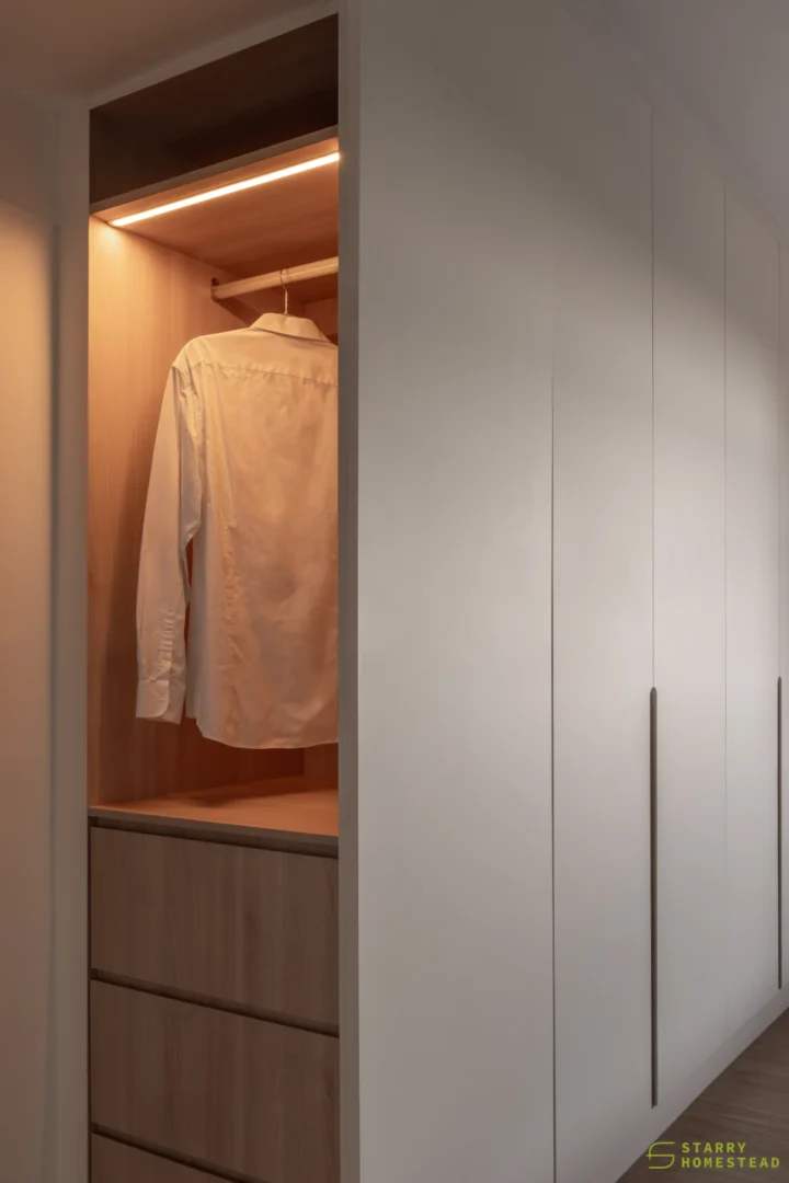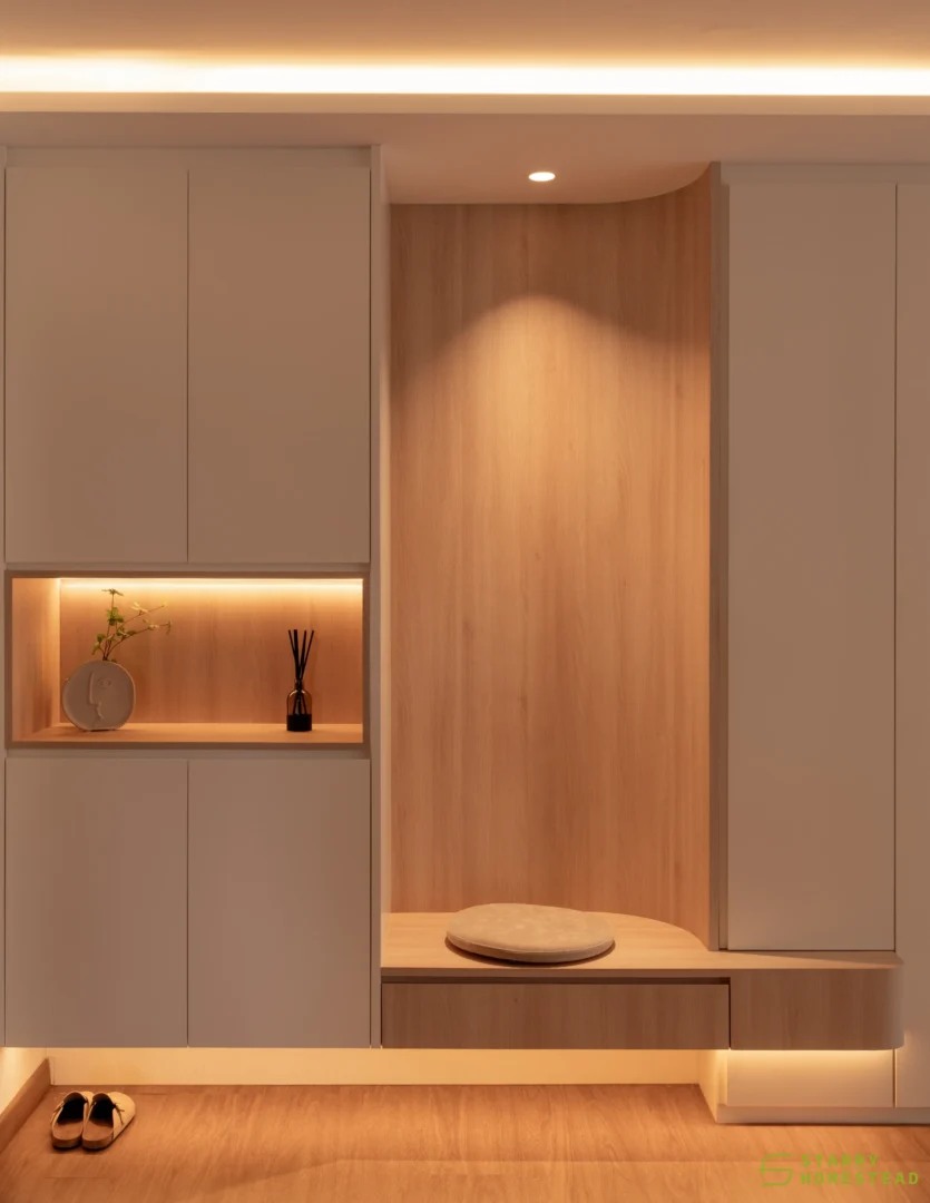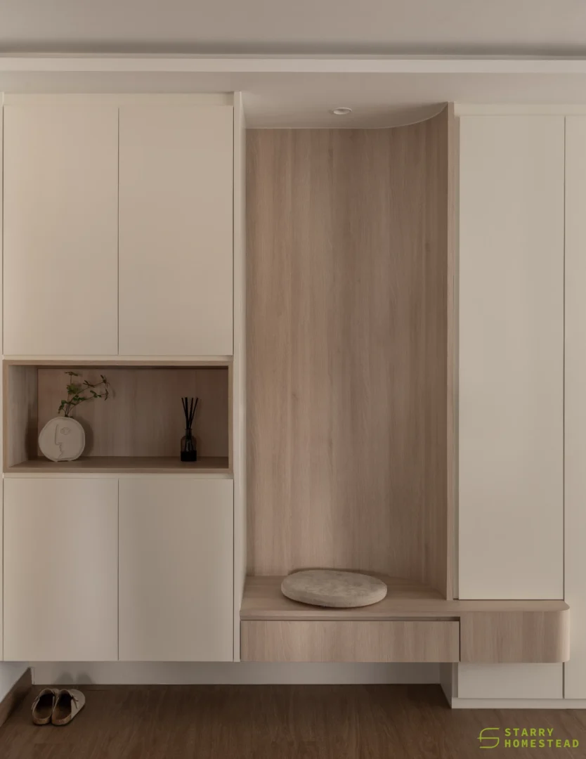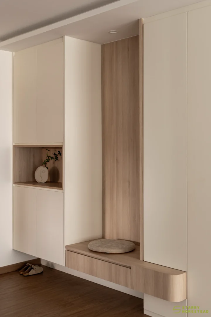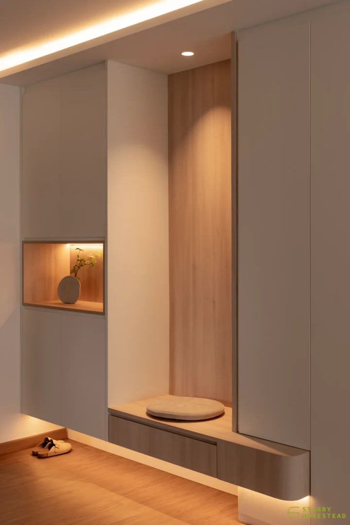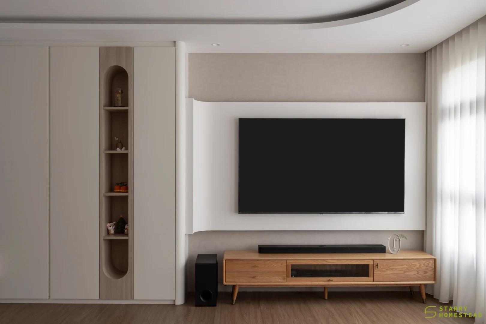 Modern Scandinavian design sets the tone for this thoughtfully curated home, where warmth, simplicity, and functionality combine to create a cosy sanctuary. The living room is anchored by a sculptural, full‑height multi‑functional TV wall with integrated shoe storage and concealed cabinetry, where gentle curves and subtle backlighting form a soft focal feature that balances practicality with visual elegance.