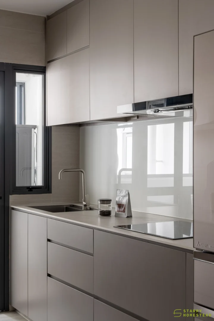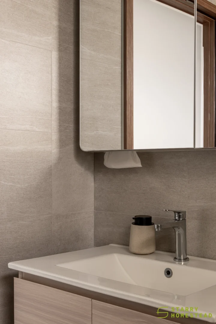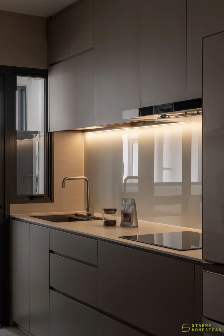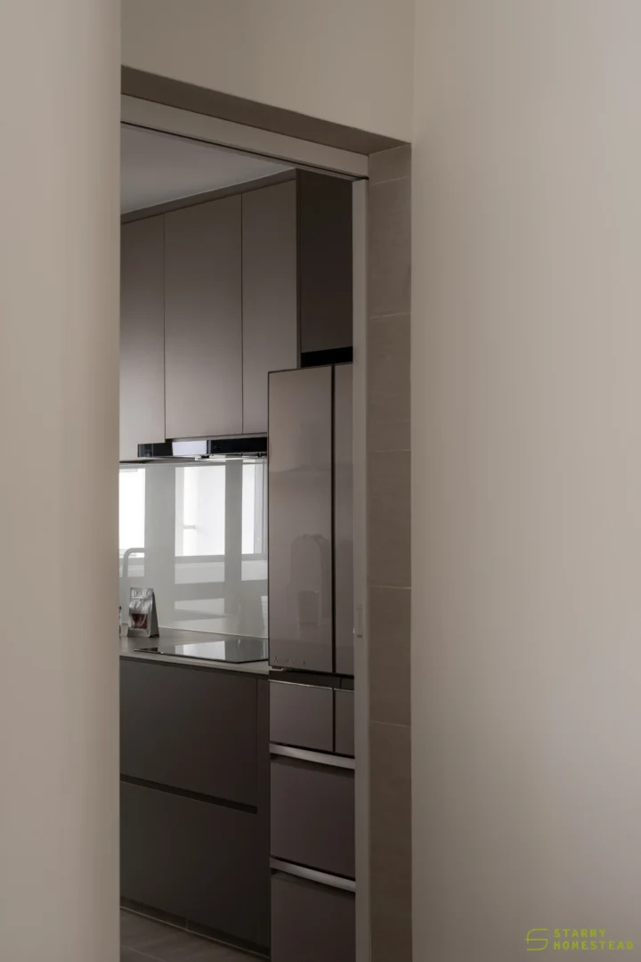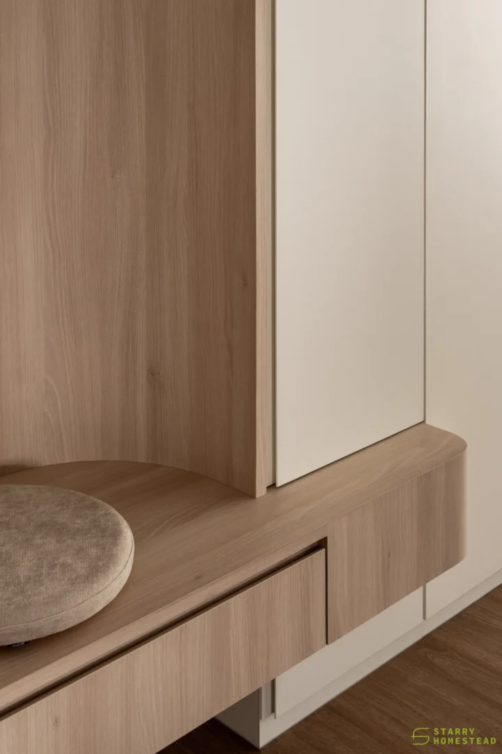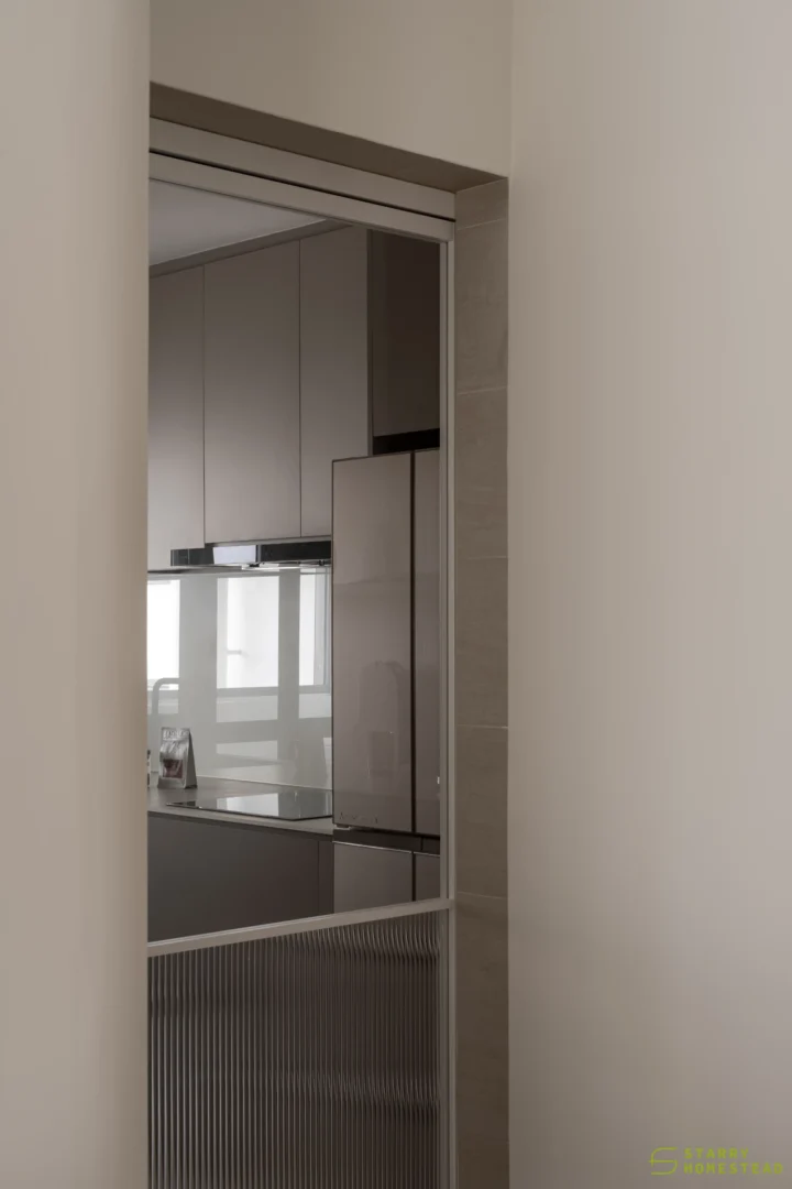 The spatial planning is further enhanced by an extended study area, reconfigured from a bedroom and enclosed with a glass partition overlooking the living space. This allows natural light to permeate the home while maintaining visual connectivity and a greater sense of openness. Clean lines are paired with soft textures and light-toned finishes, establishing a calm and inviting atmosphere throughout.