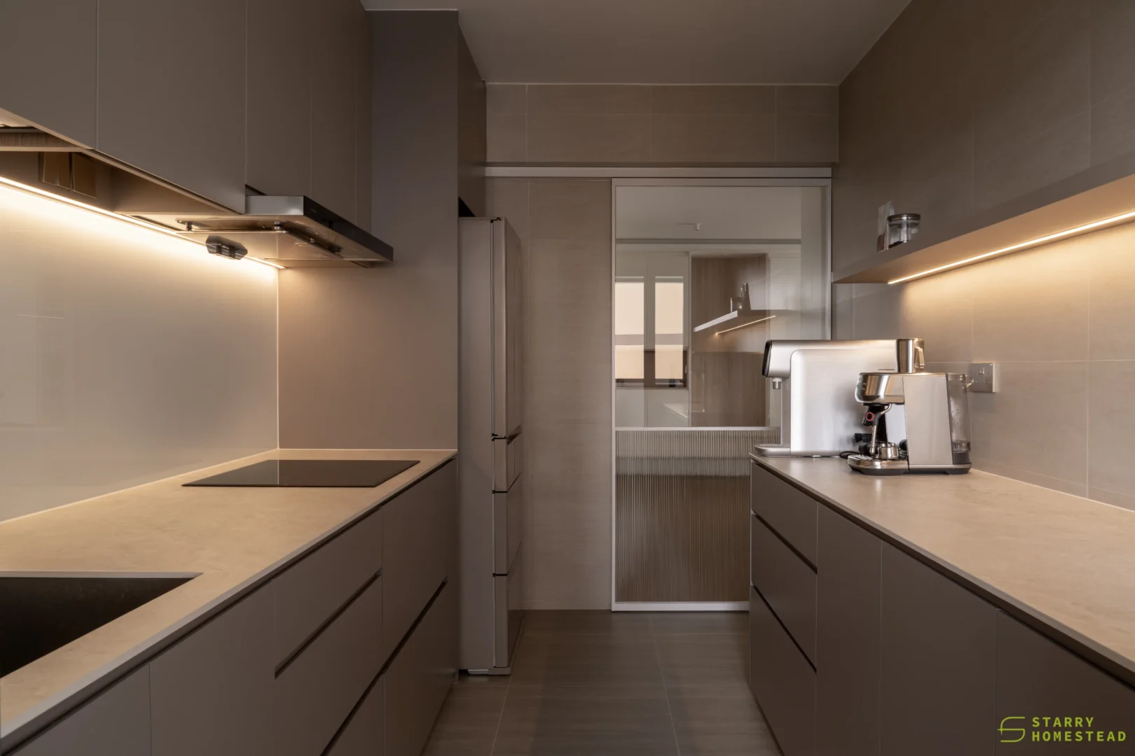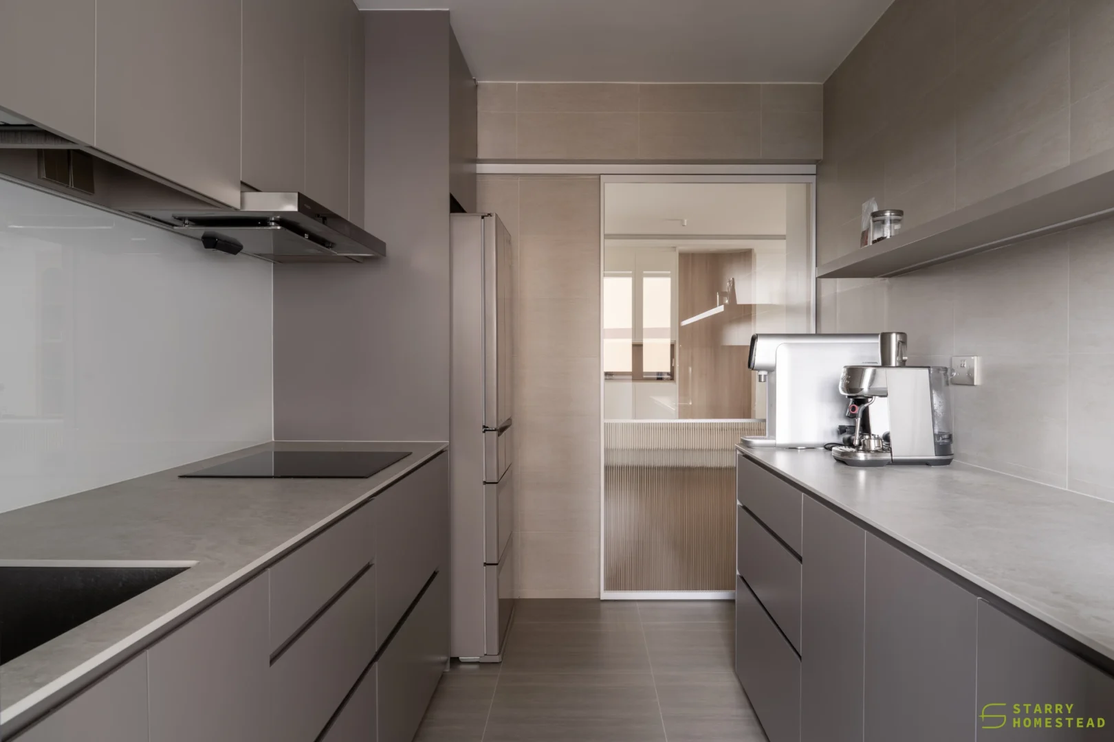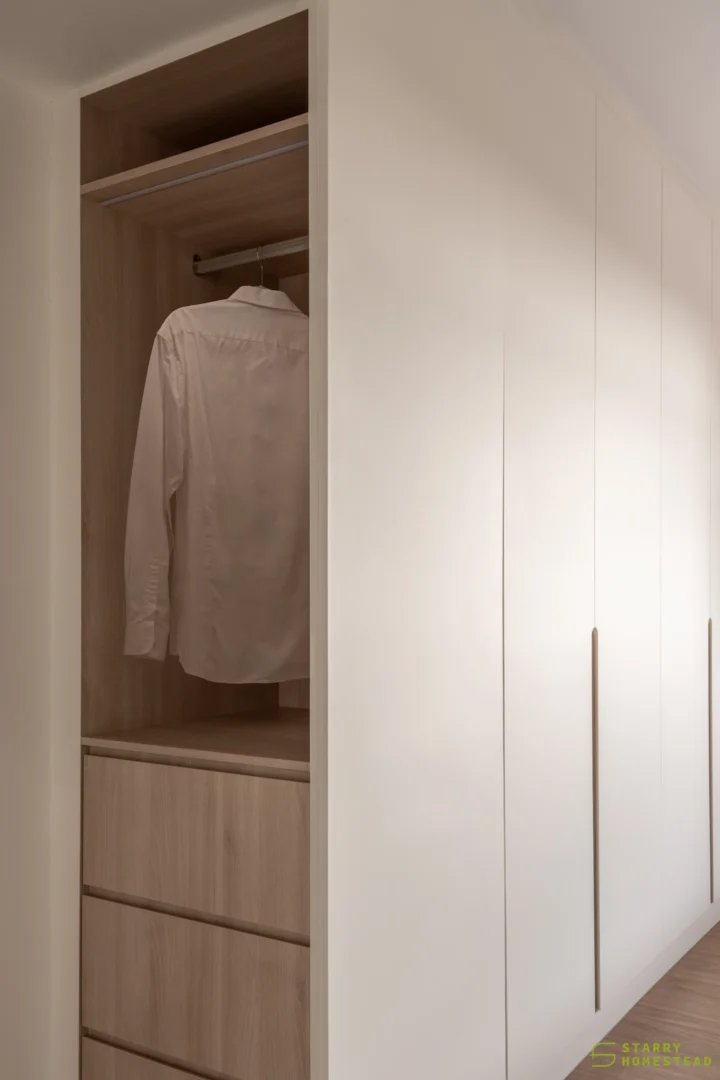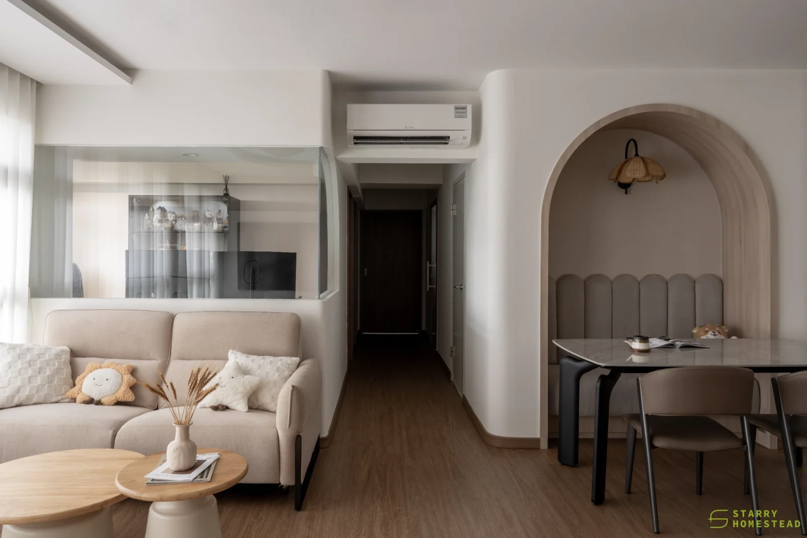 The spatial planning is further enhanced by an extended study area, reconfigured from a bedroom and enclosed with a glass partition overlooking the living space. This allows natural light to permeate the home while maintaining visual connectivity and a greater sense of openness. Clean lines are paired with soft textures and light-toned finishes, establishing a calm and inviting atmosphere throughout.