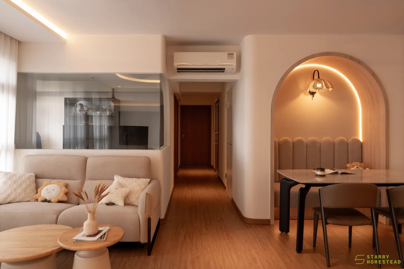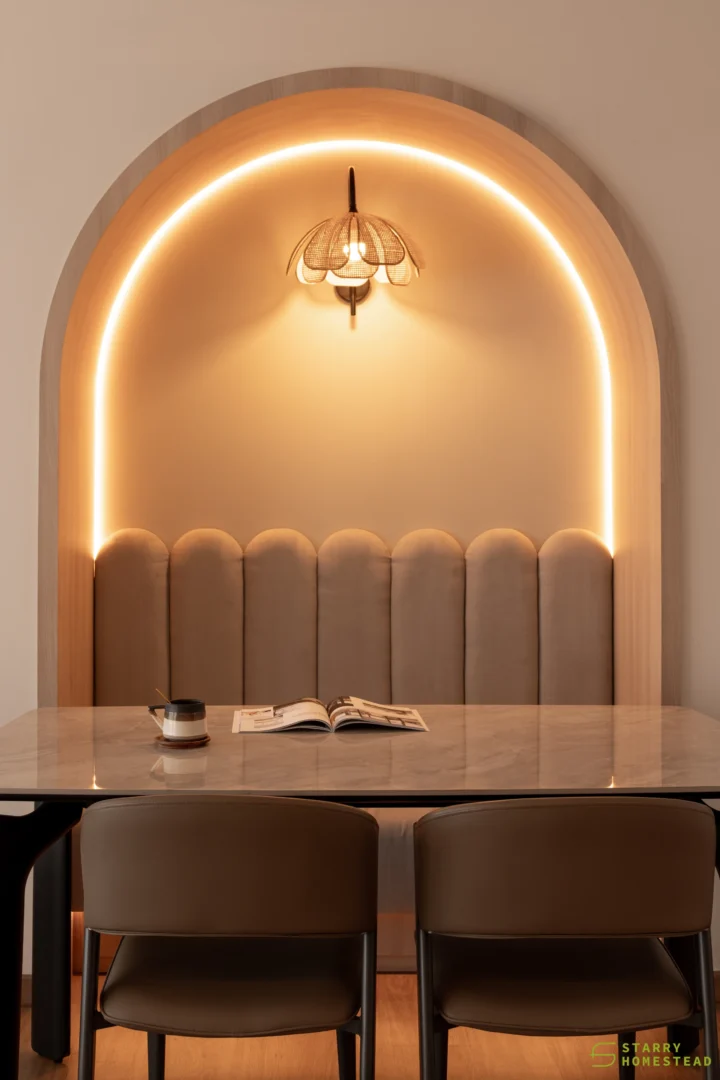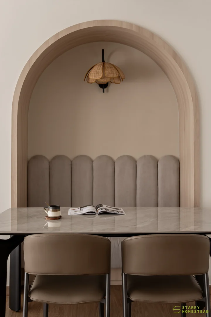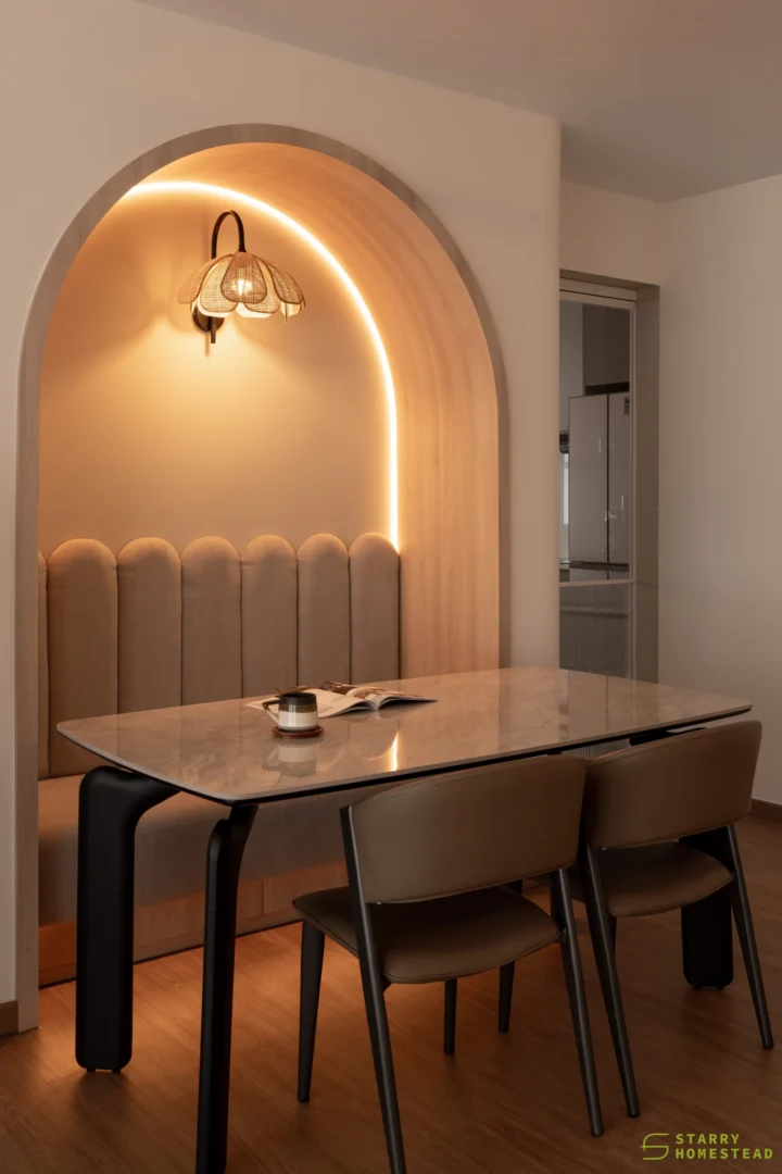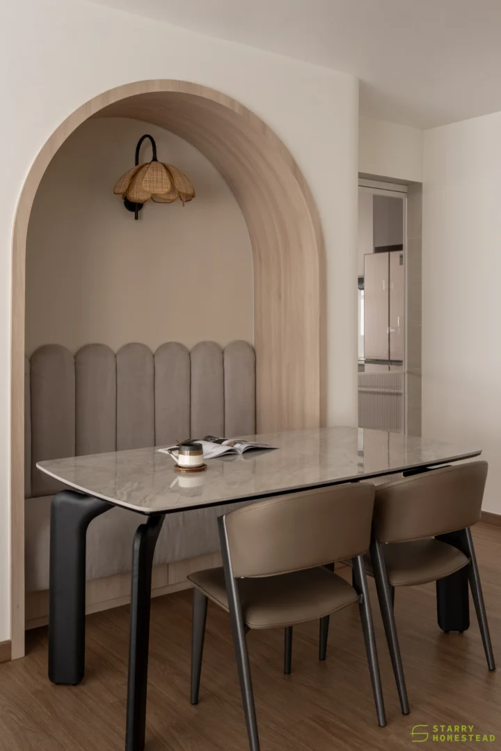 In the dining area, a gently curved wall introduces a distinctive yet understated design element, softening transitions and adding depth to the space. Curved motifs are echoed throughout, from the false ceiling to the rounded corners, creating a sense of fluidity and cohesion.