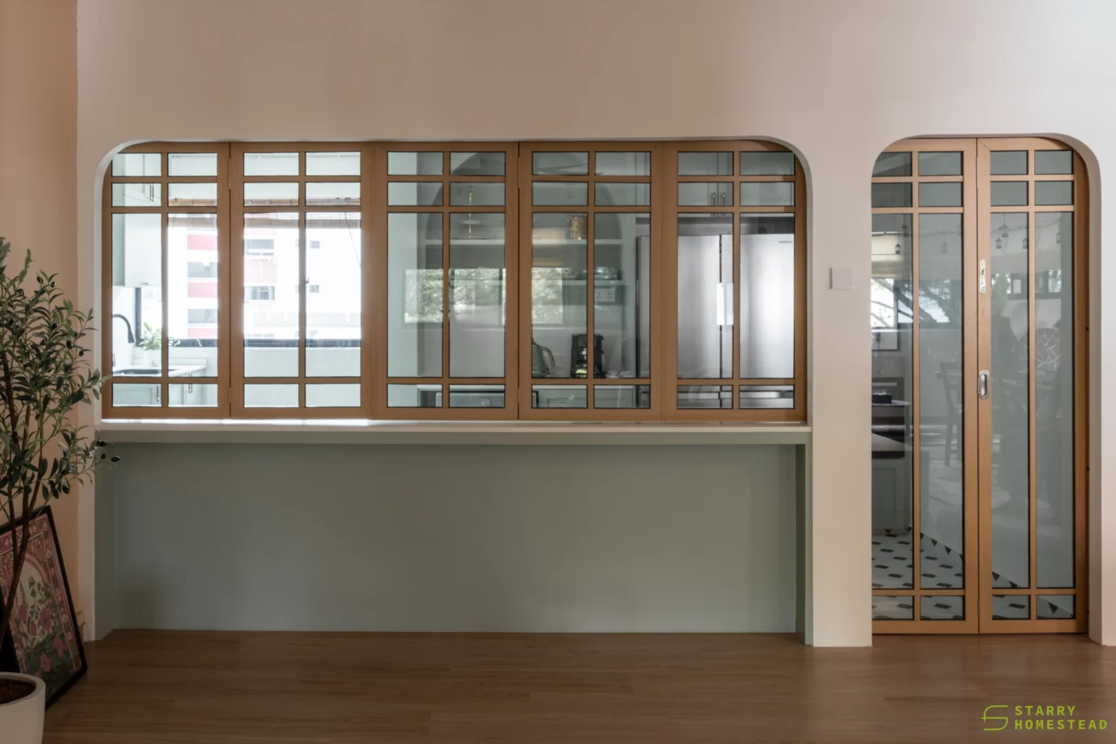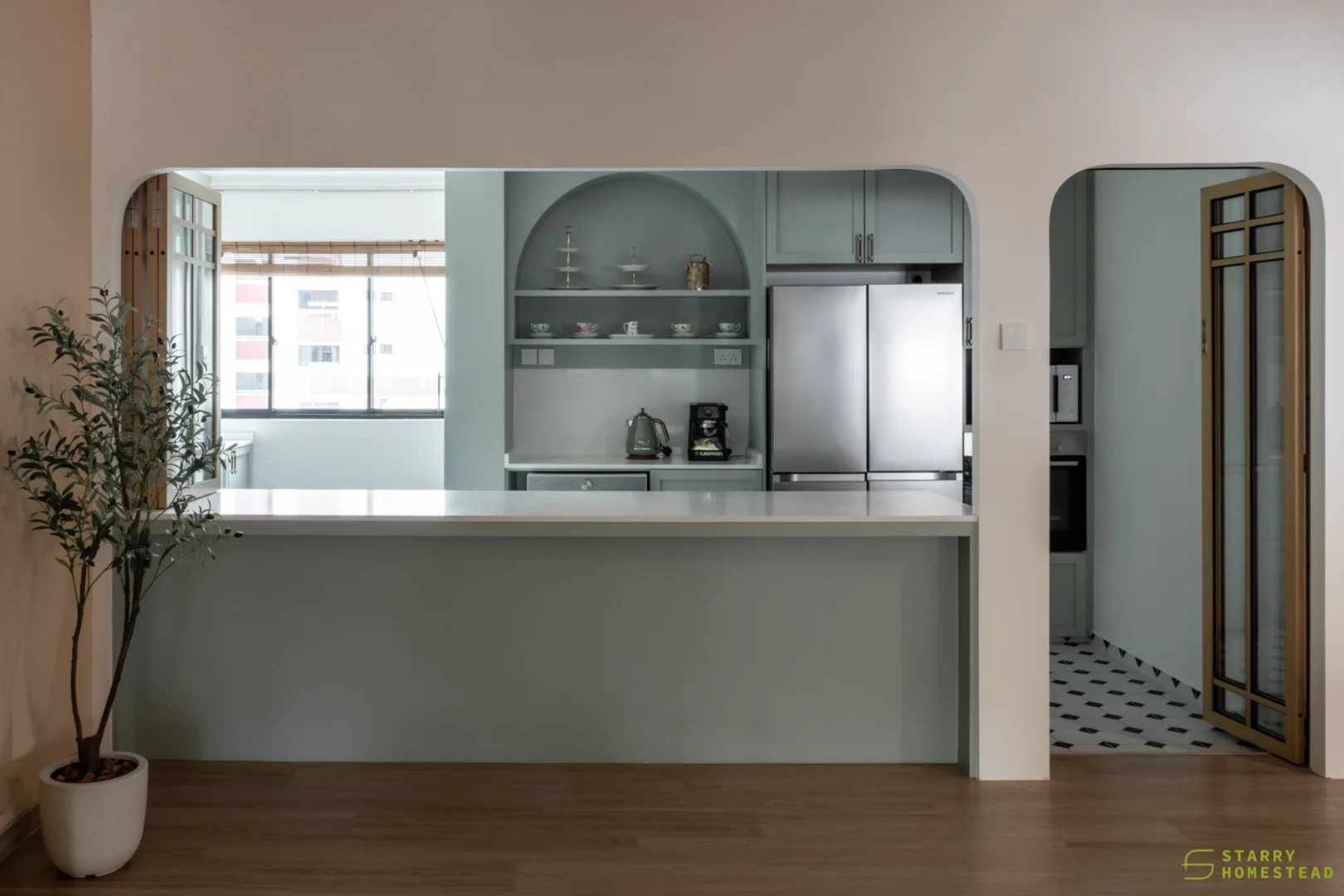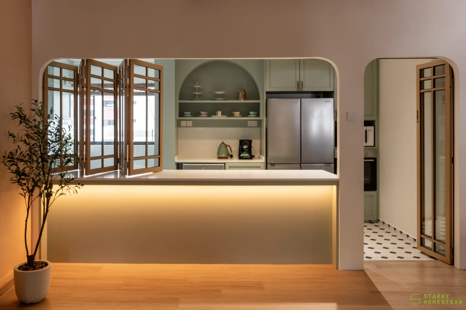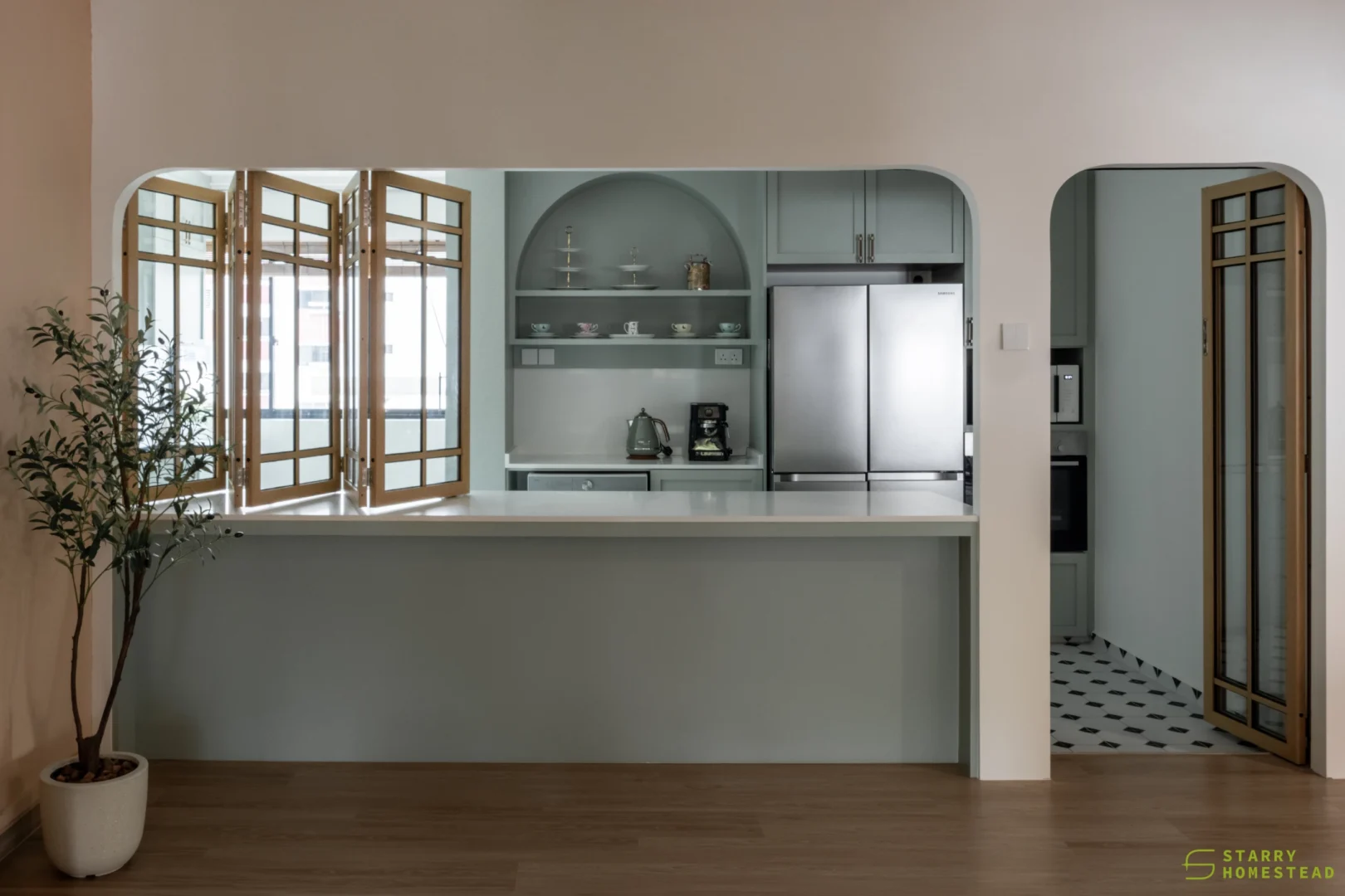 This design journey begins with a Modern Muji aesthetic in the living room, where a serene and clutter-free atmosphere creates an immediate sense of calm. The focal point is a TV cabinet that reimagines traditional Japanese shoji doors as functional sliding panels, gracefully gliding to reveal or conceal media, display shelving, and storage. This Japanese influence flows seamlessly into the semi-open kitchen, connected by a foldable window designed with matching wooden frames and glass. This versatile feature serves as a functional partition when closed, yet effortlessly transforms into a social bar counter and dining extension when folded open. Inside, the Modern Farmhouse style takes over, featuring cabinetry in a soothing sage green that provides a soft, organic warmth. The look is completed by black and white chequered flooring, adding a bold, graphic punch that perfectly balances the Zen-like living space with rustic, contemporary charm.