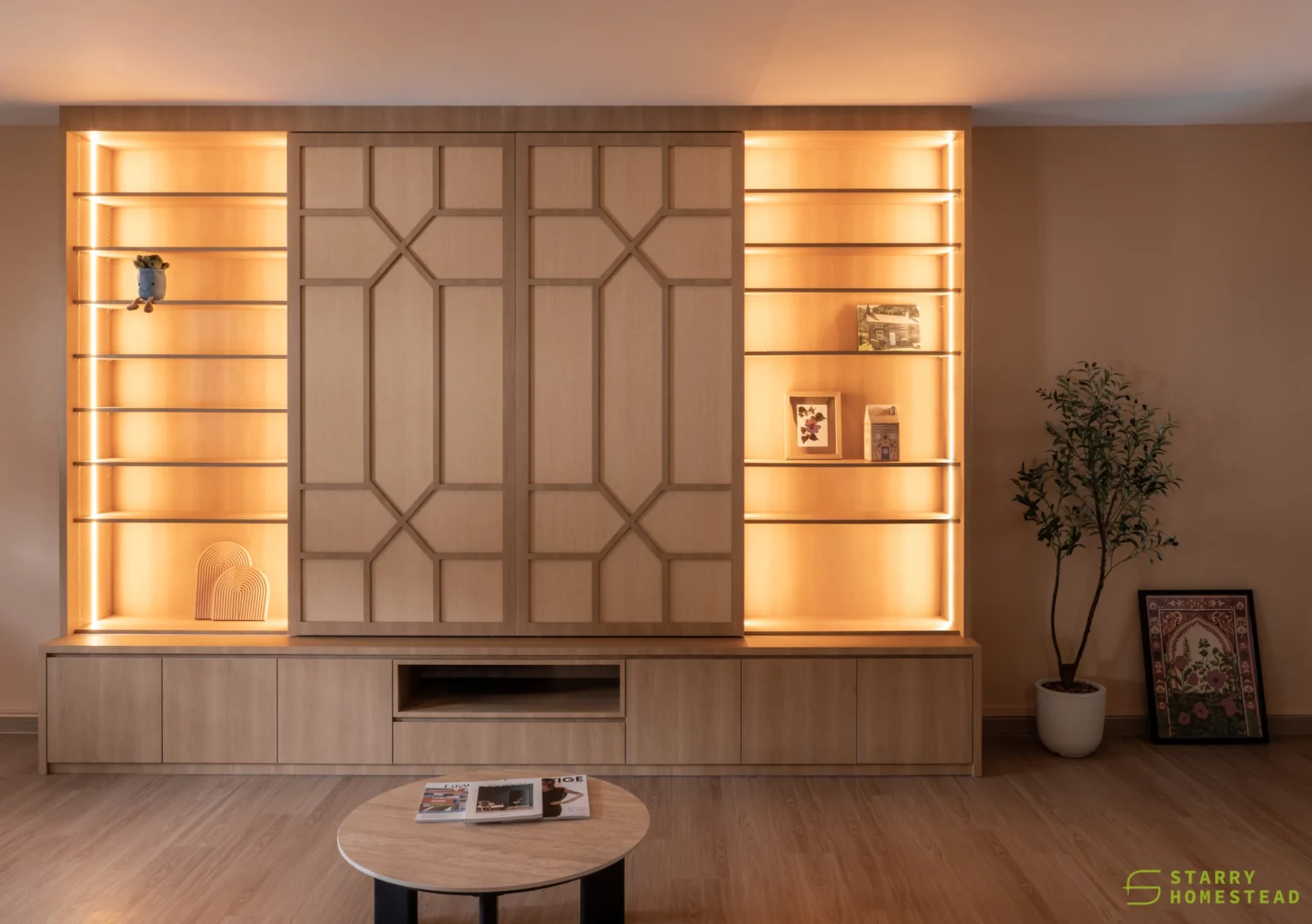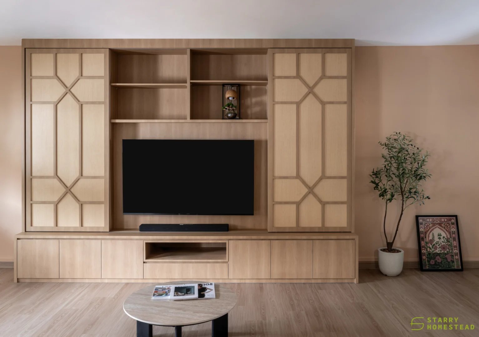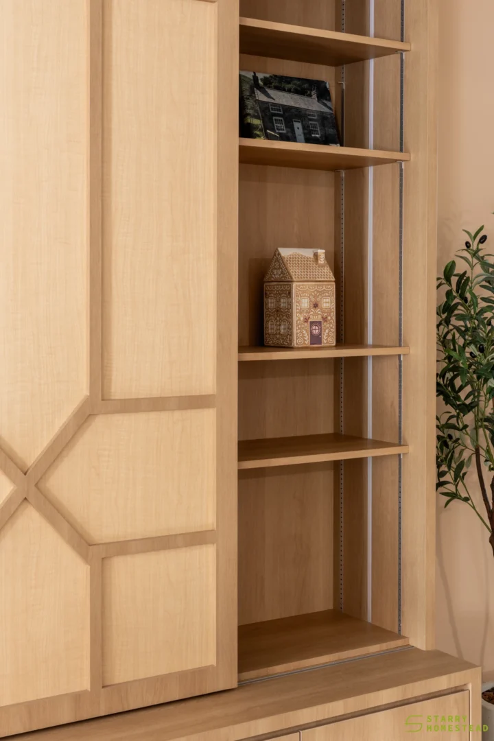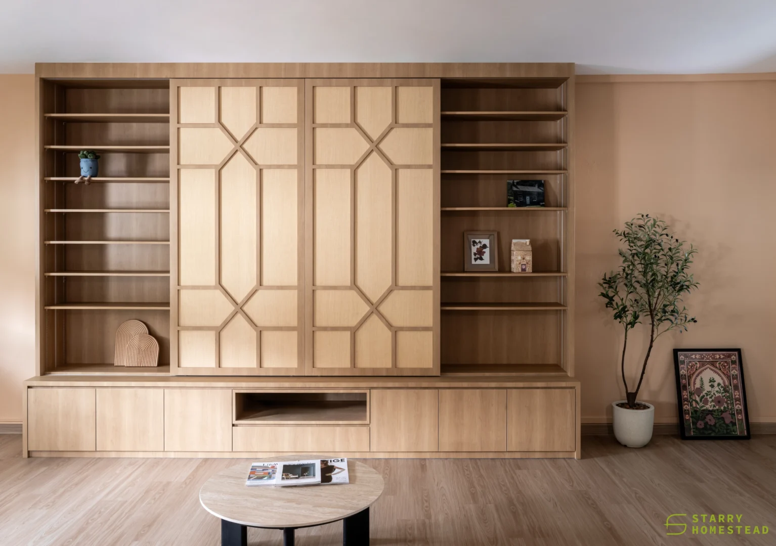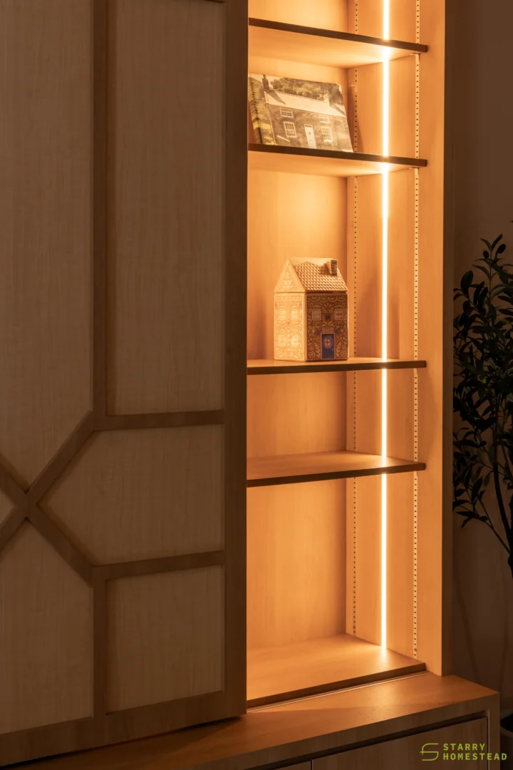 This design journey begins with a Modern Muji aesthetic in the living room, where a serene and clutter-free atmosphere creates an immediate sense of calm. The focal point is a TV cabinet that reimagines traditional Japanese shoji doors as functional sliding panels, gracefully gliding to reveal or conceal media, display shelving, and storage. This Japanese influence flows seamlessly into the semi-open kitchen, connected by a foldable window designed with matching wooden frames and glass. This versatile feature serves as a functional partition when closed, yet effortlessly transforms into a social bar counter and dining extension when folded open. Inside, the Modern Farmhouse style takes over, featuring cabinetry in a soothing sage green that provides a soft, organic warmth. The look is completed by black and white chequered flooring, adding a bold, graphic punch that perfectly balances the Zen-like living space with rustic, contemporary charm.