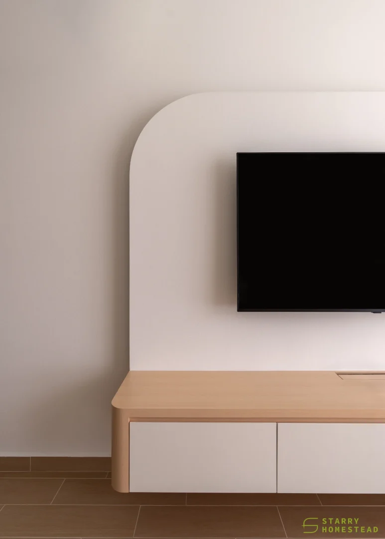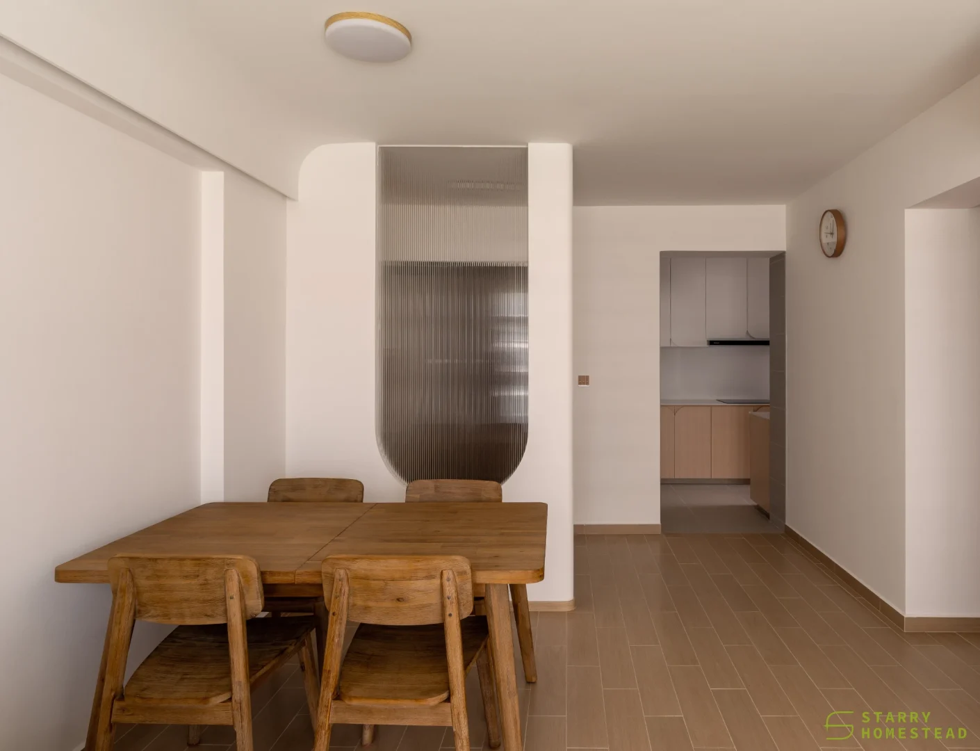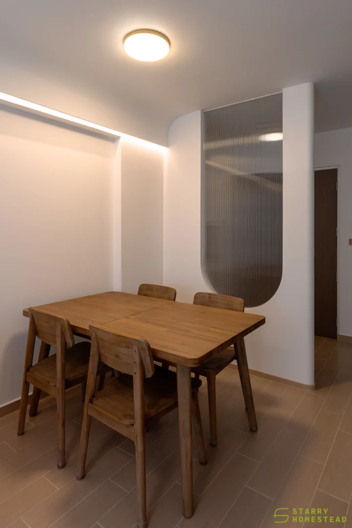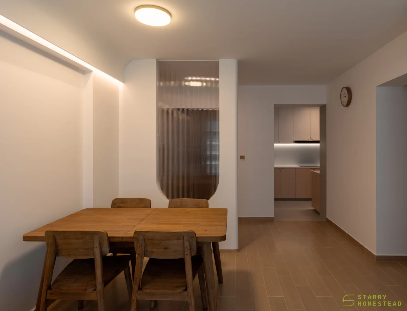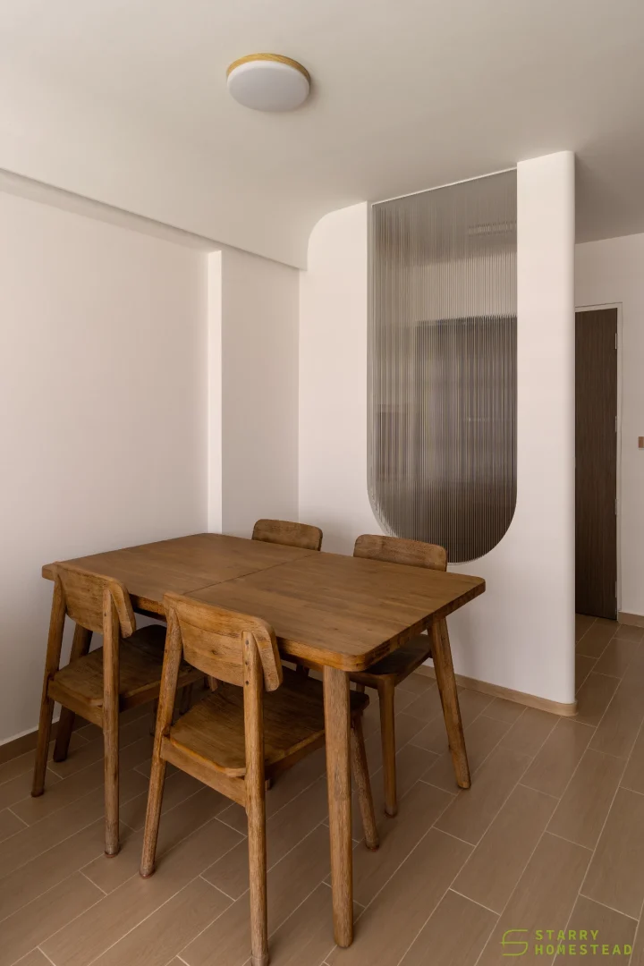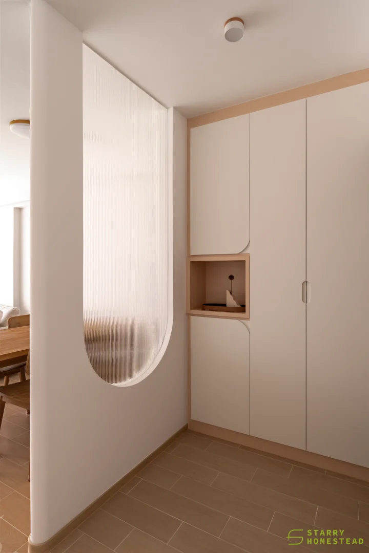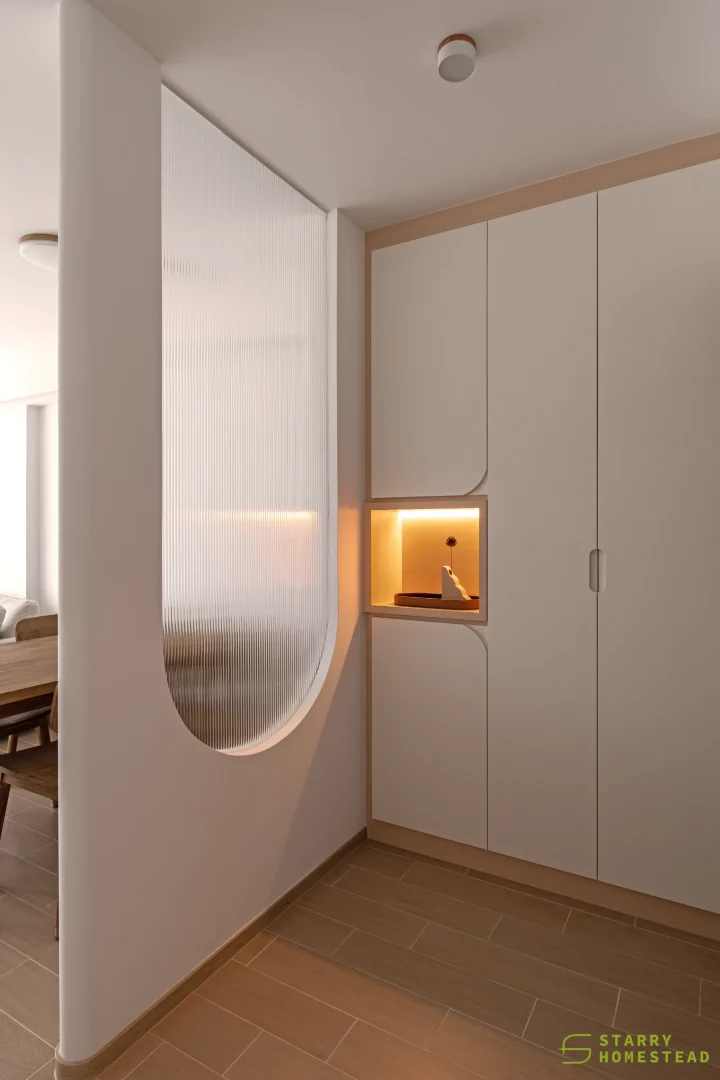 Modern Scandinavian influences define the space, creating a bright, clean, and comfortable interior. Curved elements soften the layout, adding gentle accents that enhance both flow and safety. A curved feature wall paired with reeded glass brings a touch of modern elegance while allowing natural light to fill the foyer, enhancing brightness and openness. The palette of white and warm wood tones creates a sense of inclusiveness and warmth, while contemporary forms maintain a rational, balanced aesthetic. Every detail is carefully considered, resulting in a harmonious blend of practicality and visual appeal. The design embodies the idea that even in modern living, warmth and inclusiveness remain essential.