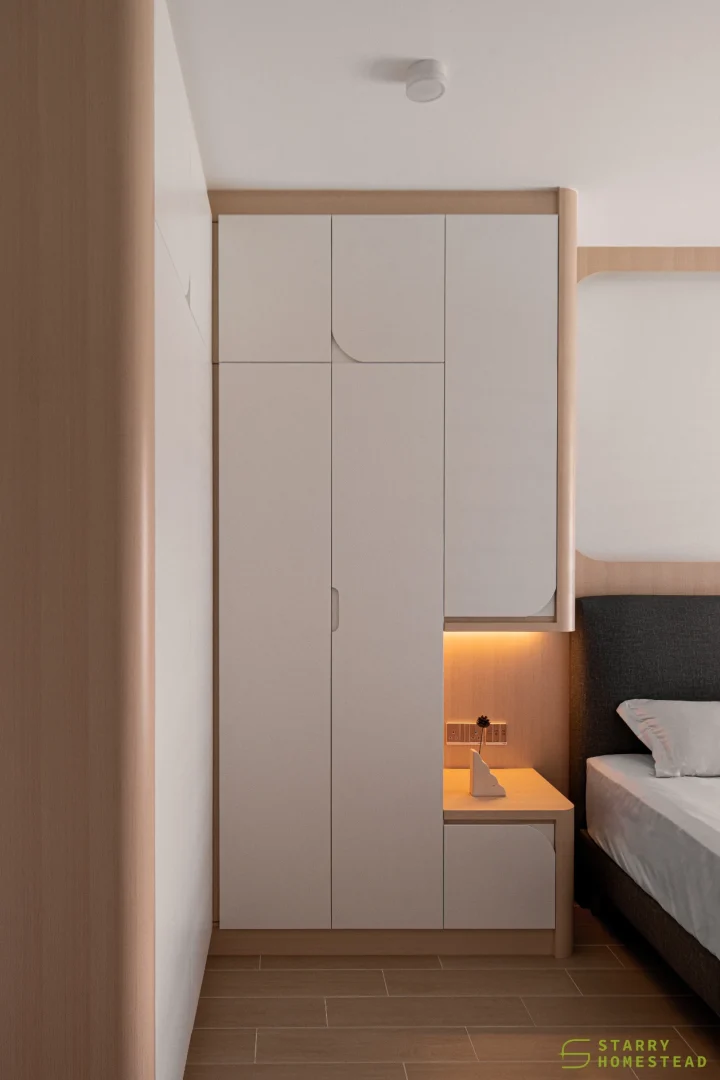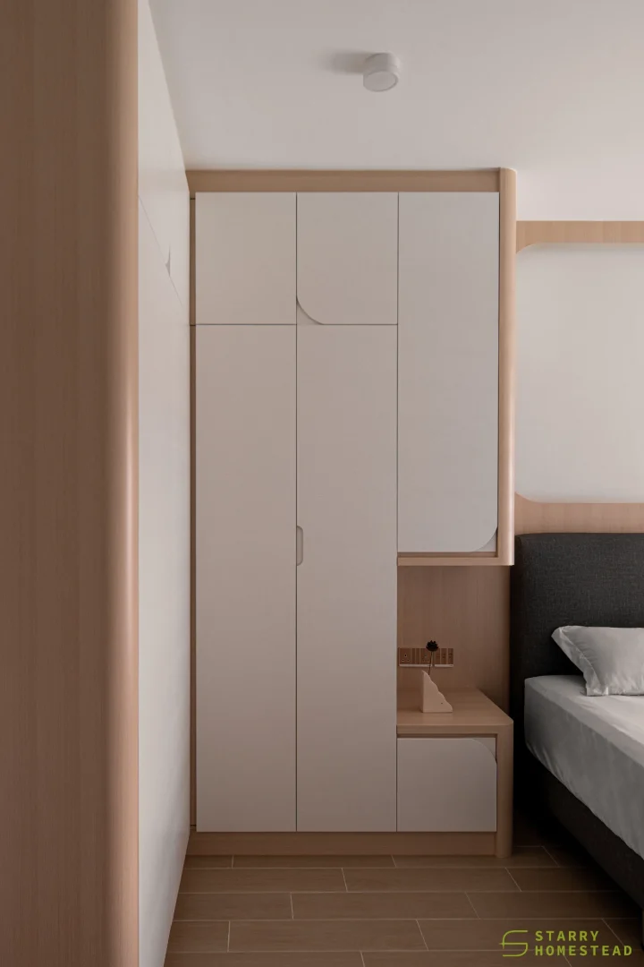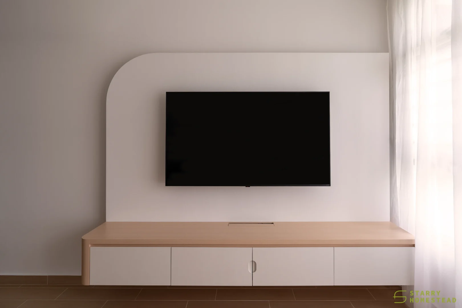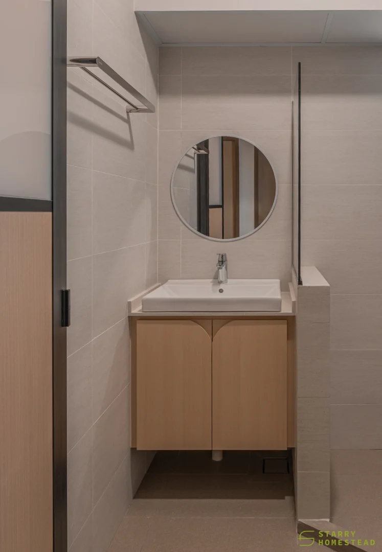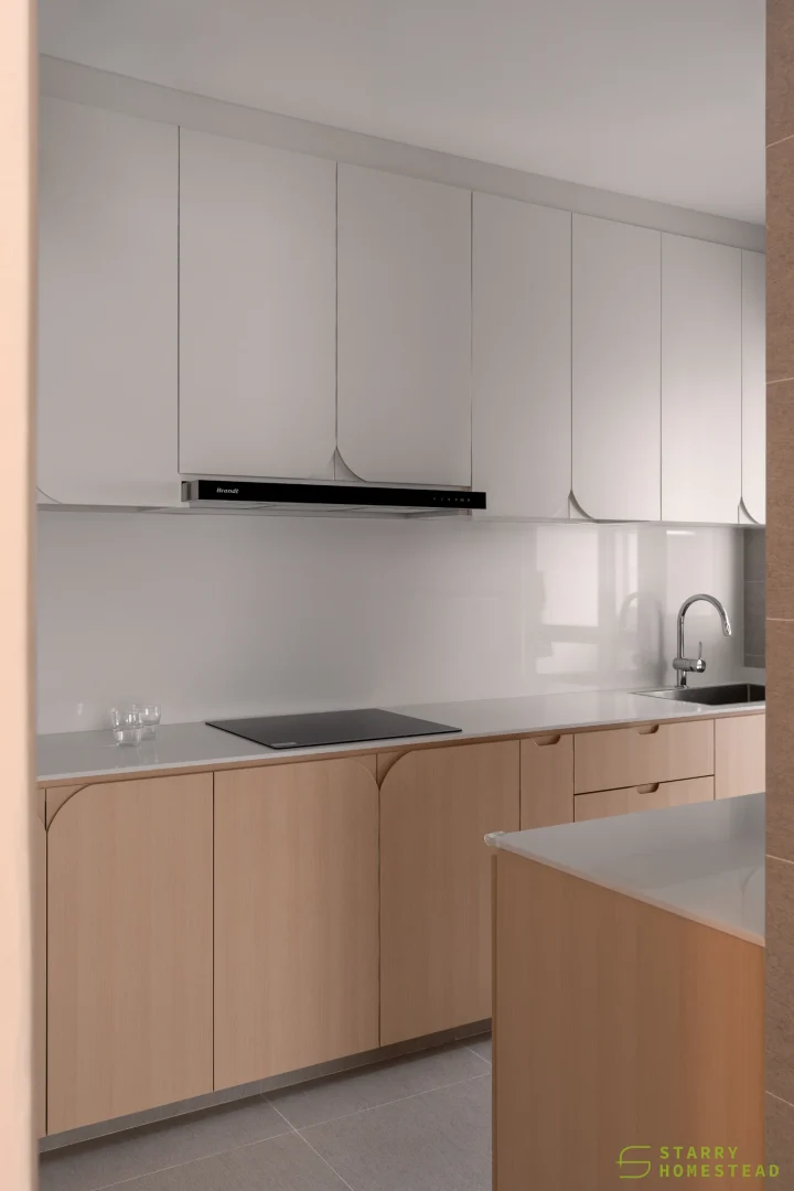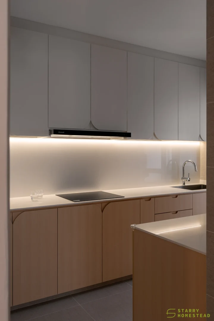 Modern Scandinavian influences define the space, creating a bright, clean, and comfortable interior. Curved elements soften the layout, adding gentle accents that enhance both flow and safety. A curved feature wall paired with reeded glass brings a touch of modern elegance while allowing natural light to fill the foyer, enhancing brightness and openness. The palette of white and warm wood tones creates a sense of inclusiveness and warmth, while contemporary forms maintain a rational, balanced aesthetic. Every detail is carefully considered, resulting in a harmonious blend of practicality and visual appeal. The design embodies the idea that even in modern living, warmth and inclusiveness remain essential.