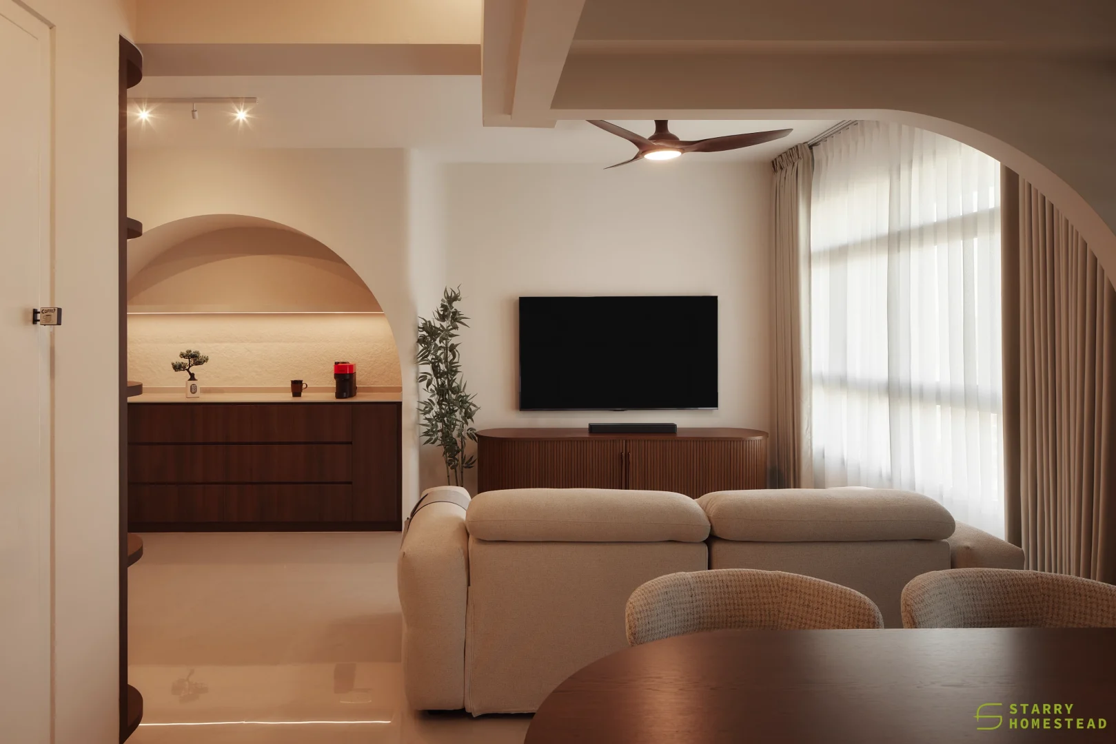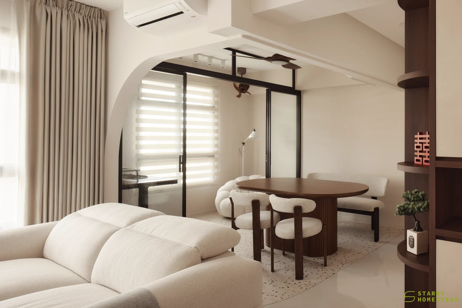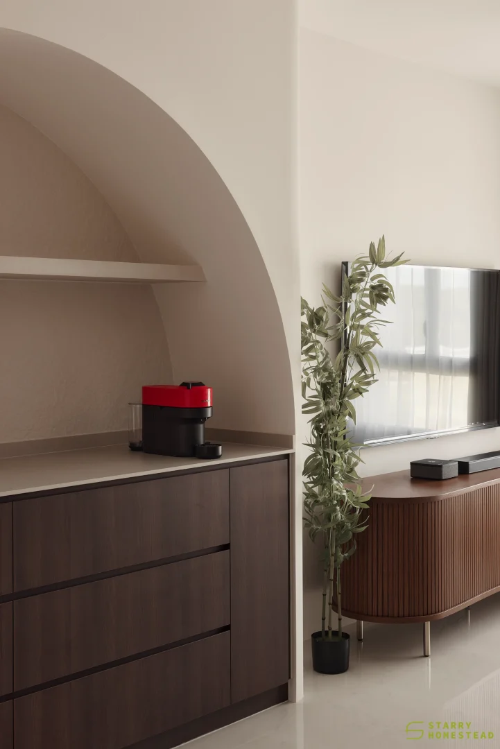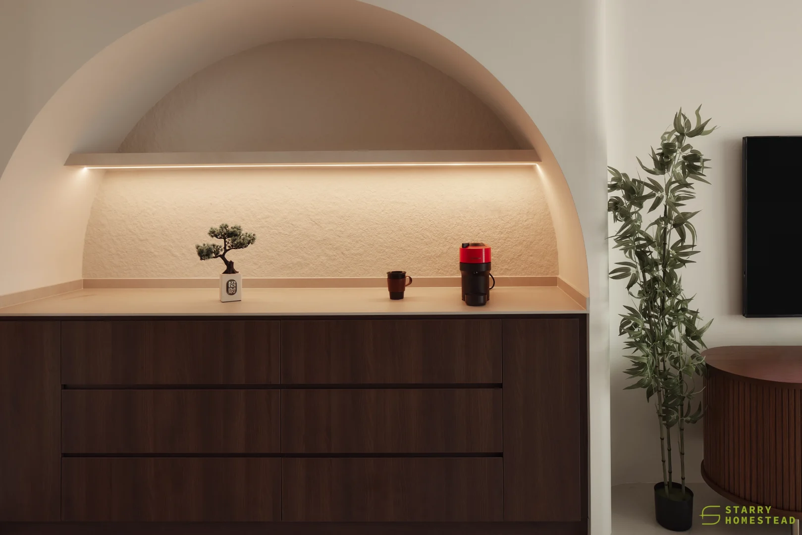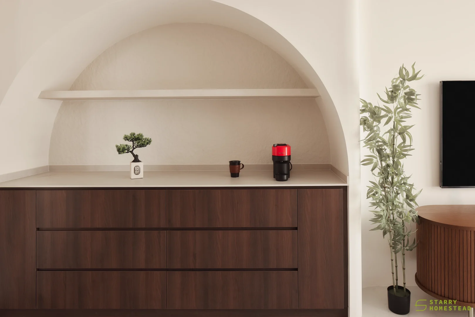Wabi-sabi approach guides the design, embracing simplicity, calm, and the beauty of natural imperfection. Dark wood elements set a warm and grounded atmosphere, enhancing a comforting and cosy environment throughout. Soft curves work alongside limewash-pattern laminates and eco clay walls, adding tactile character where every imperfect texture is celebrated. To optimise functionality and flow, a wall was removed to transform the former bedroom into a combined dining and study area. The result is a serene yet practical living space, where mindful design elevates everyday life.