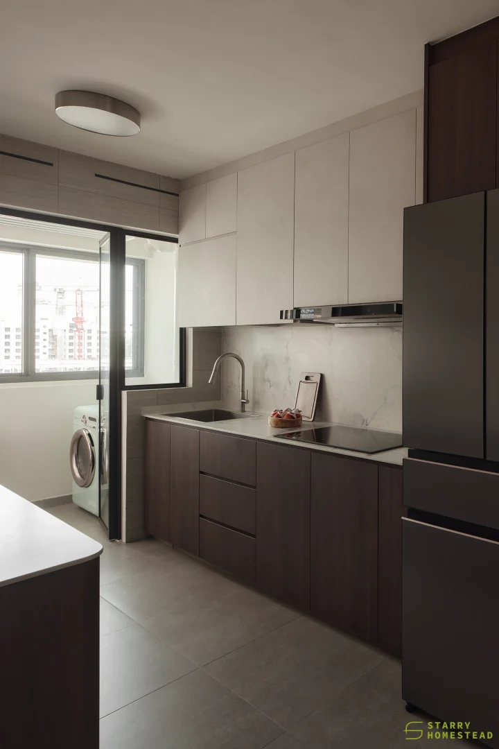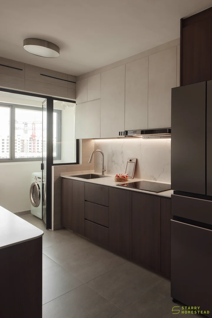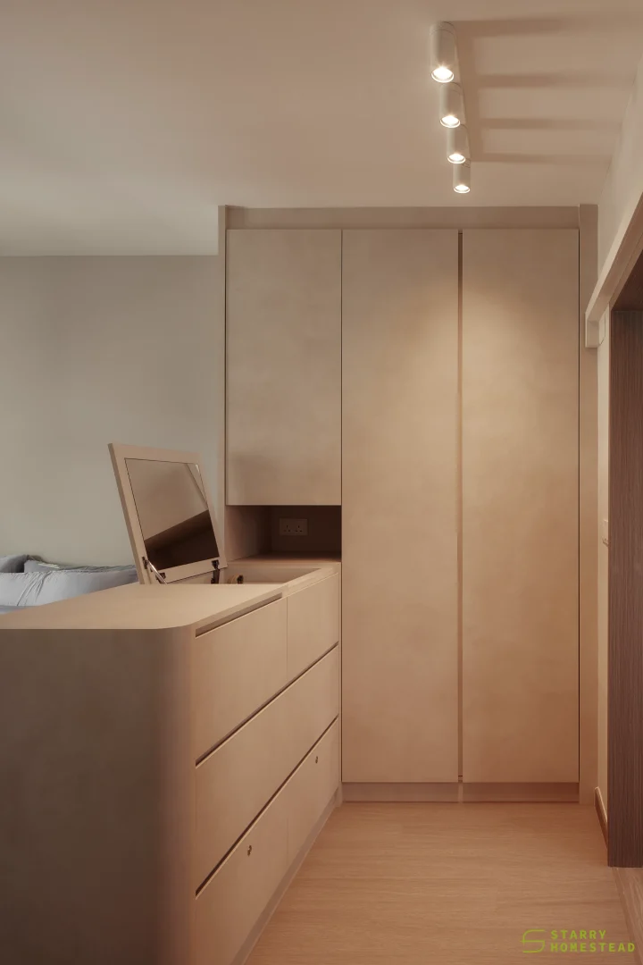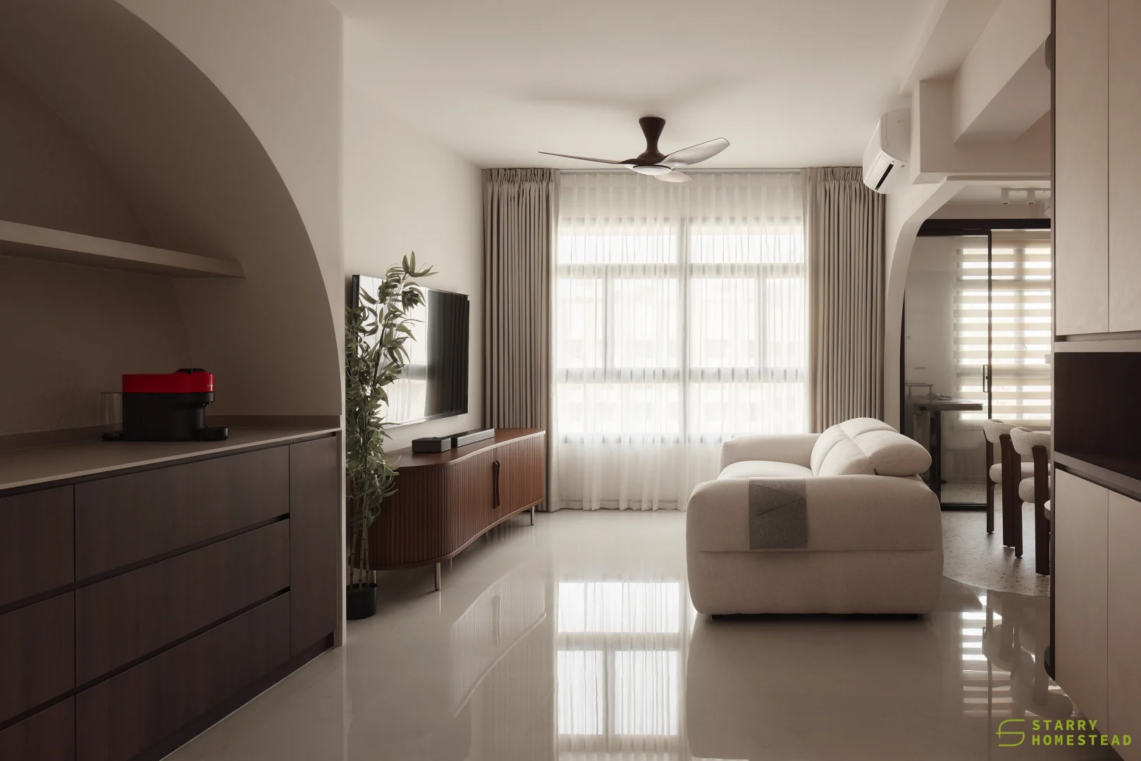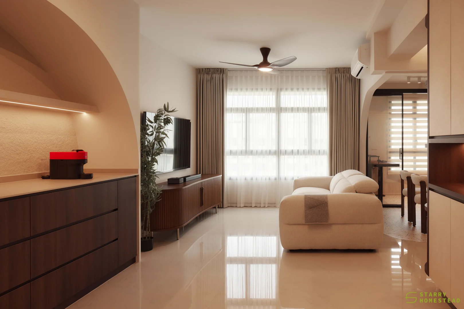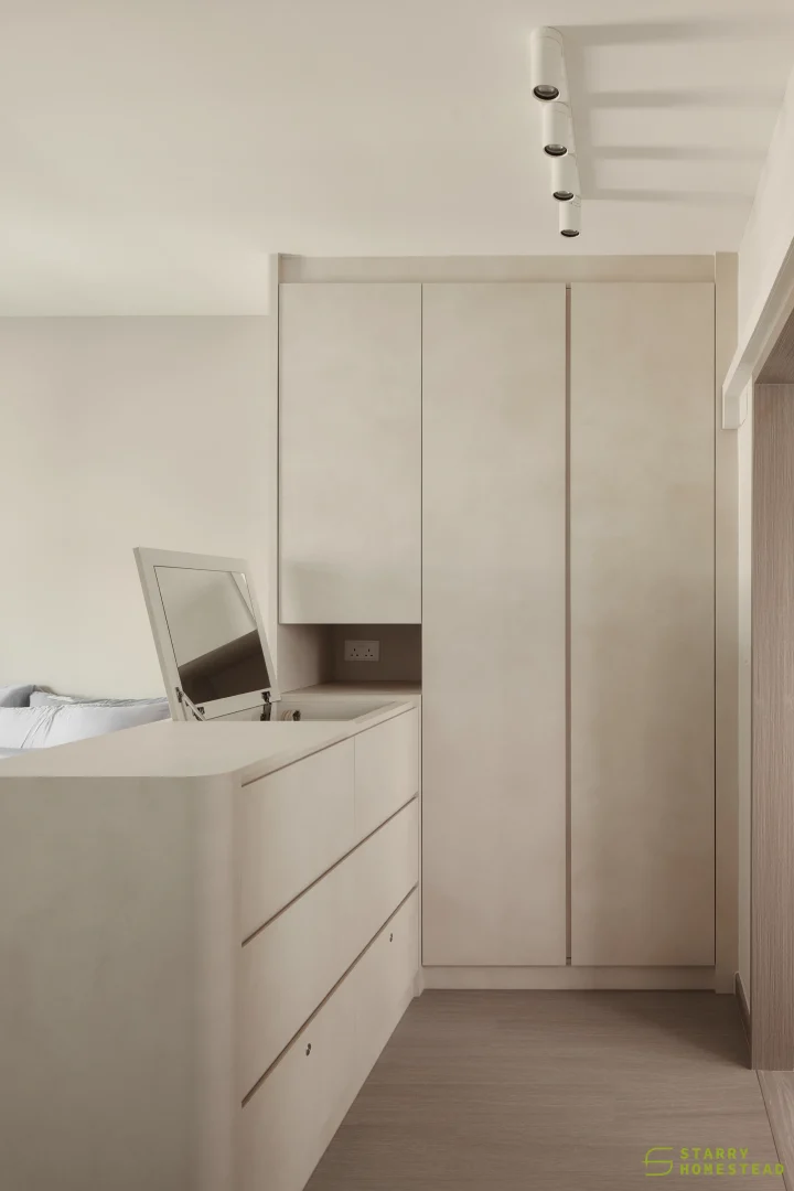 Wabi-sabi approach guides the design, embracing simplicity, calm, and the beauty of natural imperfection. Dark wood elements set a warm and grounded atmosphere, enhancing a comforting and cosy environment throughout. Soft curves work alongside limewash-pattern laminates and eco clay walls, adding tactile character where every imperfect texture is celebrated. To optimise functionality and flow, a wall was removed to transform the former bedroom into a combined dining and study area. The result is a serene yet practical living space, where mindful design elevates everyday life.