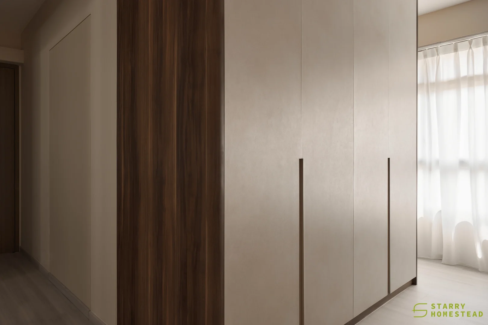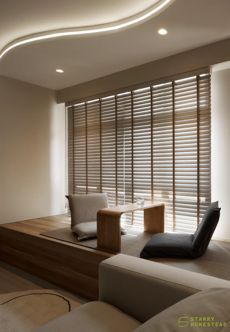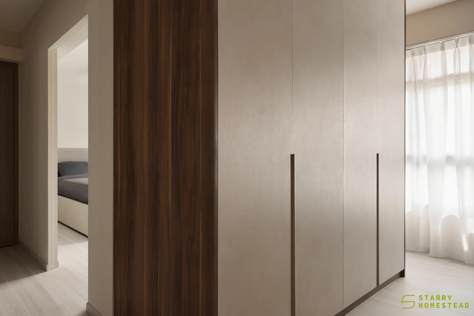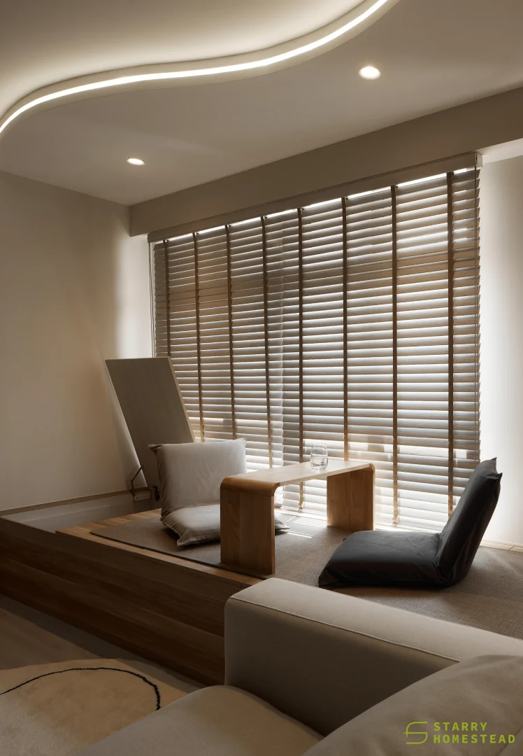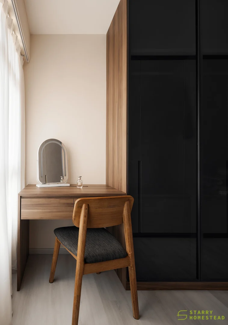 This home blends Modern Japandi design with Wabi-Sabi elements, creating a warm and cosy atmosphere. The resting area features a tatami platform, bringing a sense of Zen to daily living while also serving as a comfortable gathering spot, with clever storage hidden beneath the seating. To ensure privacy and convenience, two bedroom entrances were designed: a hidden door allows quiet access without disturbing a partner, while the secondary entrance near the dressing table provides an alternative route. Alongside the walkway, a full-height wardrobe maximises storage without interrupting the flow of the space. Every element is carefully considered to balance functionality with tranquillity, making the home both practical and serene.