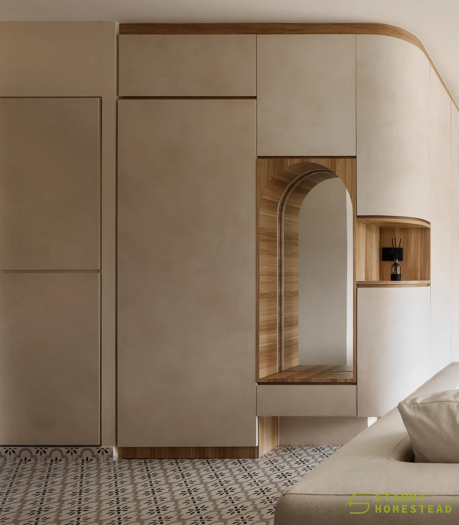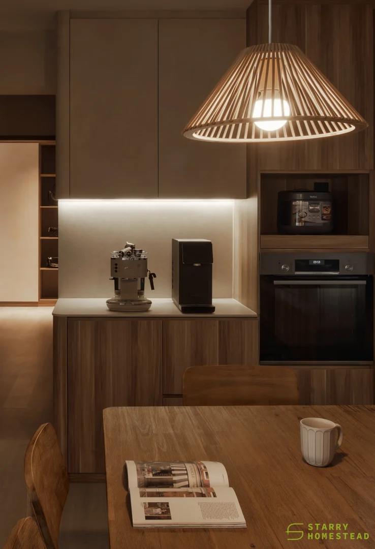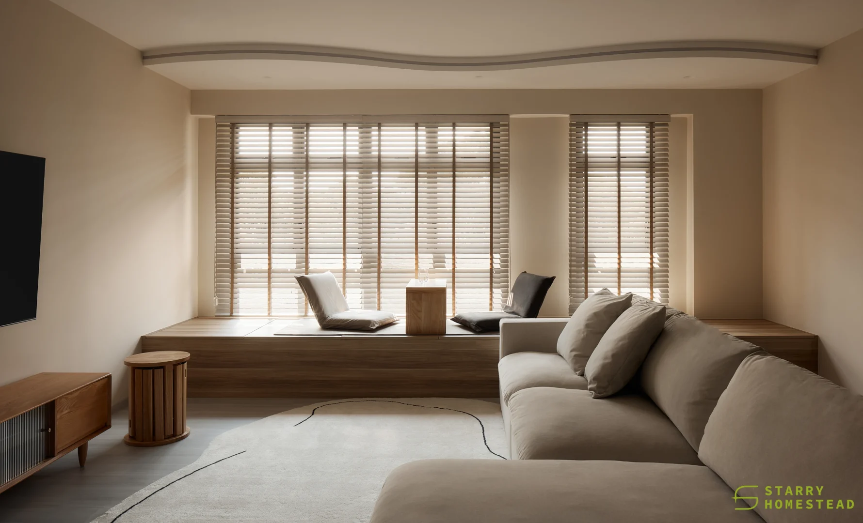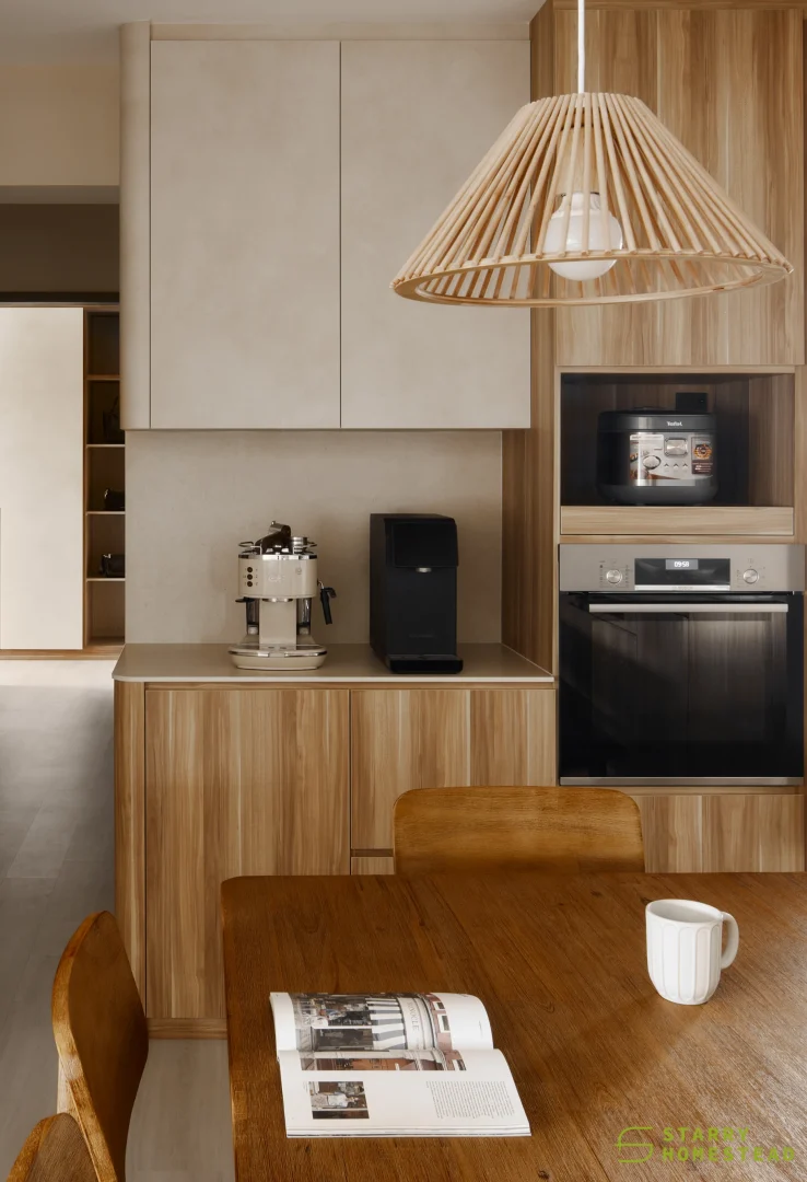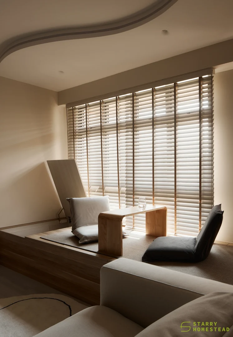 This home blends Modern Japandi design with Wabi-Sabi elements, creating a warm and cosy atmosphere. The resting area features a tatami platform, bringing a sense of Zen to daily living while also serving as a comfortable gathering spot, with clever storage hidden beneath the seating. To ensure privacy and convenience, two bedroom entrances were designed: a hidden door allows quiet access without disturbing a partner, while the secondary entrance near the dressing table provides an alternative route. Alongside the walkway, a full-height wardrobe maximises storage without interrupting the flow of the space. Every element is carefully considered to balance functionality with tranquillity, making the home both practical and serene.