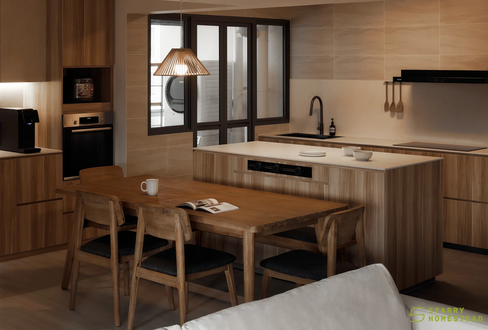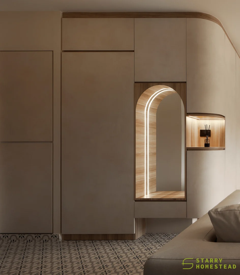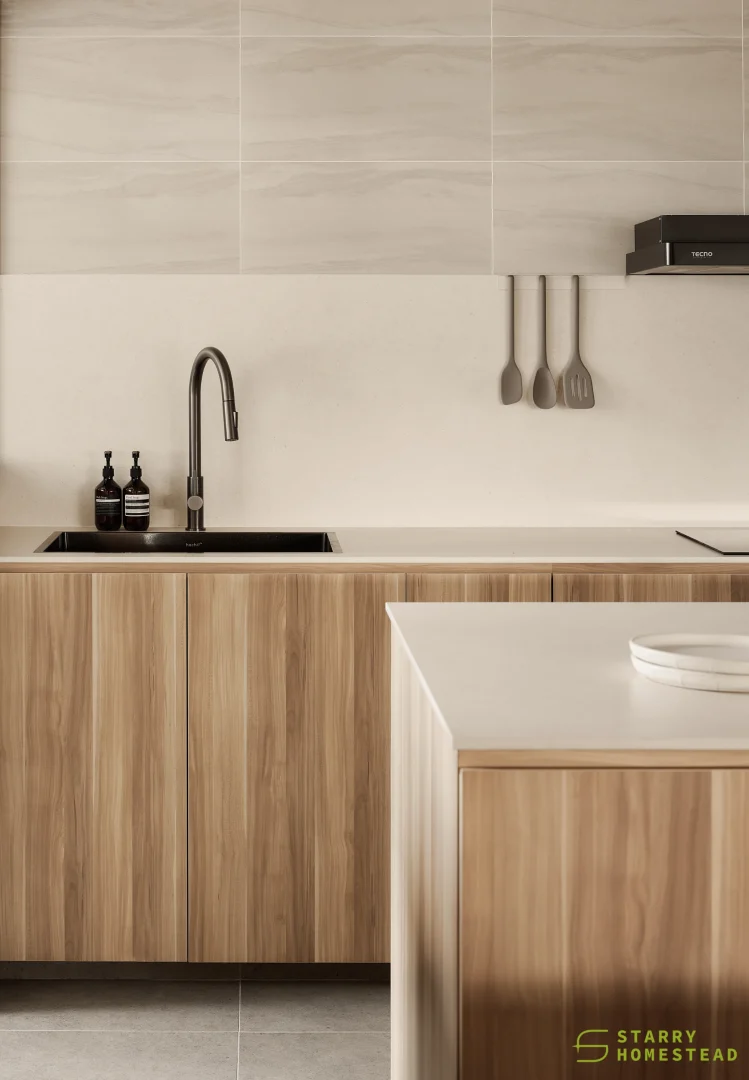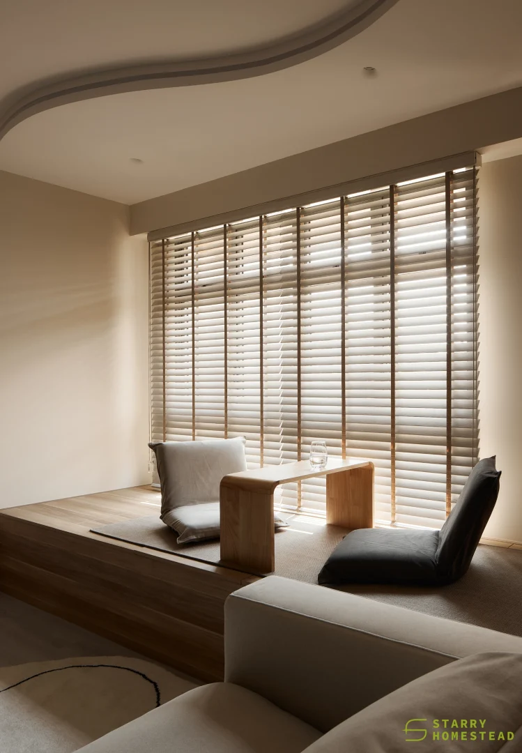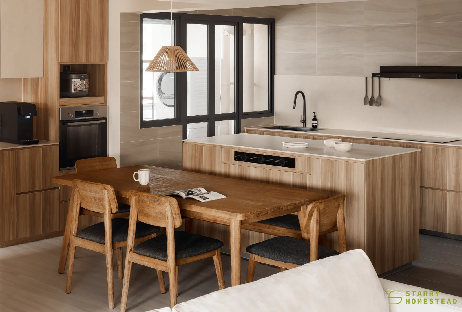 This home blends Modern Japandi design with Wabi-Sabi elements, creating a warm and cosy atmosphere. The resting area features a tatami platform, bringing a sense of Zen to daily living while also serving as a comfortable gathering spot, with clever storage hidden beneath the seating. To ensure privacy and convenience, two bedroom entrances were designed: a hidden door allows quiet access without disturbing a partner, while the secondary entrance near the dressing table provides an alternative route. Alongside the walkway, a full-height wardrobe maximises storage without interrupting the flow of the space. Every element is carefully considered to balance functionality with tranquillity, making the home both practical and serene.