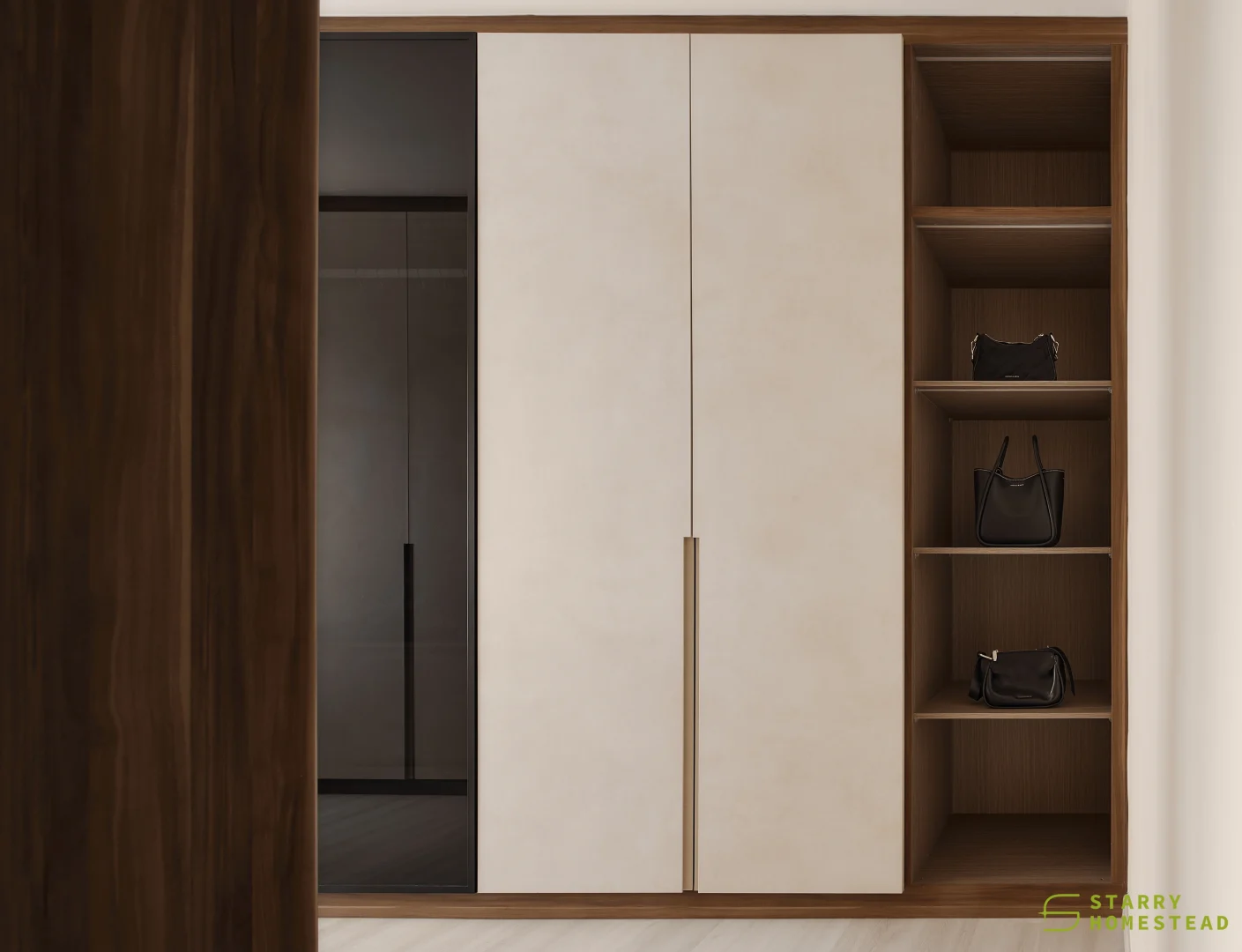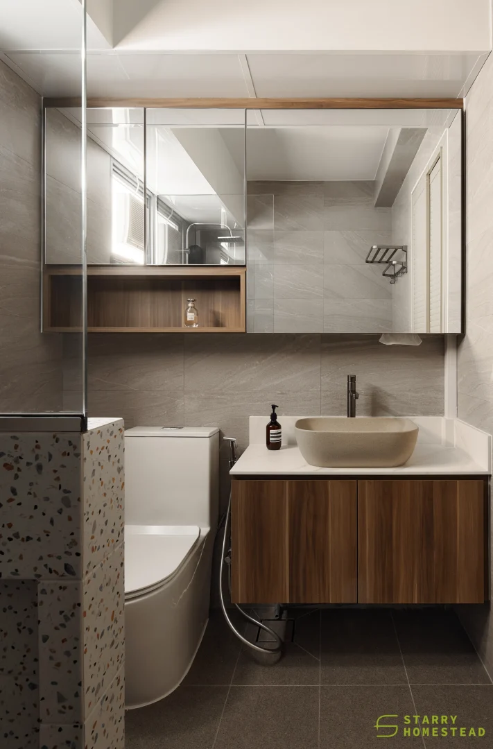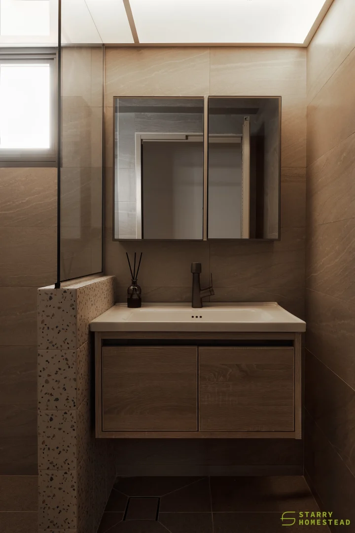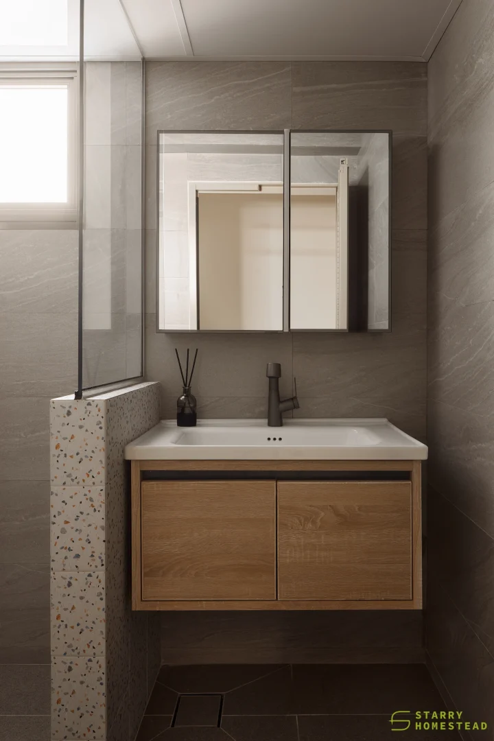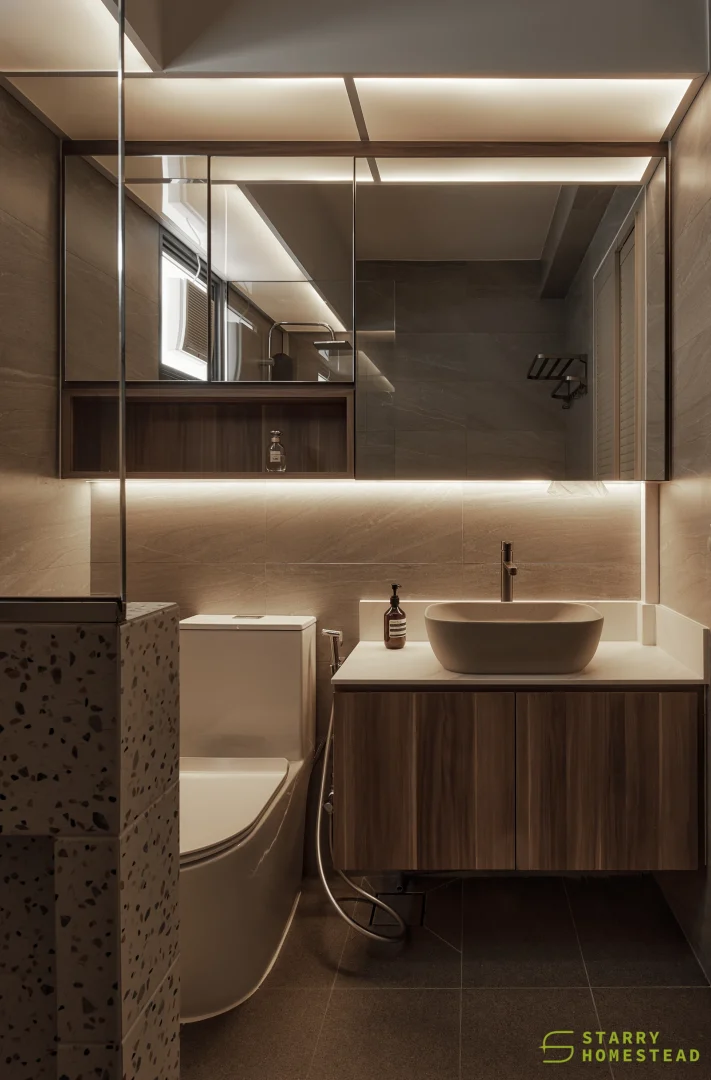 This home blends Modern Japandi design with Wabi-Sabi elements, creating a warm and cosy atmosphere. The resting area features a tatami platform, bringing a sense of Zen to daily living while also serving as a comfortable gathering spot, with clever storage hidden beneath the seating. To ensure privacy and convenience, two bedroom entrances were designed: a hidden door allows quiet access without disturbing a partner, while the secondary entrance near the dressing table provides an alternative route. Alongside the walkway, a full-height wardrobe maximises storage without interrupting the flow of the space. Every element is carefully considered to balance functionality with tranquillity, making the home both practical and serene.