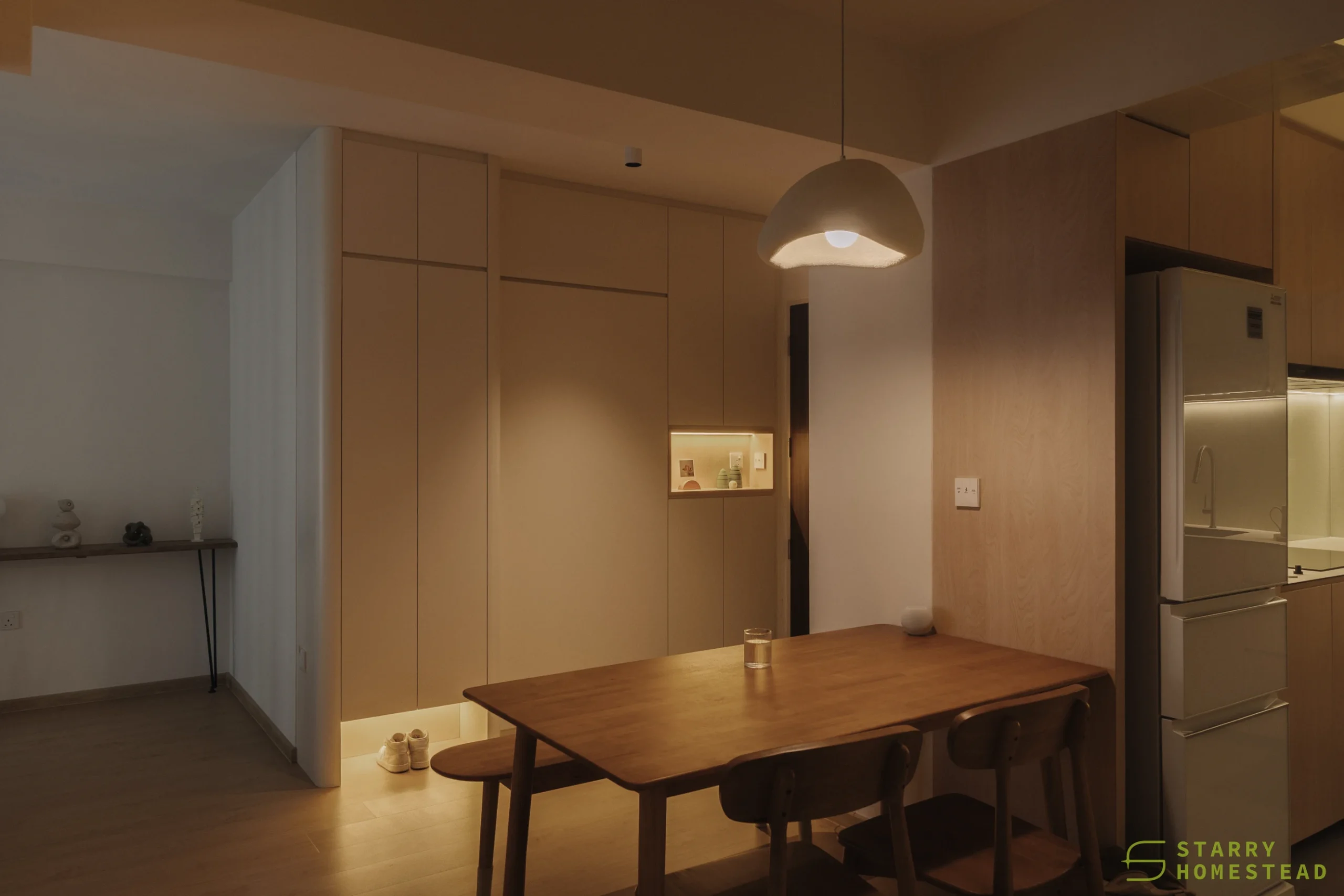 This 4-room BTO is styled in a creamy Muji aesthetic, featuring warm-toned vinyl flooring that sets a soft, calming foundation. The living area remains simple and relaxed, with gentle furnishings and a clean feature wall as the focal point. In the master bedroom, a floating bed with ambient LED lighting enhances the light, airy feel. The study pairs function with comfort, offering a built-in desk, a cosy daybed, and display cabinets. A dedicated yoga room provides a serene retreat for quiet reflection. The home radiates warmth and tranquillity—subtle, soothing, and effortlessly inviting.