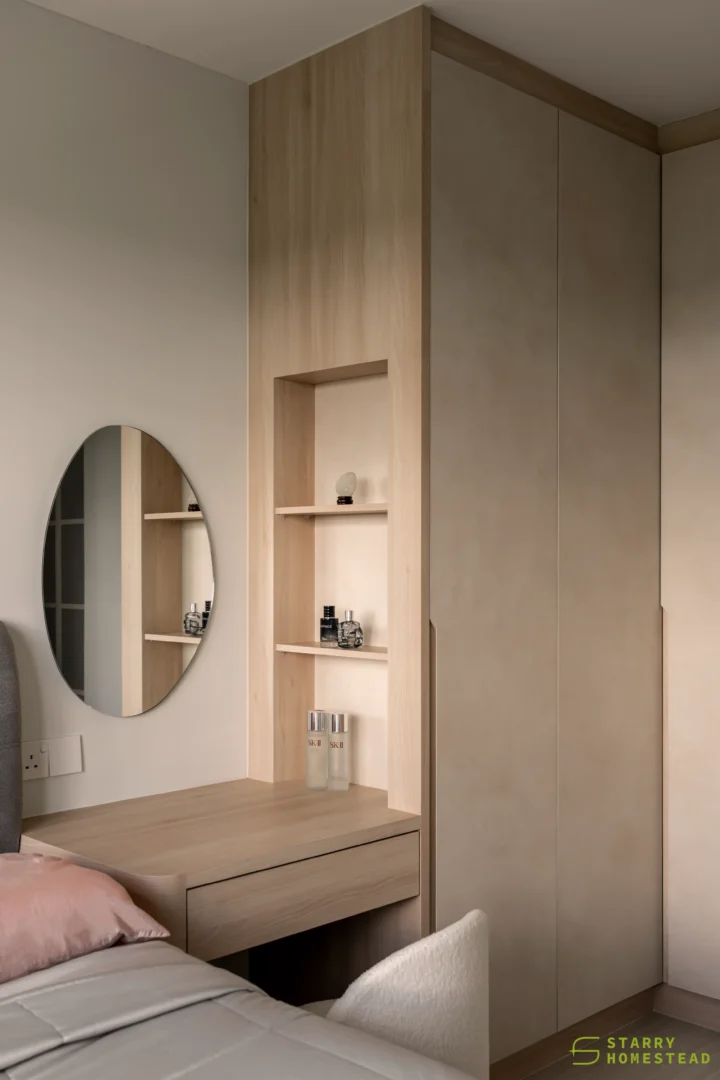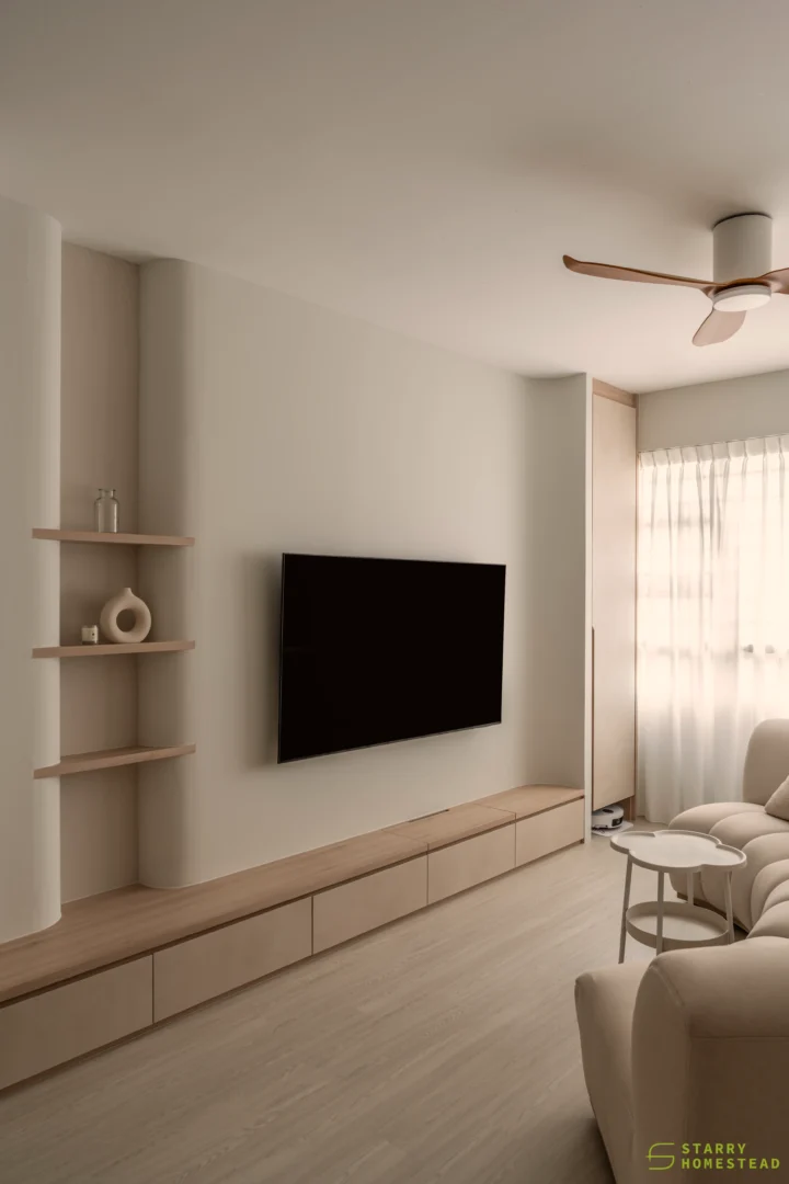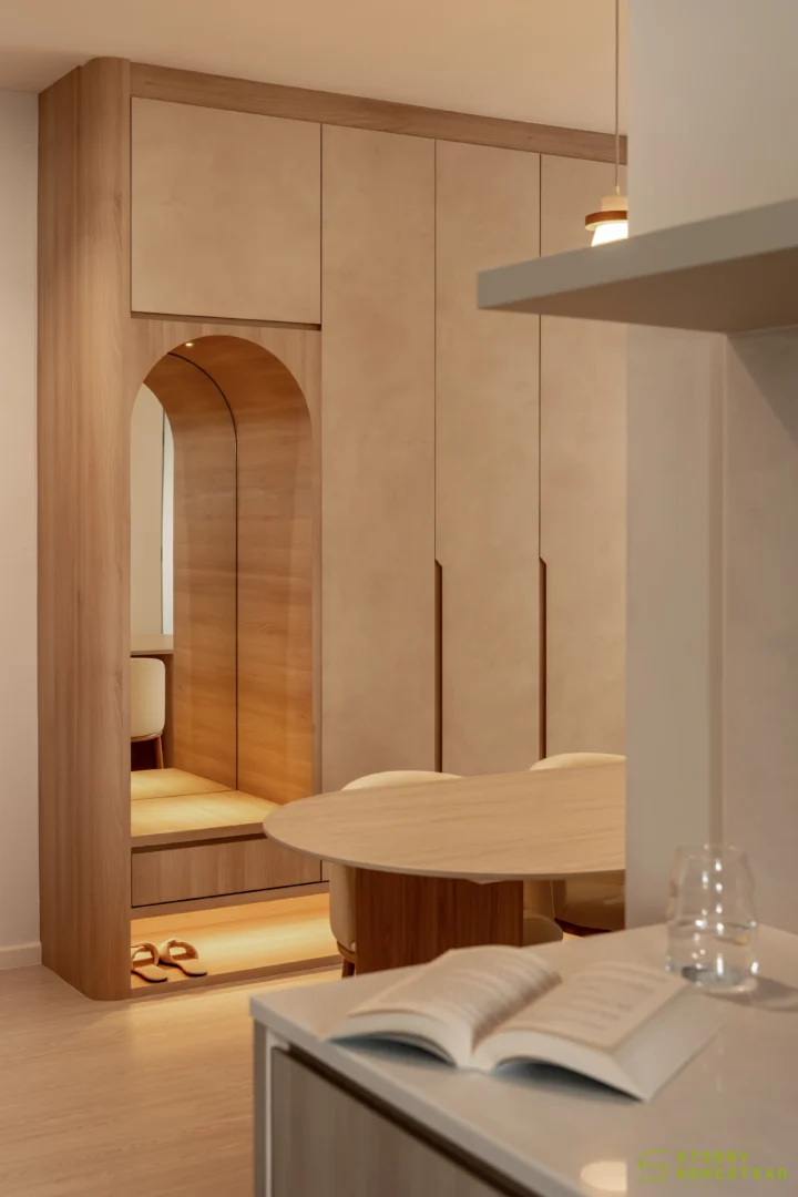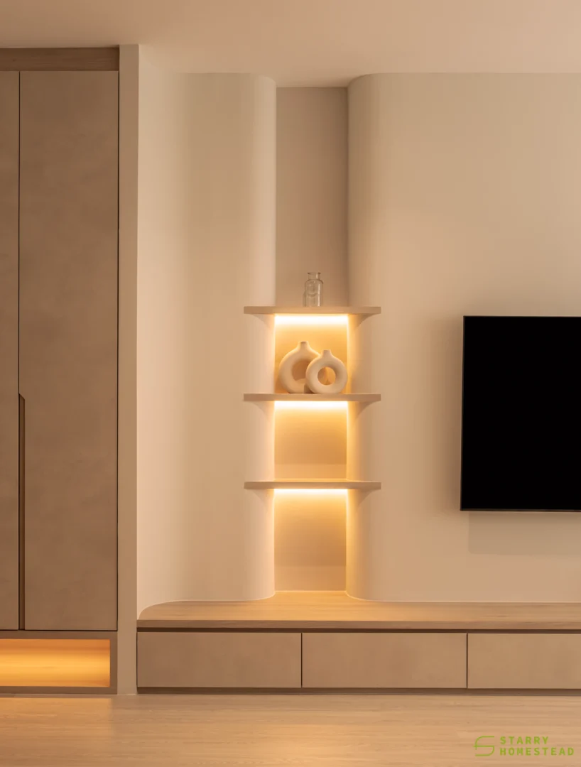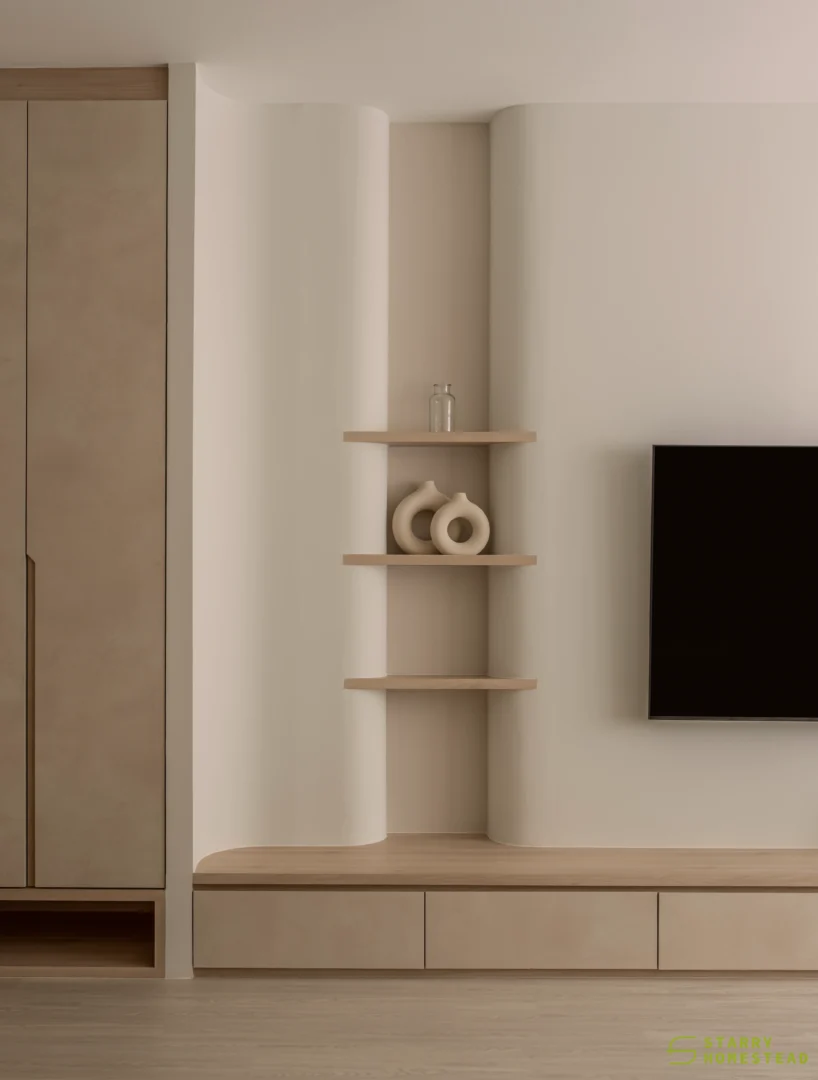 Designed in a Minimalist Creamy Scandinavian style, the space expresses a soft, understated elegance through warm neutral tones, clean lines, and a soothing visual rhythm. The overall mood feels light and welcoming, balancing refined simplicity with everyday functionality. A standout feature is the TV partition wall, where mirrored curved in-and-out forms add depth and a subtle sculptural presence. Open display shelves are elegantly integrated into this design, forming a natural focal point for decorative pieces. Within the foyer, the lower shelving is carefully planned for daily footwear, ensuring ease of use while maintaining a tidy appearance. Beside the master dressing table, an open shelving unit is thoughtfully shared with the wardrobe, creating a seamless and efficient storage layout. When the wardrobe door is opened, a partially boxed section appears on the left, while the open space on the right is perfectly suited for organising the owner’s bags.