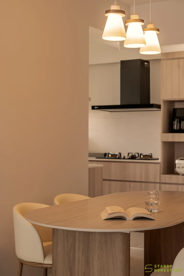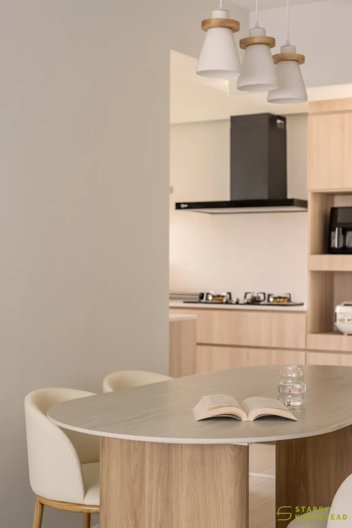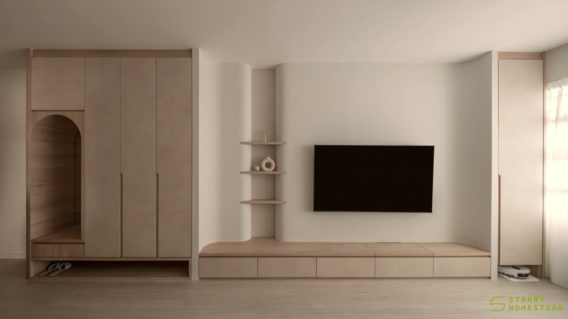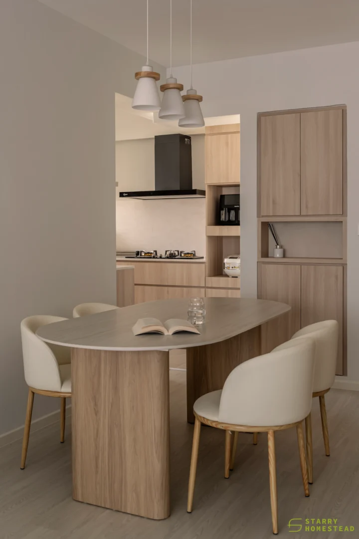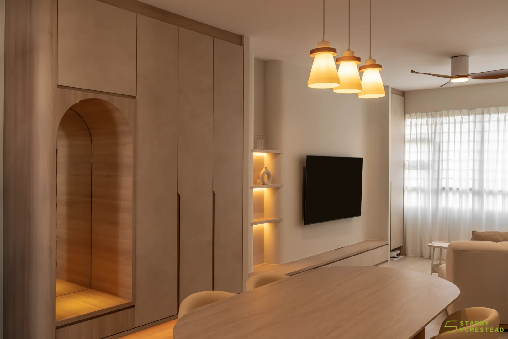 Designed in a Minimalist Creamy Scandinavian style, the space expresses a soft, understated elegance through warm neutral tones, clean lines, and a soothing visual rhythm. The overall mood feels light and welcoming, balancing refined simplicity with everyday functionality. A standout feature is the TV partition wall, where mirrored curved in-and-out forms add depth and a subtle sculptural presence. Open display shelves are elegantly integrated into this design, forming a natural focal point for decorative pieces. Within the foyer, the lower shelving is carefully planned for daily footwear, ensuring ease of use while maintaining a tidy appearance. Beside the master dressing table, an open shelving unit is thoughtfully shared with the wardrobe, creating a seamless and efficient storage layout. When the wardrobe door is opened, a partially boxed section appears on the left, while the open space on the right is perfectly suited for organising the owner’s bags.
