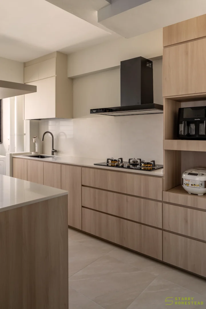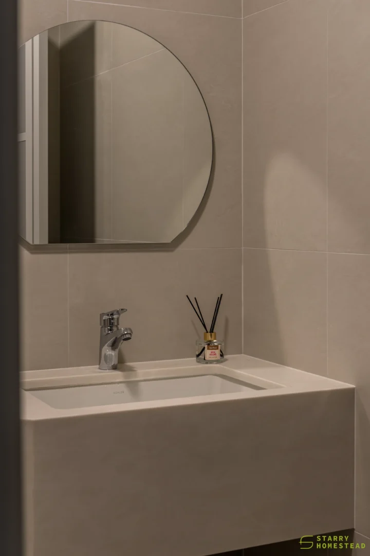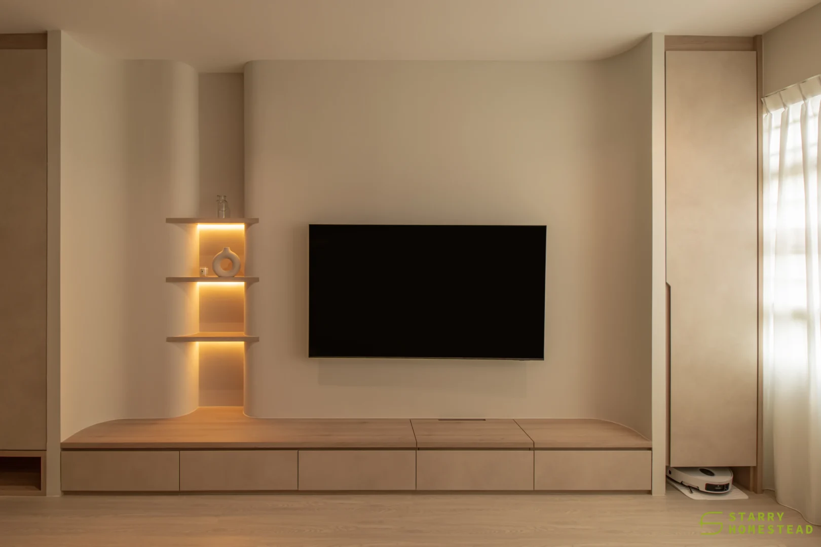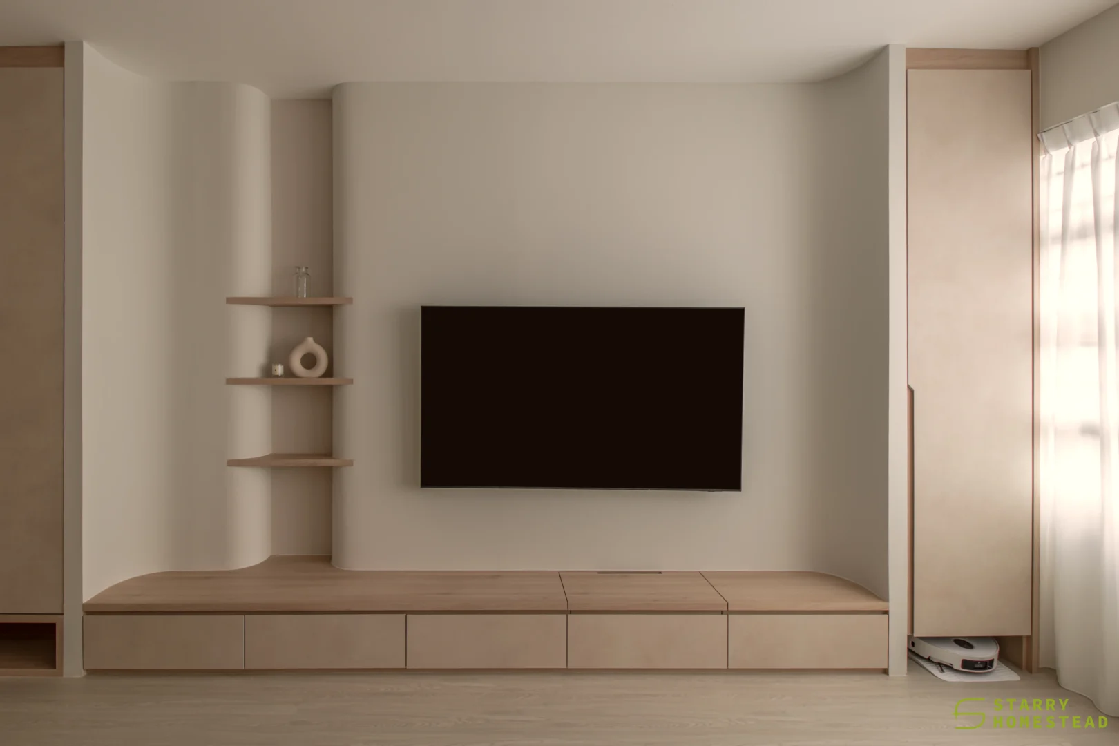 Designed in a Minimalist Creamy Scandinavian style, the space expresses a soft, understated elegance through warm neutral tones, clean lines, and a soothing visual rhythm. The overall mood feels light and welcoming, balancing refined simplicity with everyday functionality. A standout feature is the TV partition wall, where mirrored curved in-and-out forms add depth and a subtle sculptural presence. Open display shelves are elegantly integrated into this design, forming a natural focal point for decorative pieces. Within the foyer, the lower shelving is carefully planned for daily footwear, ensuring ease of use while maintaining a tidy appearance. Beside the master dressing table, an open shelving unit is thoughtfully shared with the wardrobe, creating a seamless and efficient storage layout. When the wardrobe door is opened, a partially boxed section appears on the left, while the open space on the right is perfectly suited for organising the owner’s bags.
