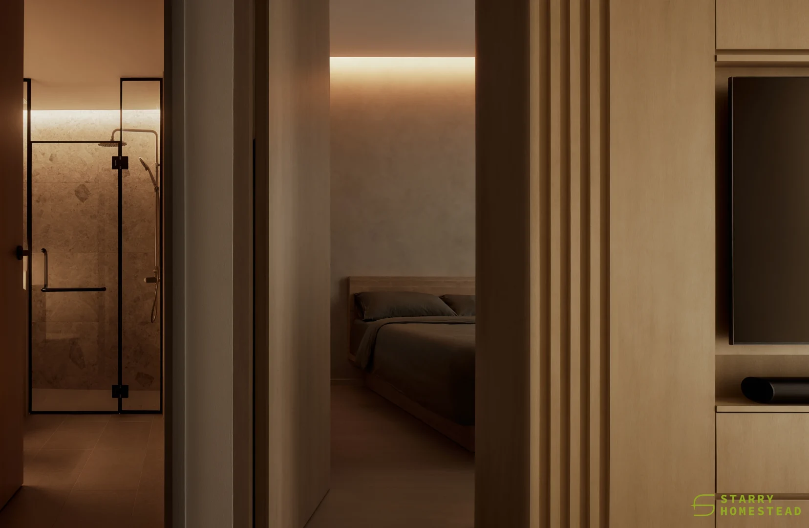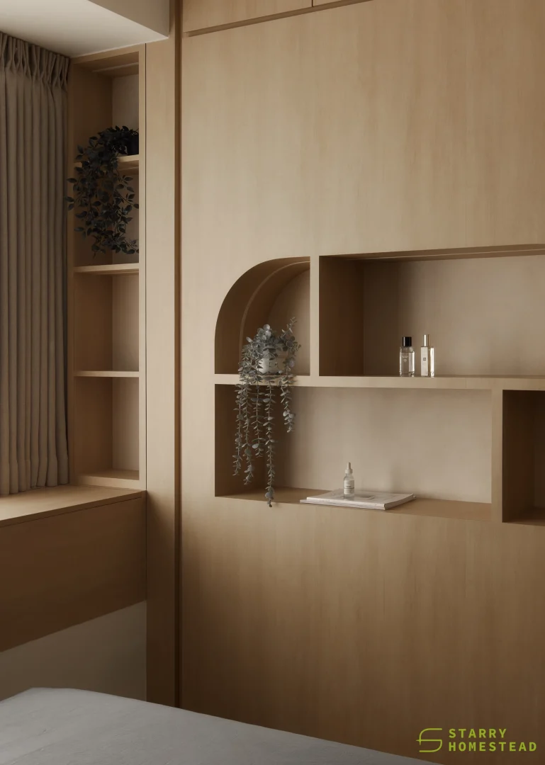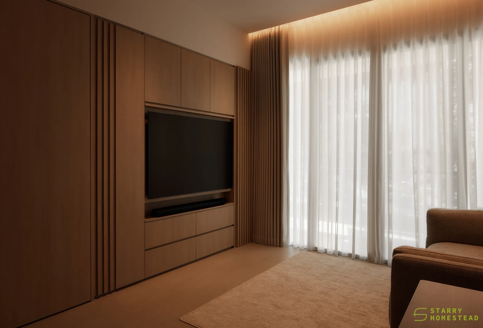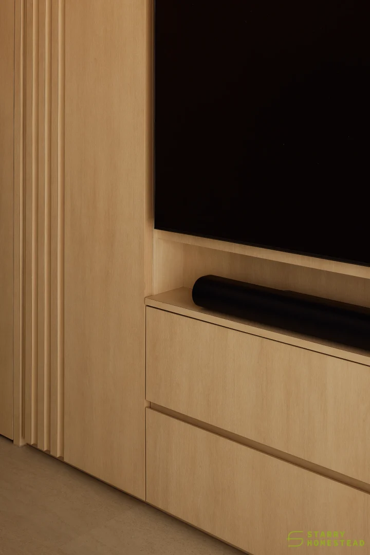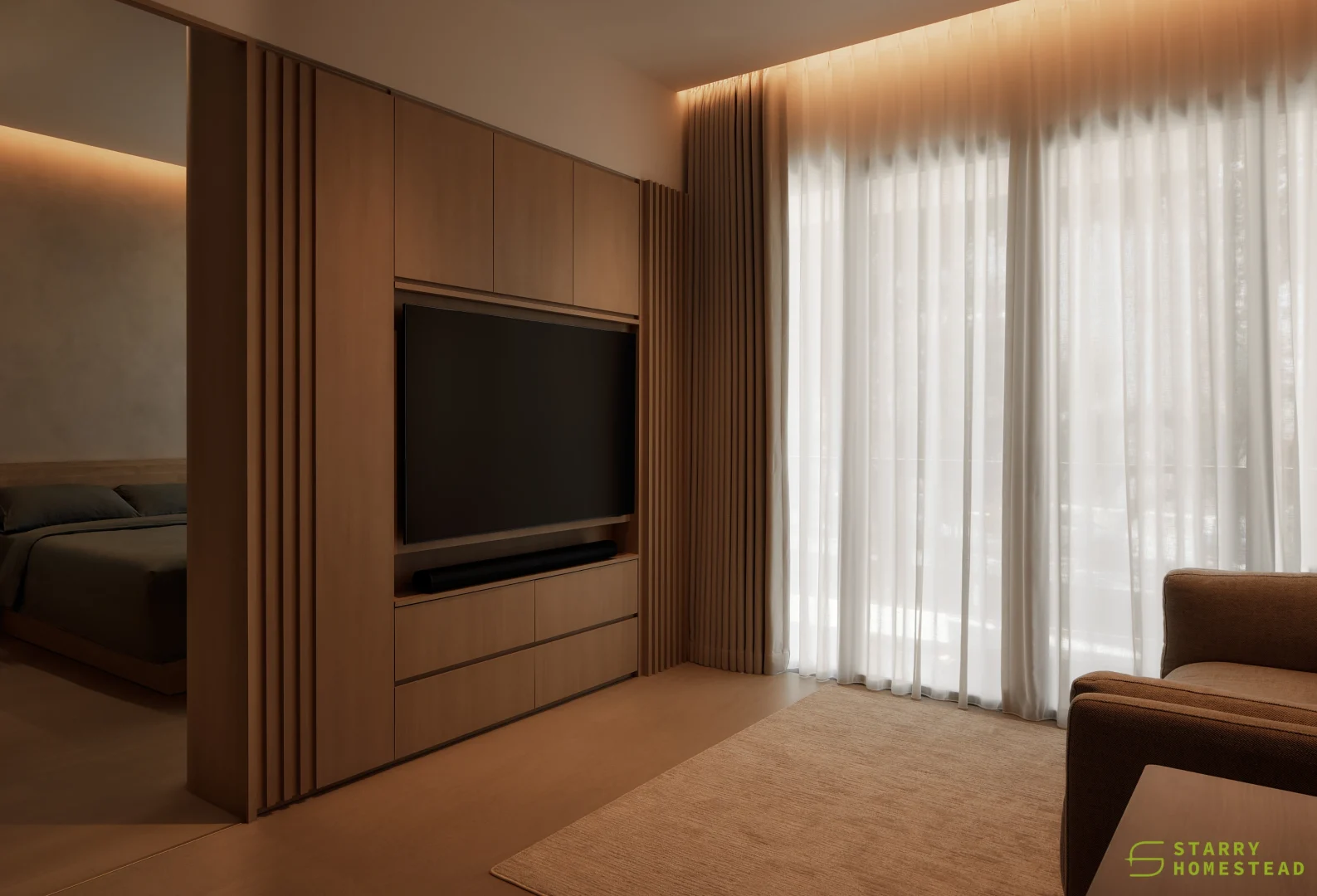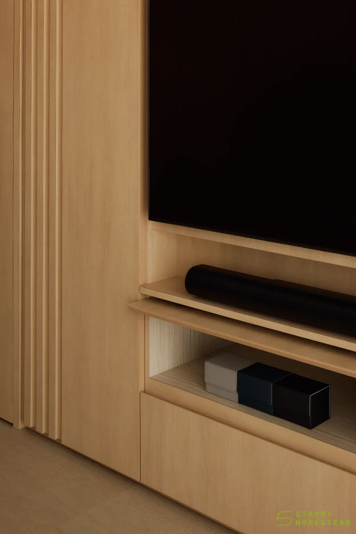 This Japandi-inspired home celebrates natural wood textures paired with warm lighting to create a serene and welcoming atmosphere. A standout feature is the multi-functional room divider, designed as a sleek TV wall facing the living room while providing clever storage for the bedroom. The original open layout allowed direct access from the living room into the bedroom, but this new divider introduces a greater sense of privacy without fully enclosing the space. It acts as both a practical and aesthetic partition, improving spatial zoning and the overall flow. Even in a compact home, thoughtful design ensures ample storage without compromising style or comfort.