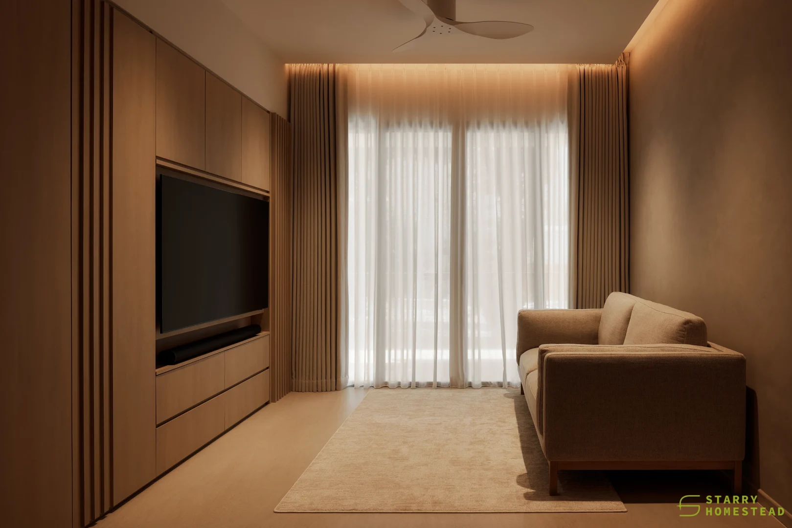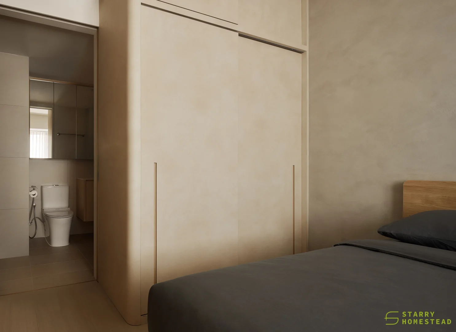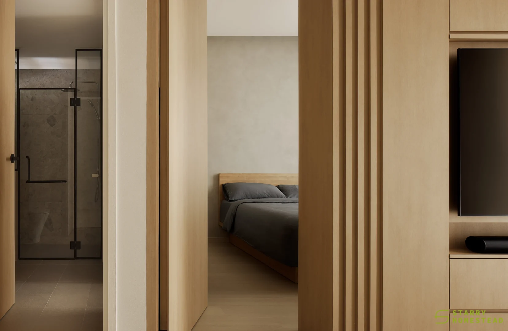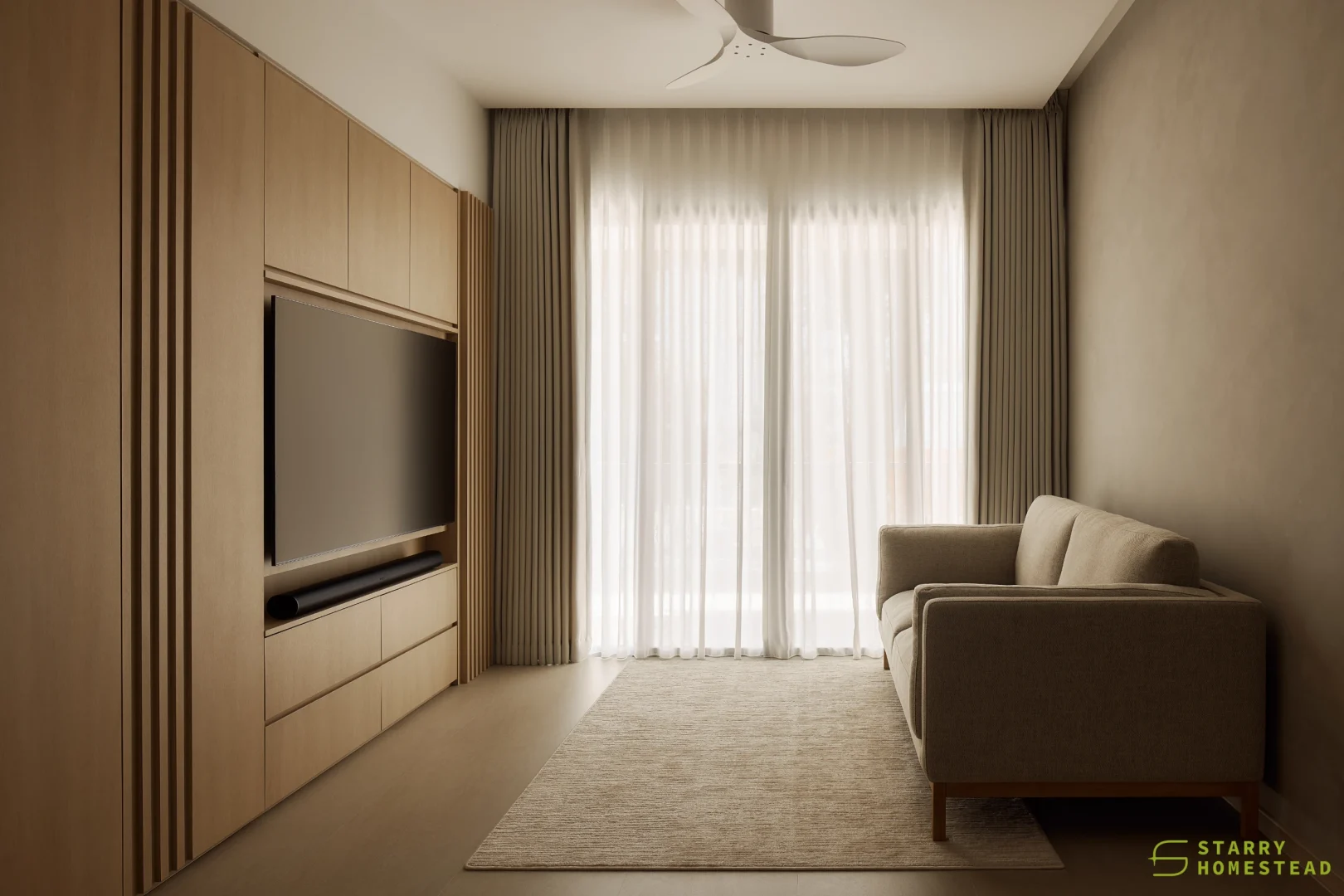 This Japandi-inspired home celebrates natural wood textures paired with warm lighting to create a serene and welcoming atmosphere. A standout feature is the multi-functional room divider, designed as a sleek TV wall facing the living room while providing clever storage for the bedroom. The original open layout allowed direct access from the living room into the bedroom, but this new divider introduces a greater sense of privacy without fully enclosing the space. It acts as both a practical and aesthetic partition, improving spatial zoning and the overall flow. Even in a compact home, thoughtful design ensures ample storage without compromising style or comfort.