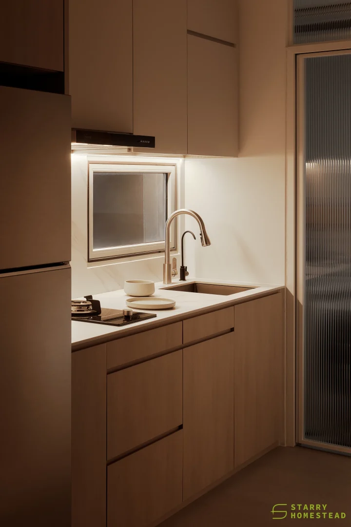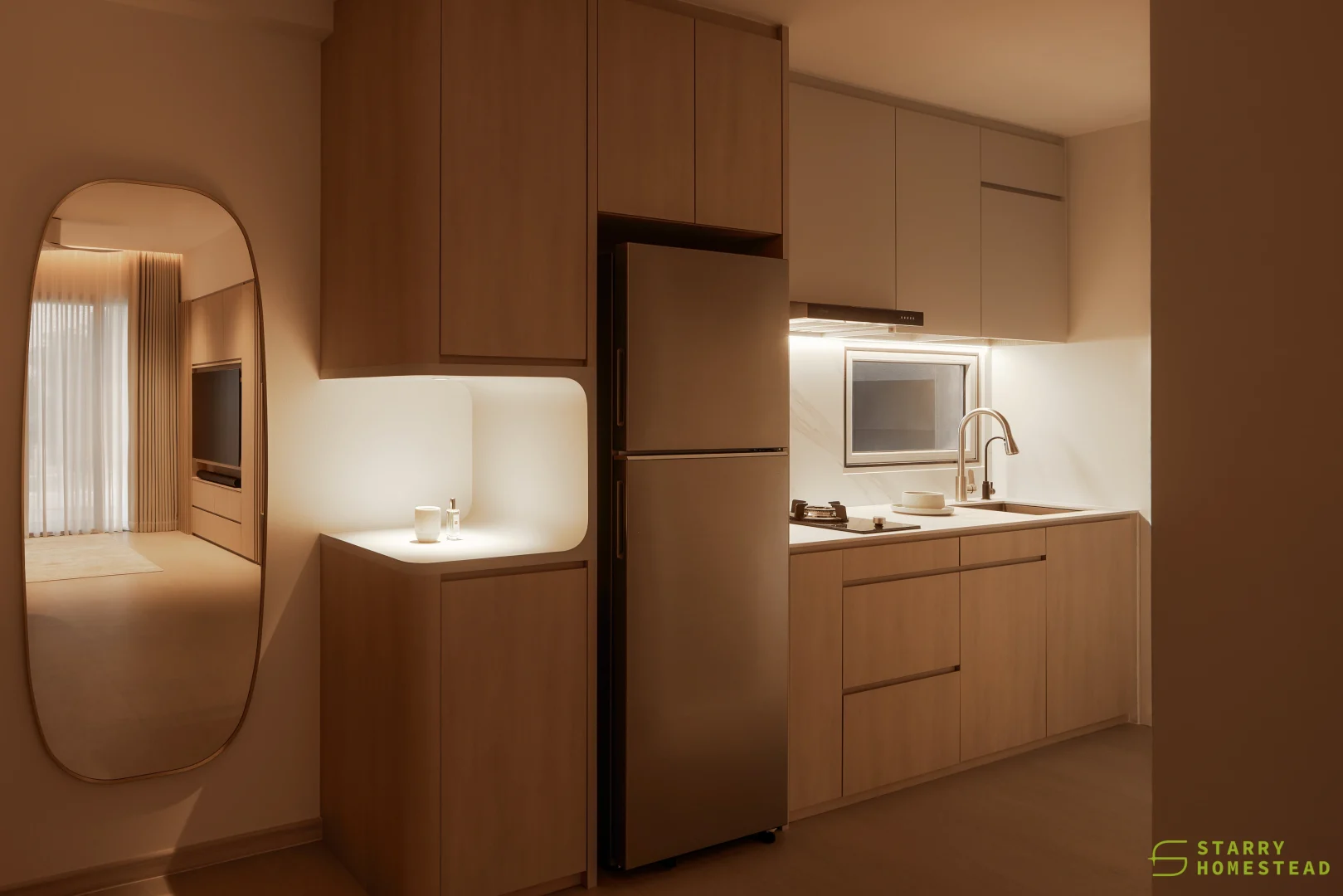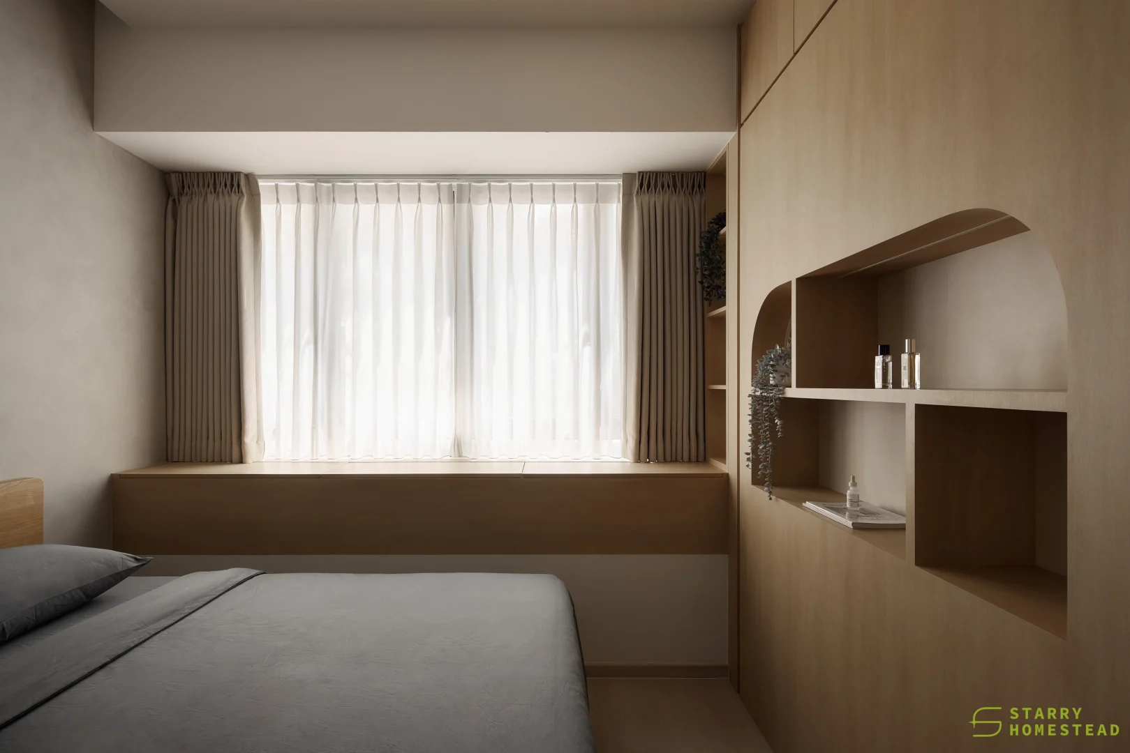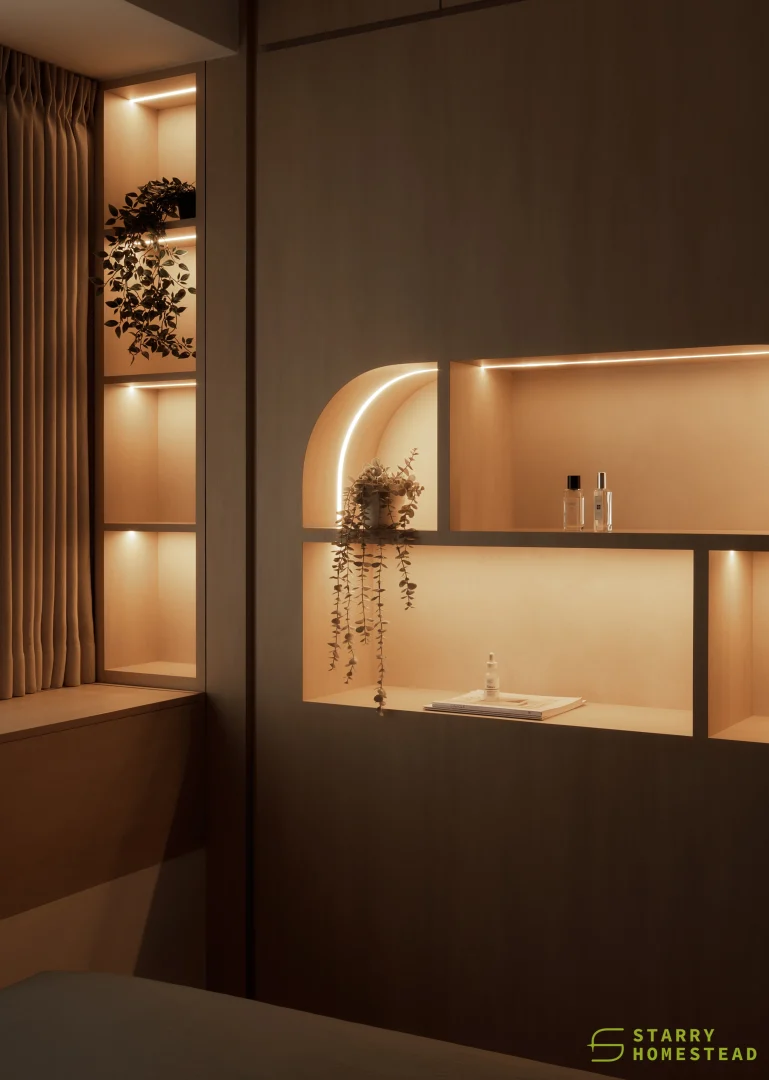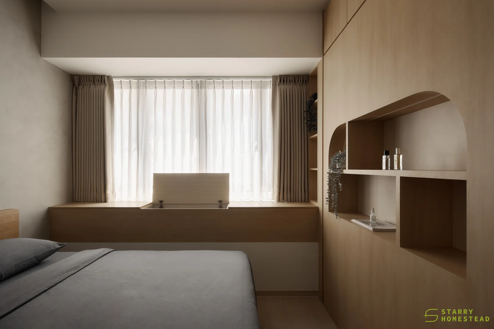 This Japandi-inspired home celebrates natural wood textures paired with warm lighting to create a serene and welcoming atmosphere. A standout feature is the multi-functional room divider, designed as a sleek TV wall facing the living room while providing clever storage for the bedroom. The original open layout allowed direct access from the living room into the bedroom, but this new divider introduces a greater sense of privacy without fully enclosing the space. It acts as both a practical and aesthetic partition, improving spatial zoning and the overall flow. Even in a compact home, thoughtful design ensures ample storage without compromising style or comfort.