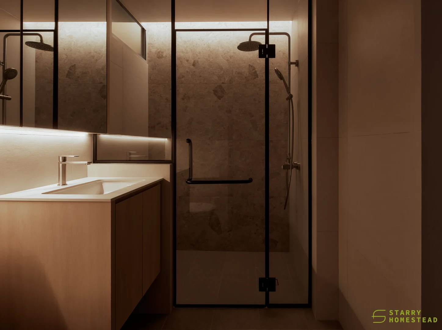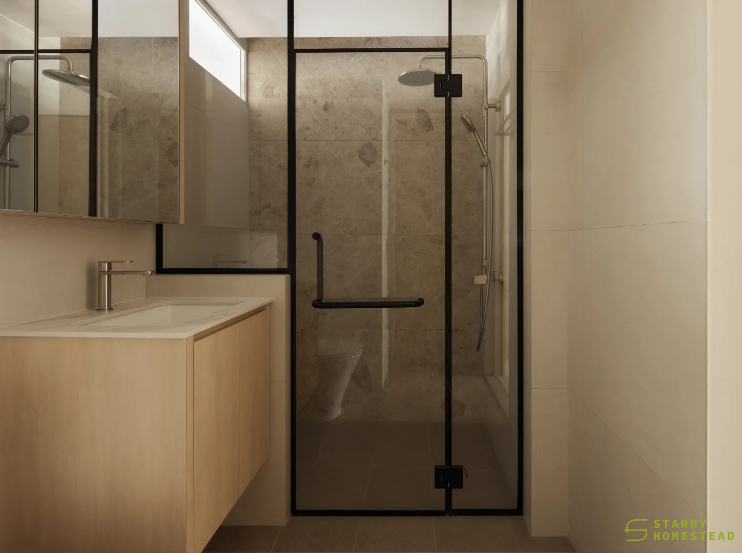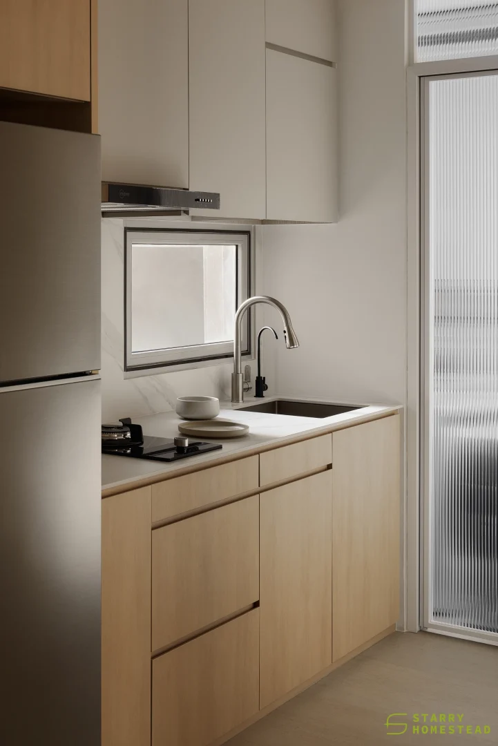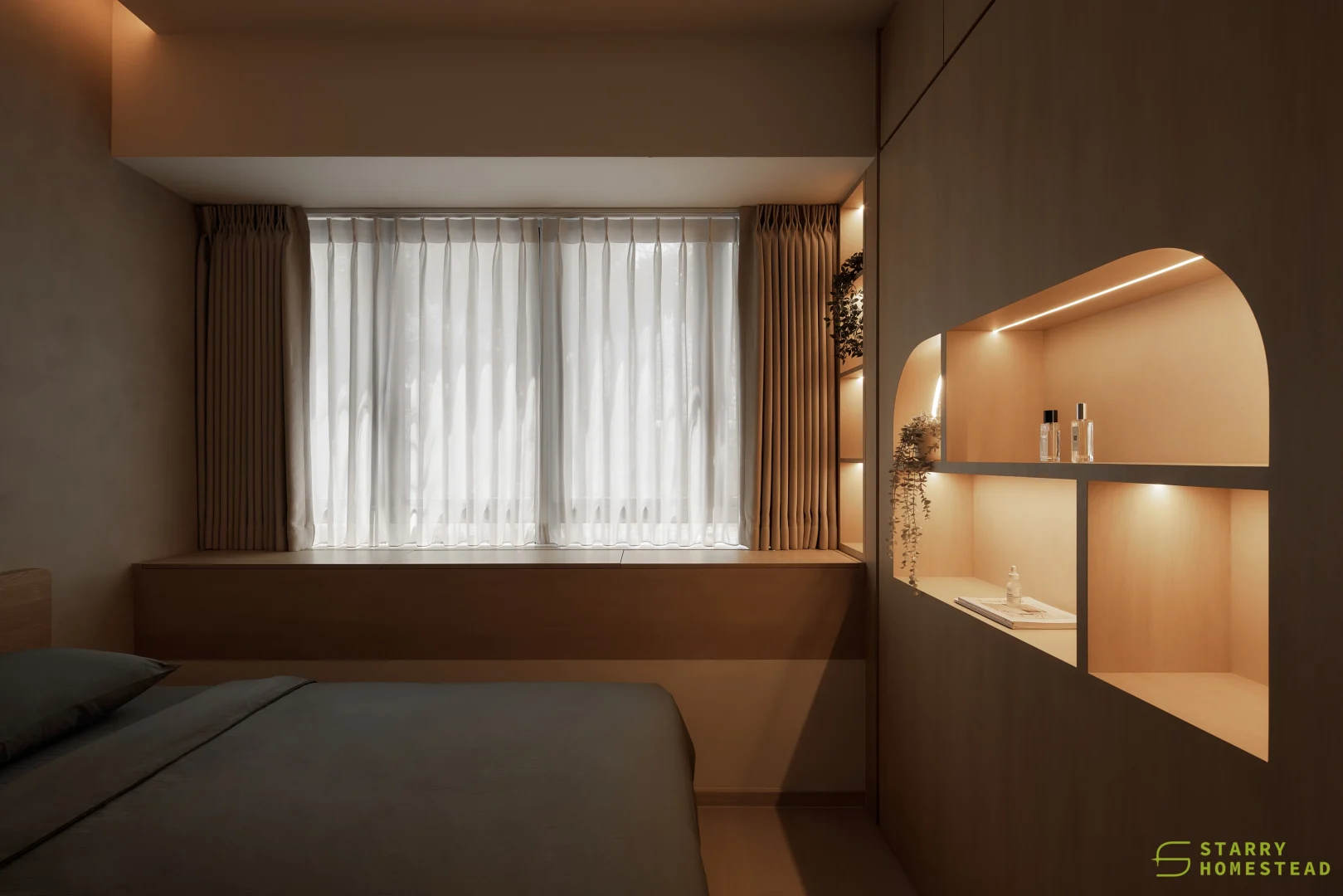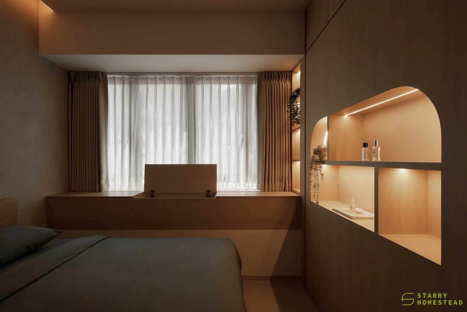 This Japandi-inspired home celebrates natural wood textures paired with warm lighting to create a serene and welcoming atmosphere. A standout feature is the multi-functional room divider, designed as a sleek TV wall facing the living room while providing clever storage for the bedroom. The original open layout allowed direct access from the living room into the bedroom, but this new divider introduces a greater sense of privacy without fully enclosing the space. It acts as both a practical and aesthetic partition, improving spatial zoning and the overall flow. Even in a compact home, thoughtful design ensures ample storage without compromising style or comfort.