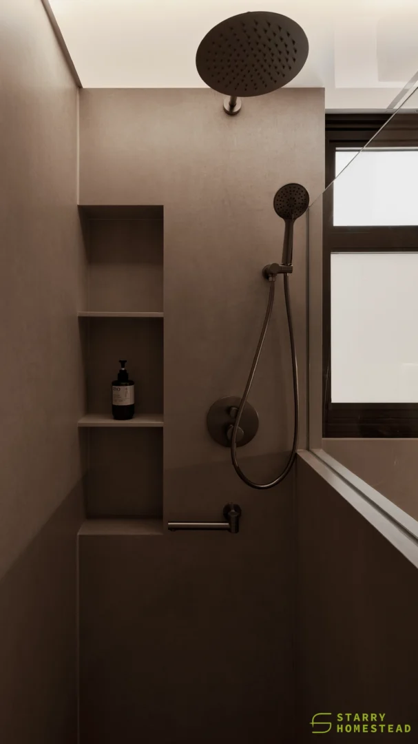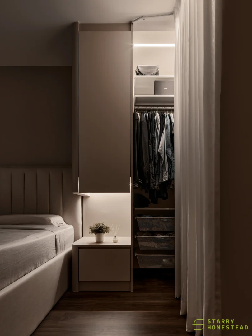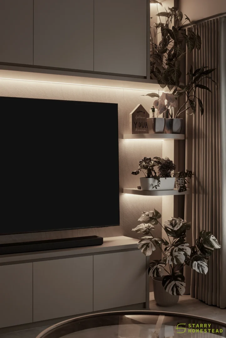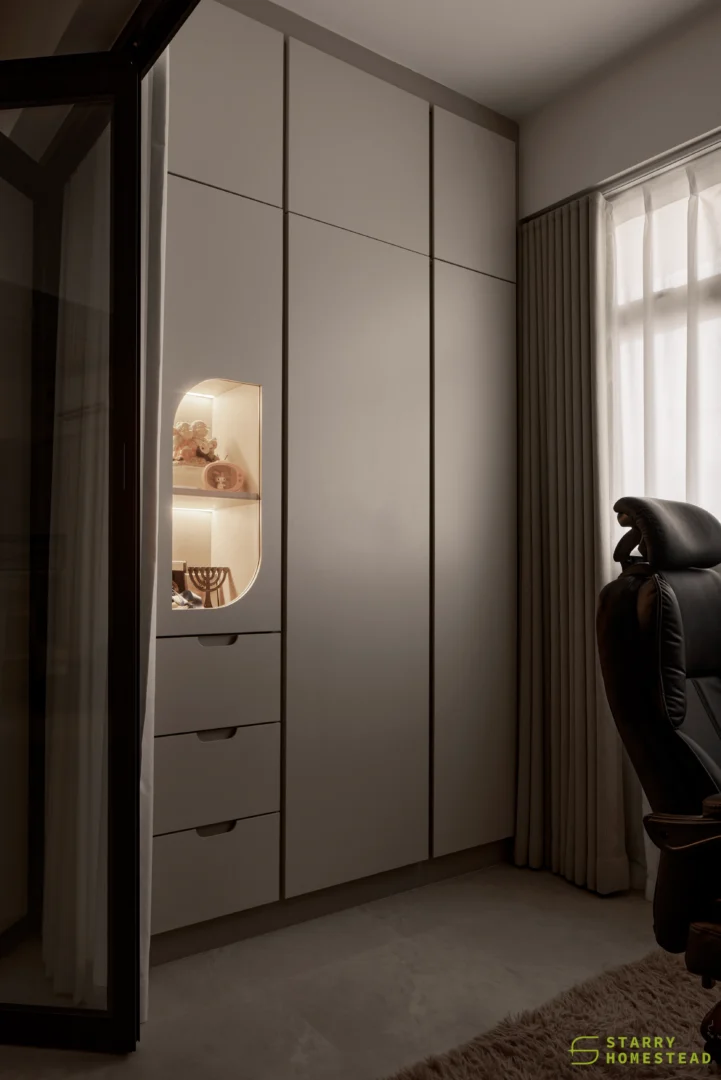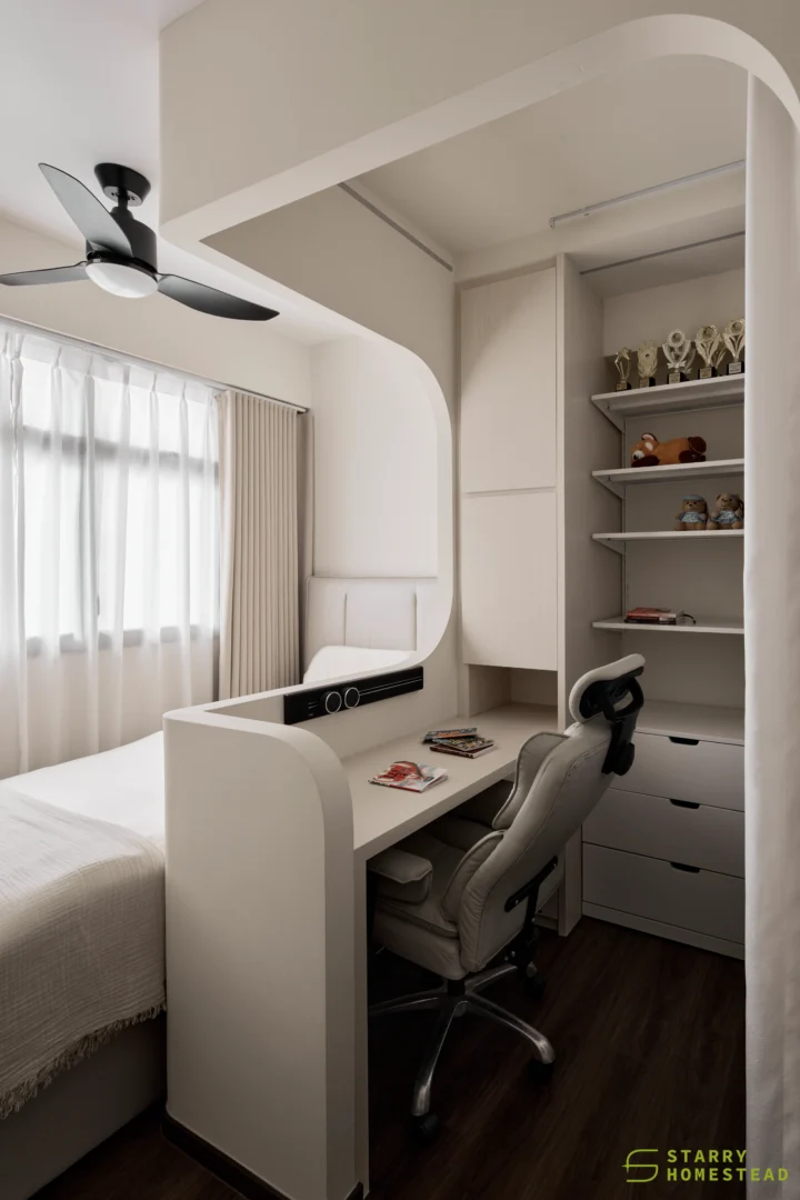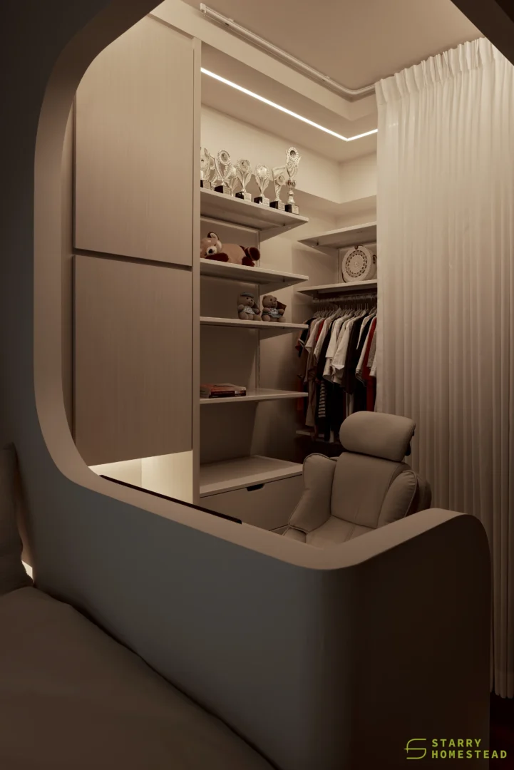 The design is anchored by a soothing palette of warm beige, which serves as the primary theme for all surfaces and finishes throughout the space. Beside the television, curved shelving units are dedicated specifically to greenery, bringing a refreshing touch of nature into the neutral living area. This signature curved motif flows gracefully into the master and common bedrooms, where the wardrobe areas are reimagined as intimate, integrated “cave” designs. These wardrobes feature an open-concept layout for flexible organisation, paired with elegant curtains to protect privacy and soften the visual aesthetic. Within the common bedroom, this cave structure cleverly incorporates a built-in study, effectively separating the workspace from the resting area. By combining these organic shapes with a monochromatic colour scheme, the project achieves a sophisticated yet tranquil atmosphere. Every detail reflects a commitment to fluid architecture, ensuring the home feels both interconnected and purposefully zoned.