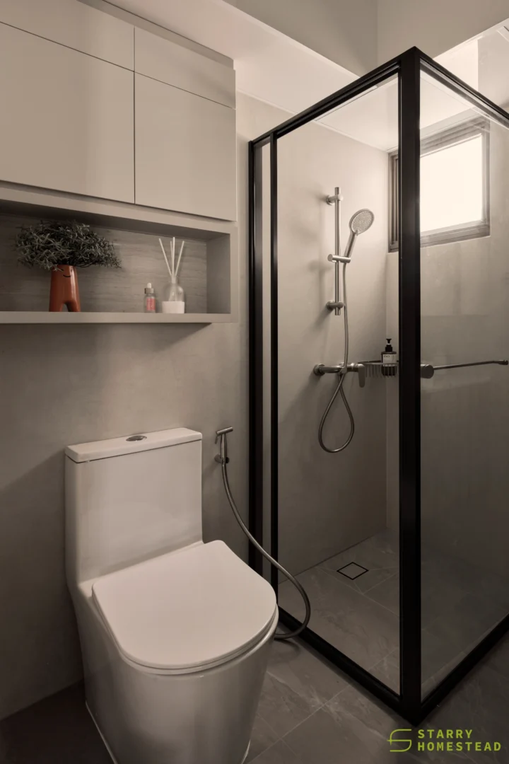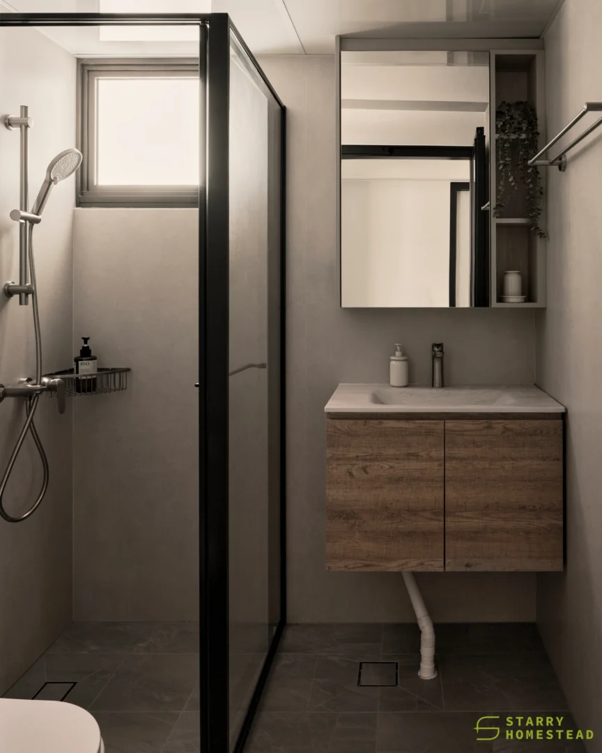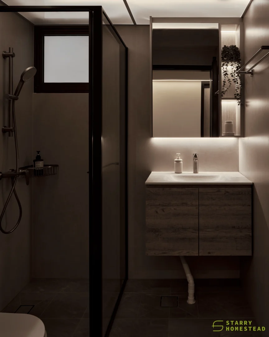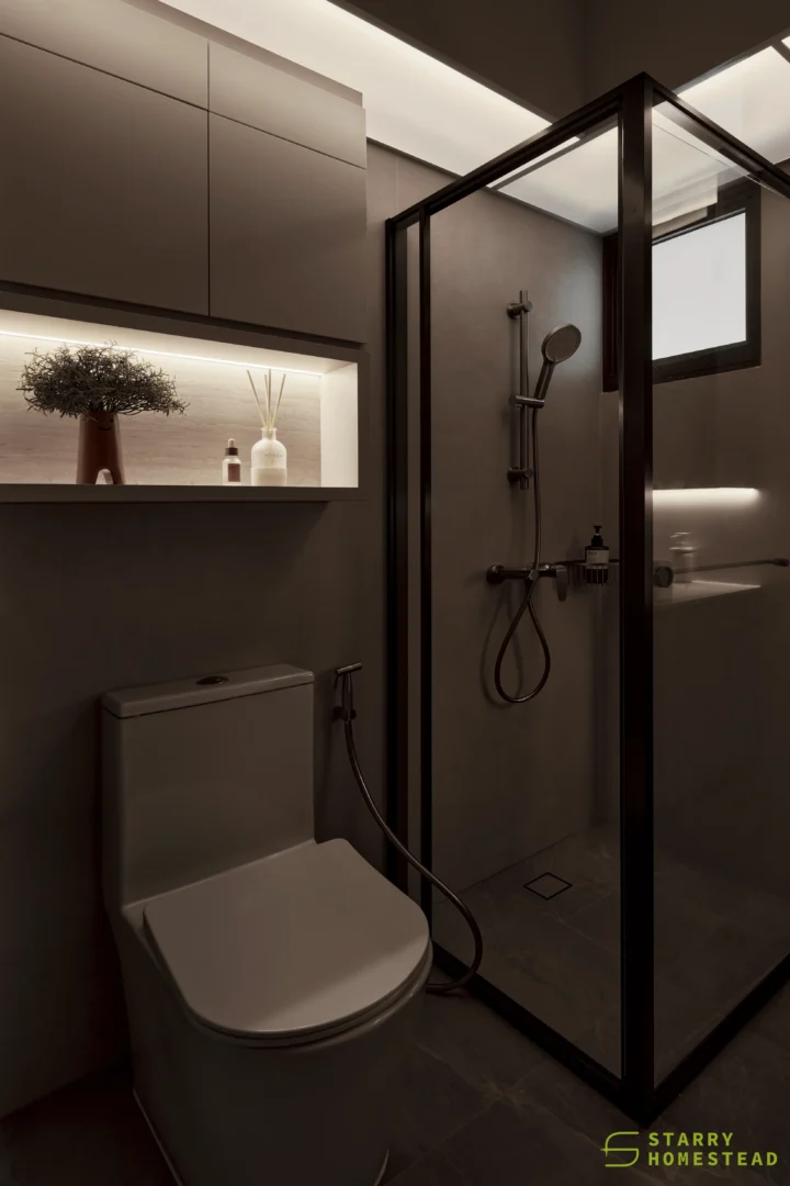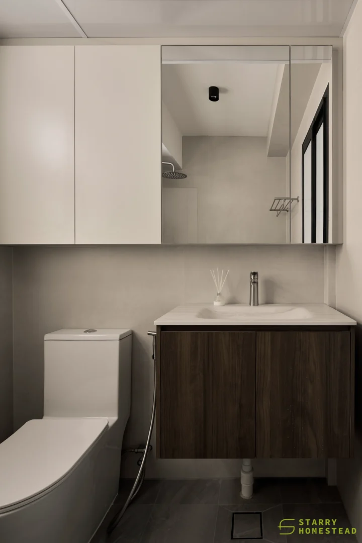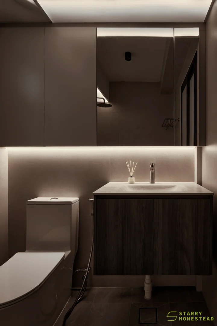 The design is anchored by a soothing palette of warm beige, which serves as the primary theme for all surfaces and finishes throughout the space. Beside the television, curved shelving units are dedicated specifically to greenery, bringing a refreshing touch of nature into the neutral living area. This signature curved motif flows gracefully into the master and common bedrooms, where the wardrobe areas are reimagined as intimate, integrated “cave” designs. These wardrobes feature an open-concept layout for flexible organisation, paired with elegant curtains to protect privacy and soften the visual aesthetic. Within the common bedroom, this cave structure cleverly incorporates a built-in study, effectively separating the workspace from the resting area. By combining these organic shapes with a monochromatic colour scheme, the project achieves a sophisticated yet tranquil atmosphere. Every detail reflects a commitment to fluid architecture, ensuring the home feels both interconnected and purposefully zoned.